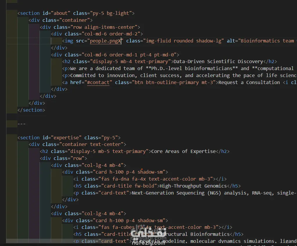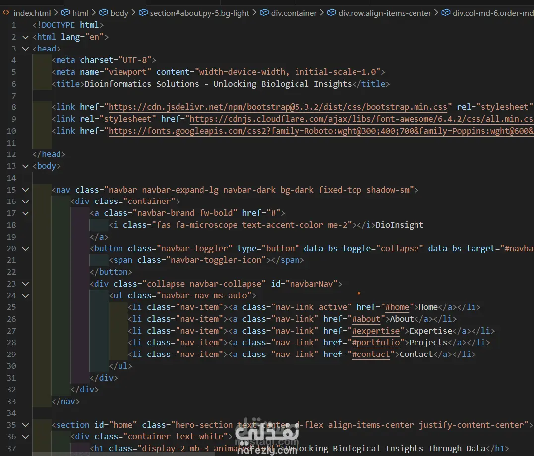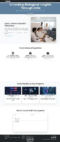 تم تنفيذ صفحة هبوط كاملة لشركة تعمل في مجال الـBioinformatics وعلوم البيانات الحيوية، بهدف عرض حلولها المتقدمة في تحليل الجينوم، النمذجة البروتينية، والذكاء الاصطناعي في البيولوجيا.