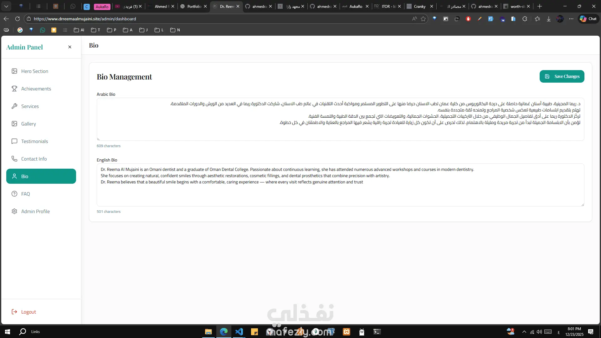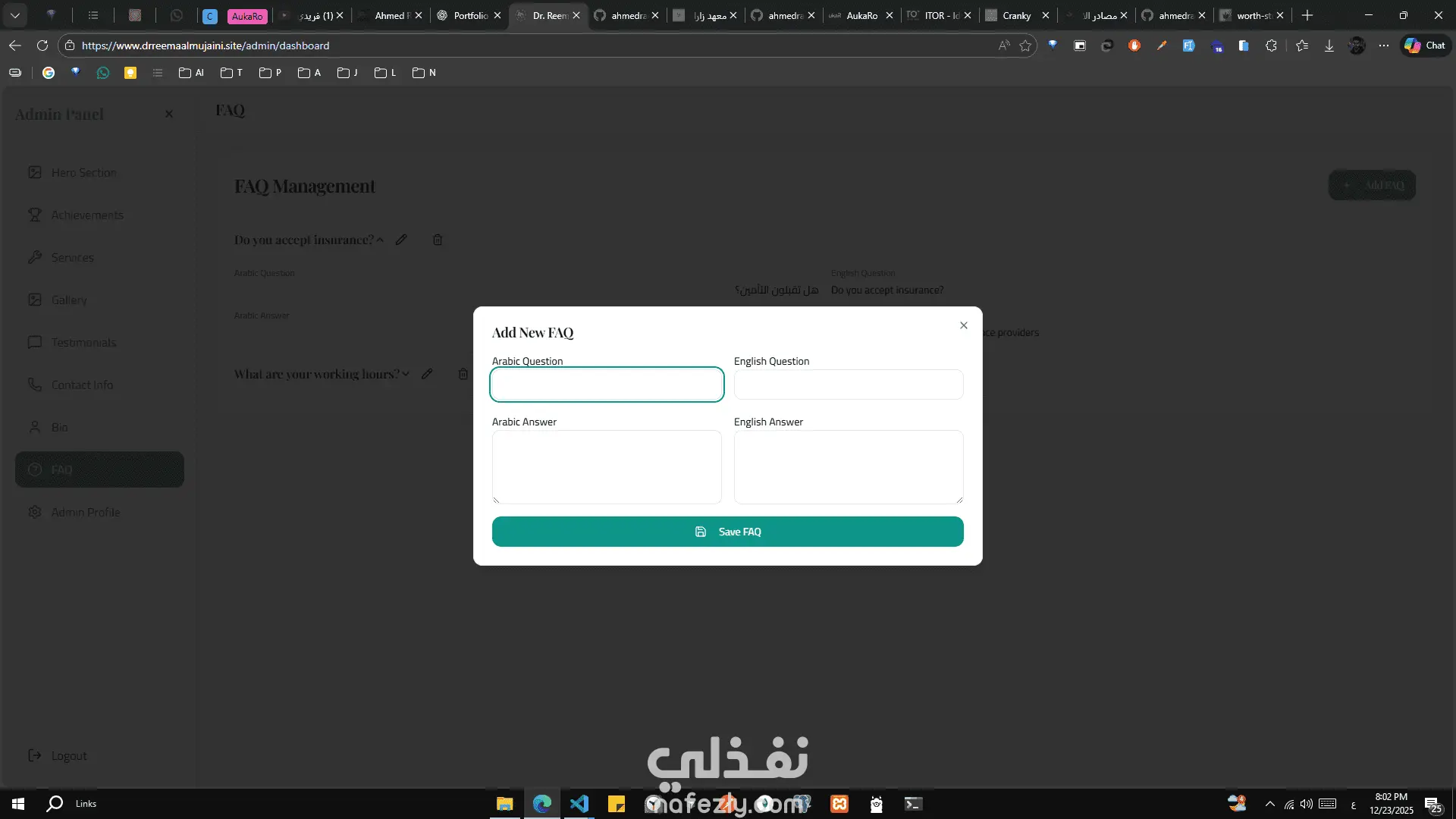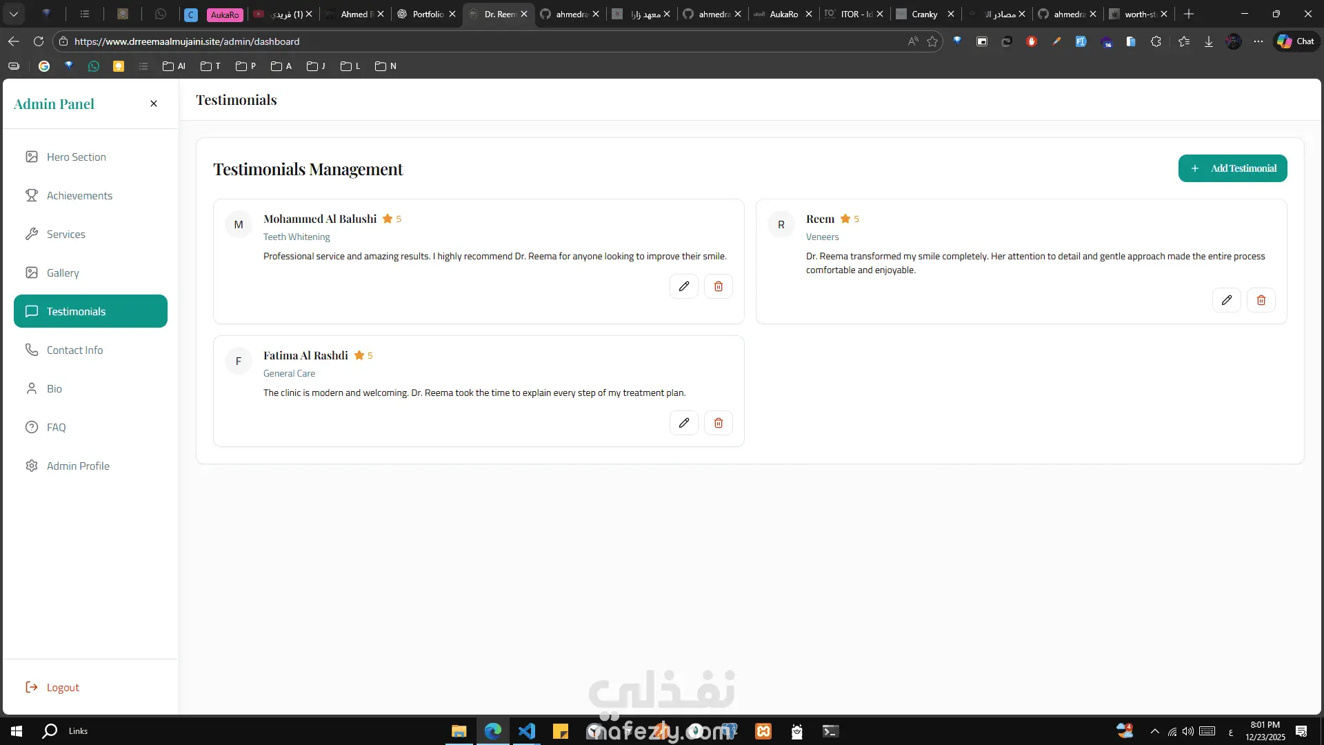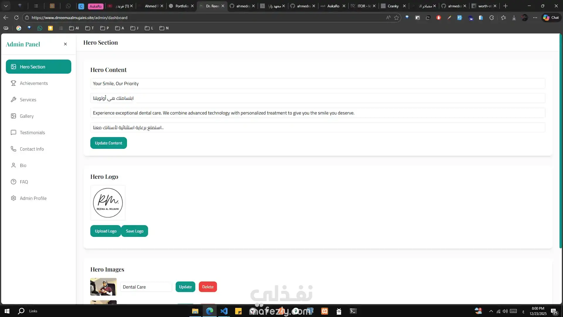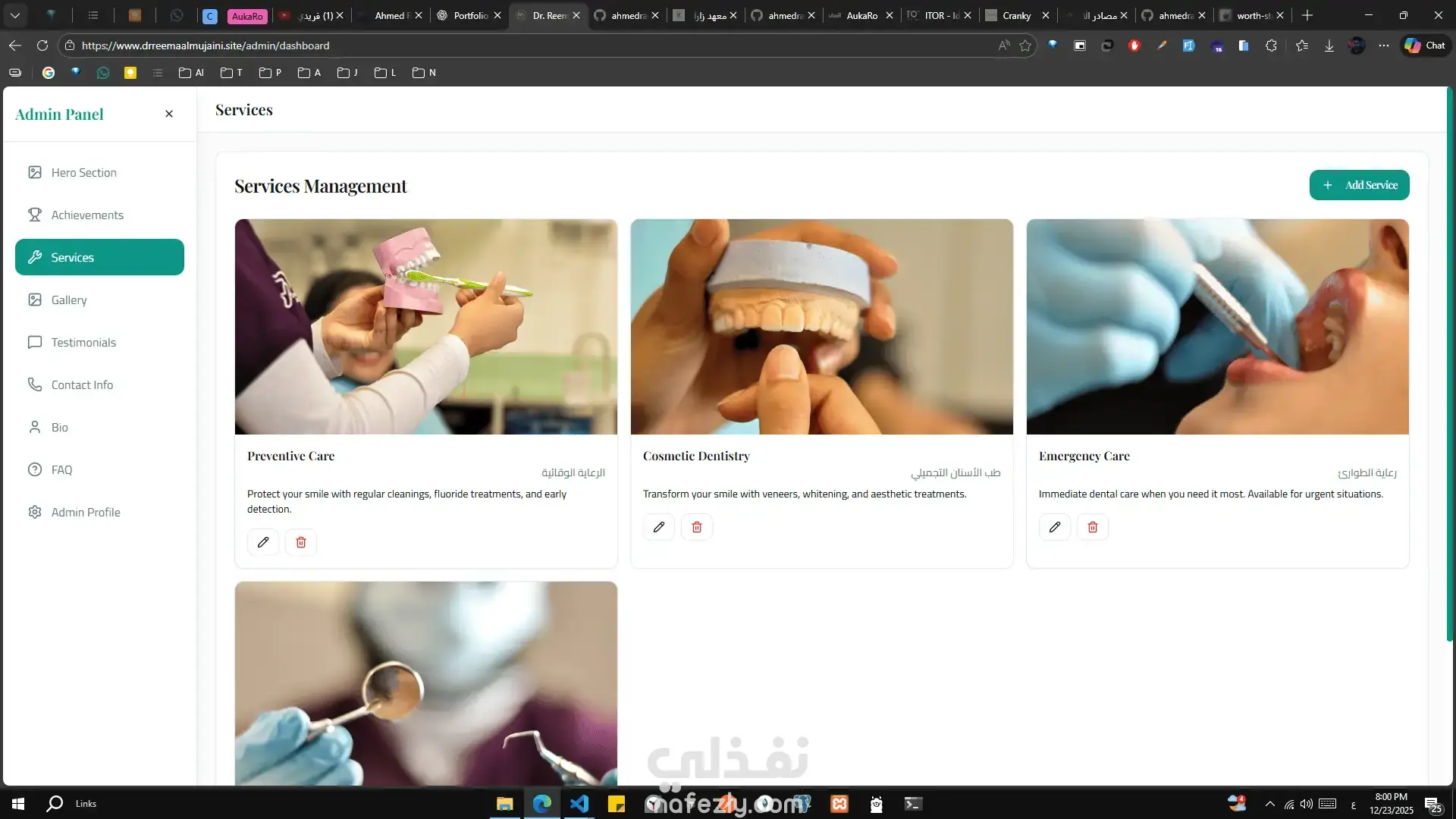 ده موقع احترافي تم تنفيذه لعرض خدمات طبيبة أسنان، وبيوفّر تجربة متكاملة للمرضى من حيث استعراض الخدمات، مشاهدة نتائج الحالات، قراءة التقييمات، وحجز المواعيد أونلاين. الموقع كمان بيحتوي على لوحة تحكم كاملة لإدارة كل محتوى الموقع، مع دعم اللغتين العربية والإنجليزية وإمكانية التبديل بينهم بسهولة. فكرة المشروع: المستخدم يقدر يتصفح خدمات العيادة، يشوف صور قبل/بعد للحالات، يقرأ آراء المرضى، ويحجز موعد بكل سهولة من خلال الموقع. ومن ناحية الإدارة، الدكتورة أو الأدمن يقدر يتحكم في كل شيء من خلال داشبورد مخصصة بدون الحاجة لأي تدخل برمجي. المميزات الأساسية: عرض شامل لجميع خدمات العيادة معرض أعمال ونتائج الحالات (Portfolio) دعم اللغتين العربية والإنجليزية مع التبديل الفوري نظام حجز مواعيد أونلاين قسم تقييمات وآراء العملاء لوحة تحكم (Admin Dashboard) لإدارة المحتوى بالكامل أنيميشن سلسة لتحسين تجربة المستخدم تصميم متجاوب يعمل على جميع الأجهزة (موبايل – تابلت – ديسكتوب) لوحة التحكم (Admin Dashboard): إضافة وتعديل وحذف الخدمات إدارة معرض الصور ونتائج الحالات التحكم في التقييمات وآراء العملاء إدارة طلبات حجز المواعيد حماية الوصول باستخدام نظام تسجيل دخول آمن تجربة المستخدم والتصميم: واجهة عصرية باستخدام Tailwind و ShadCN UI أنيميشن تفاعلية ناعمة باستخدام Framer Motion تحسين الصور ورفعها على Cloudinary أداء سريع وتجربة استخدام مريحة دعم كامل للـ Responsive Design التقنيات المستخدمة: Frontend & SSR: Next.js TypeScript UI & Styling: Tailwind CSS ShadCN UI Backend & Database: Prisma Neon PostgreSQL Authentication: JWT (jsonwebtoken) Animations: Framer Motion Image Management: Cloudinary
