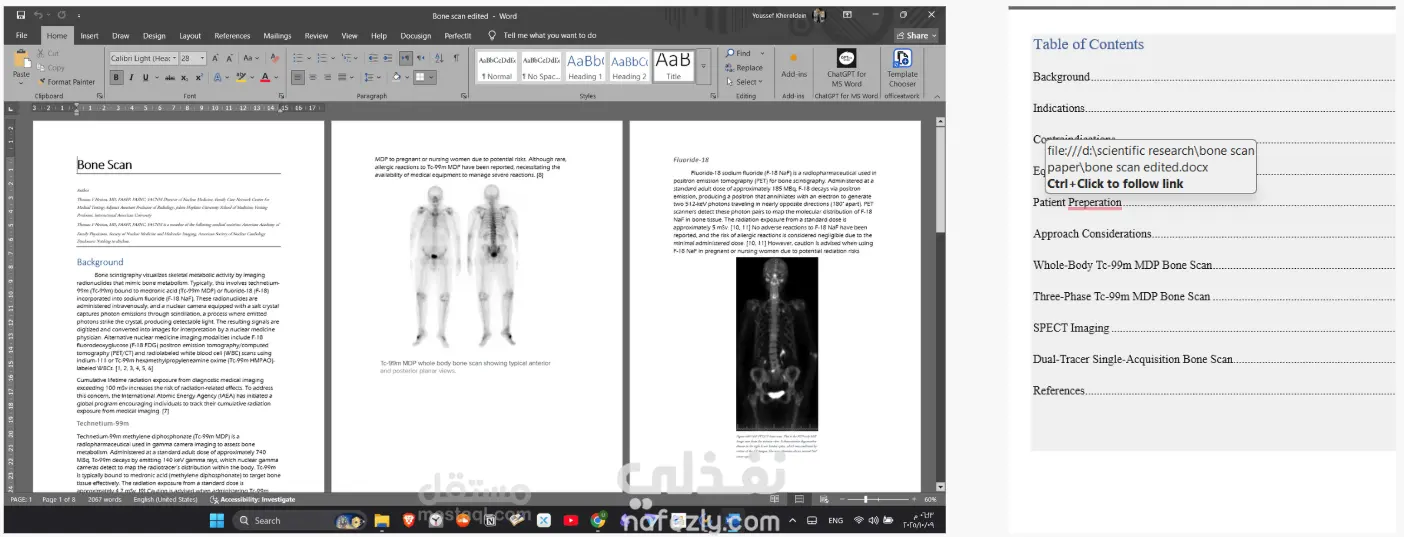1. نبذة عن المشروع (Project Overview) مراجعة وتحرير مقال علمي متخصص يتناول "فحص مسح العظام" (Bone Scan) في مجال الطب النووي. ركز العمل على تحسين جودة النص العلمية، وضمان دقة المصطلحات الطبية، ورفع سوية اللغة لتناسب النشر في المجلات العلمية المحكمة. 2. القيمة المضافة والمهام (Core Contributions) التدقيق العلمي (Scientific Content Review): مراجعة دقة المصطلحات الخاصة بالطب النووي (مثل: Radiopharmaceuticals, Tracer uptake, Osteoblastic activity) والتأكد من سياقها العلمي. التدقيق اللغوي المنهجي (Systematic Proofreading): تصحيح القواعد اللغوية، الإملاء، وعلامات الترقيم مع الحفاظ على الأسلوب الأكاديمي الرصين. تحسين التدفق والوضوح (Clarity & Flow): إعادة صياغة الجمل المعقدة لتصبح أكثر وضوحاً وسلاسة للقارئ المتخصص. التحقق من الاتساق (Consistency Check): التأكد من وحدة المصطلحات المستخدمة عبر المقال بالكامل وتطابق الاختصارات الطبية مع المعايير الدولية.