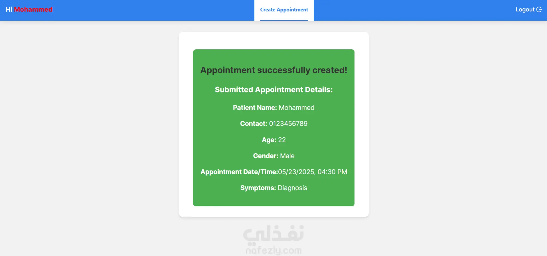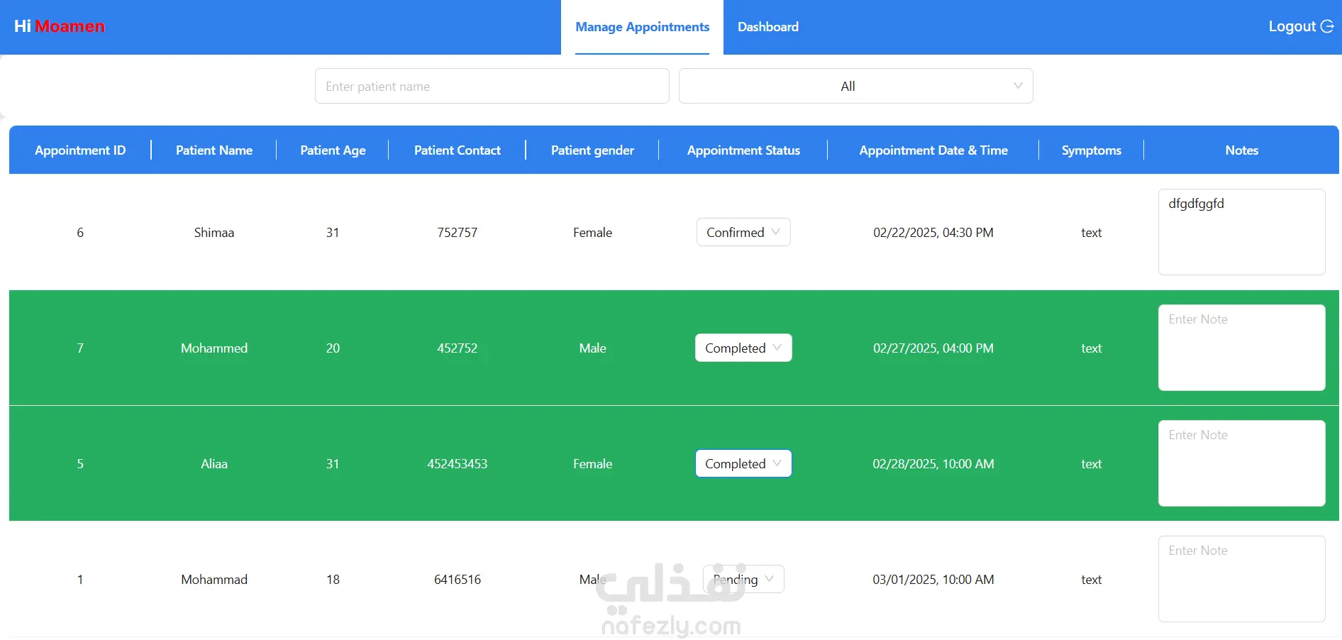 نظام حجز مواعيد العيادة هو تطبيق قائم على الأدوار تم تطويره باستخدام React TypeScript بهدف تنظيم عملية حجز المواعيد بين المرضى والأطباء بطريقة سلسة وفعّالة. يُمكّن المرضى من حجز واستعراض مواعيدهم، ويوفّر للأطباء لوحة تحكم لإدارة المواعيد والاطلاع على الإحصائيات المتعلقة بنشاط العيادة. الميزات الأساسية: نظام تسجيل دخول حسب الدور: المريض: يمكنه حجز المواعيد واستعراضها. الطبيب: يمتلك صلاحية الوصول إلى لوحة تحكم خاصة لإدارة المواعيد. يشمل النظام تحققًا من صحة البيانات عند إدخالها لضمان جودة المعلومات. حجز موعد (للمريض): نموذج حجز آمن يحتوي على الحقول التالية: الاسم، رقم التواصل، العمر، الجنس. اختيار التاريخ والوقت (ضمن ساعات العمل: من 9 صباحًا حتى 5 مساءً). وصف الأعراض (نص حر). رسالة تأكيد تُعرض عند إتمام الحجز بنجاح. إدارة المواعيد (للطبيب): استعراض جميع المواعيد مرتبة حسب التاريخ. فلترة حسب الحالة: (قيد الانتظار / مؤكد / مكتمل). البحث باسم المريض. إمكانية: تغيير حالة الموعد. إضافة ملاحظات للمريض (مثلاً: "إحضار التحاليل"). لوحة تحكم الطبيب: عرض شامل لنشاط العيادة، يشمل: عدد المواعيد اليوم. مقارنة بين المواعيد المؤكدة والمنتظرة. مخططات بيانية (أعمدة / دائرية) توضح اتجاهات الحجز اليومية. التقنيات المستخدمة: React TypeScript لتطوير الواجهة الأمامية. React Router للتنقل بين الصفحات. Ant Design لتوفير واجهات استخدام جاهزة وعصرية. Chart.js لعرض الإحصائيات بشكل مرئي.