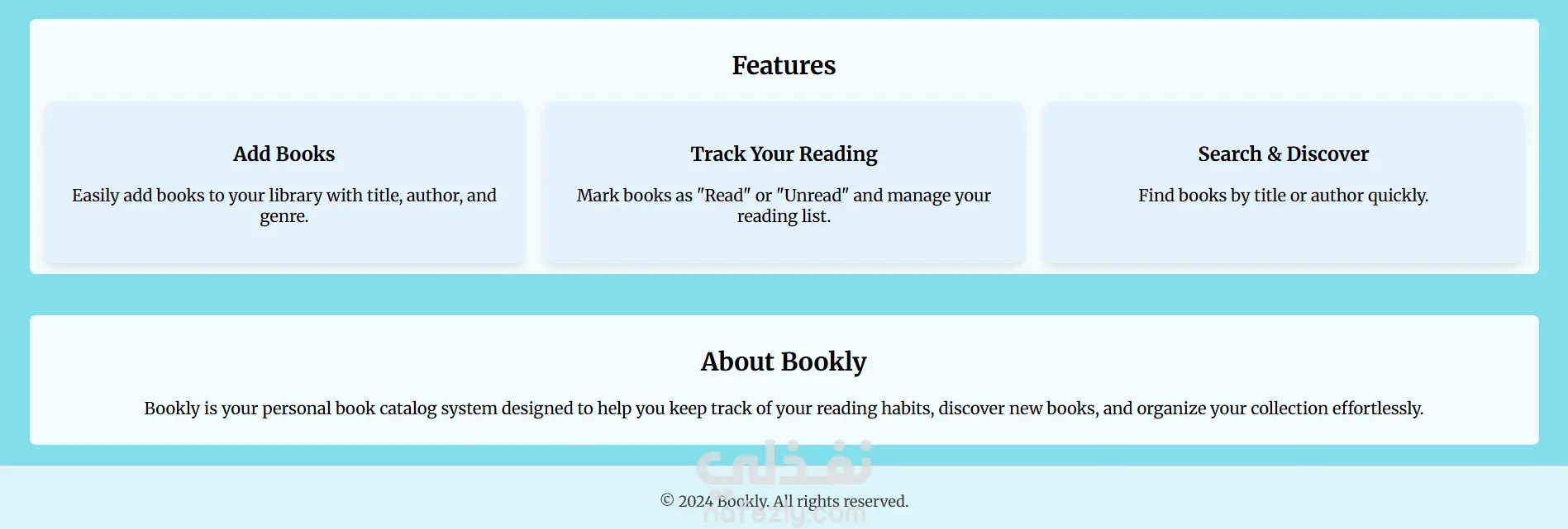 موقع ويب تم تطويره باستخدام HTML وCSS وJavaScript، يتيح للمستخدمين إضافة مجموعة من الكتب الإلكترونية، عرضها، وإدارتها بسهولة. الميزات: إضافة الكتب: يمكن للمستخدم إدخال معلومات الكتاب مثل العنوان والمؤلف. عرض المجموعة: يتم عرض جميع الكتب المُضافة بشكل منسّق وجذاب. البحث عن كتاب: إمكانية البحث عن كتاب معين من خلال الاسم. تغيير الحالة: يمكن للمستخدم تغيير حالة الكتاب بين "مقروء" و"غير مقروء". واجهة متجاوبة: تصميم متوافق مع مختلف أحجام الشاشات لتجربة استخدام مريحة على جميع الأجهزة.