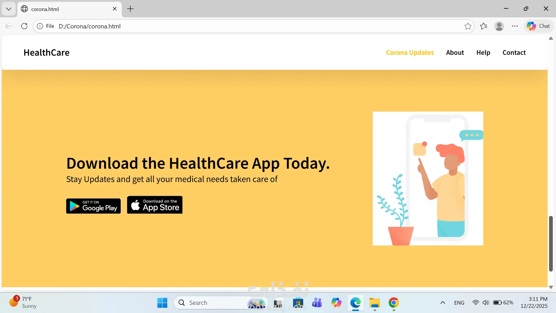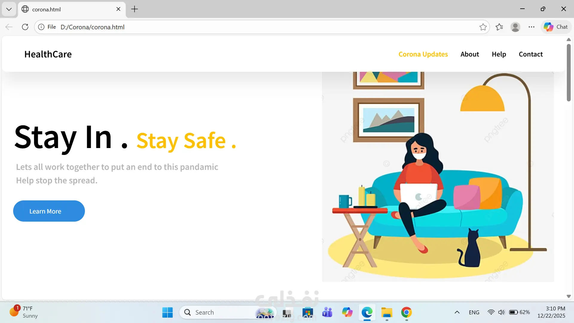 تصميم وتطوير موقع توعوي للحماية من فيروس كورونا باستخدام HTML5 و CSS3، يهدف إلى نشر الوعي الصحي وتوضيح طرق الوقاية بشكل مبسط وسهل الفهم. الموقع يعرض المعلومات الصحية بطريقة منظمة وجذابة، مع الاهتمام بتجربة المستخدم وسهولة التصفح، بالإضافة إلى دعم كامل لمختلف أحجام الشاشات (Responsive Design). ✨ مميزات الموقع تصميم بسيط وواضح يناسب المواقع التوعوية عرض إرشادات الوقاية والتعليمات الصحية بشكل منظم متوافق مع جميع الشاشات (كمبيوتر – تابلت – موبايل) استخدام ألوان مريحة وخطوط واضحة كود نظيف وسهل التعديل سرعة تحميل عالية 🛠️ التقنيات المستخدمة HTML5 CSS3 Flexbox Media Queries