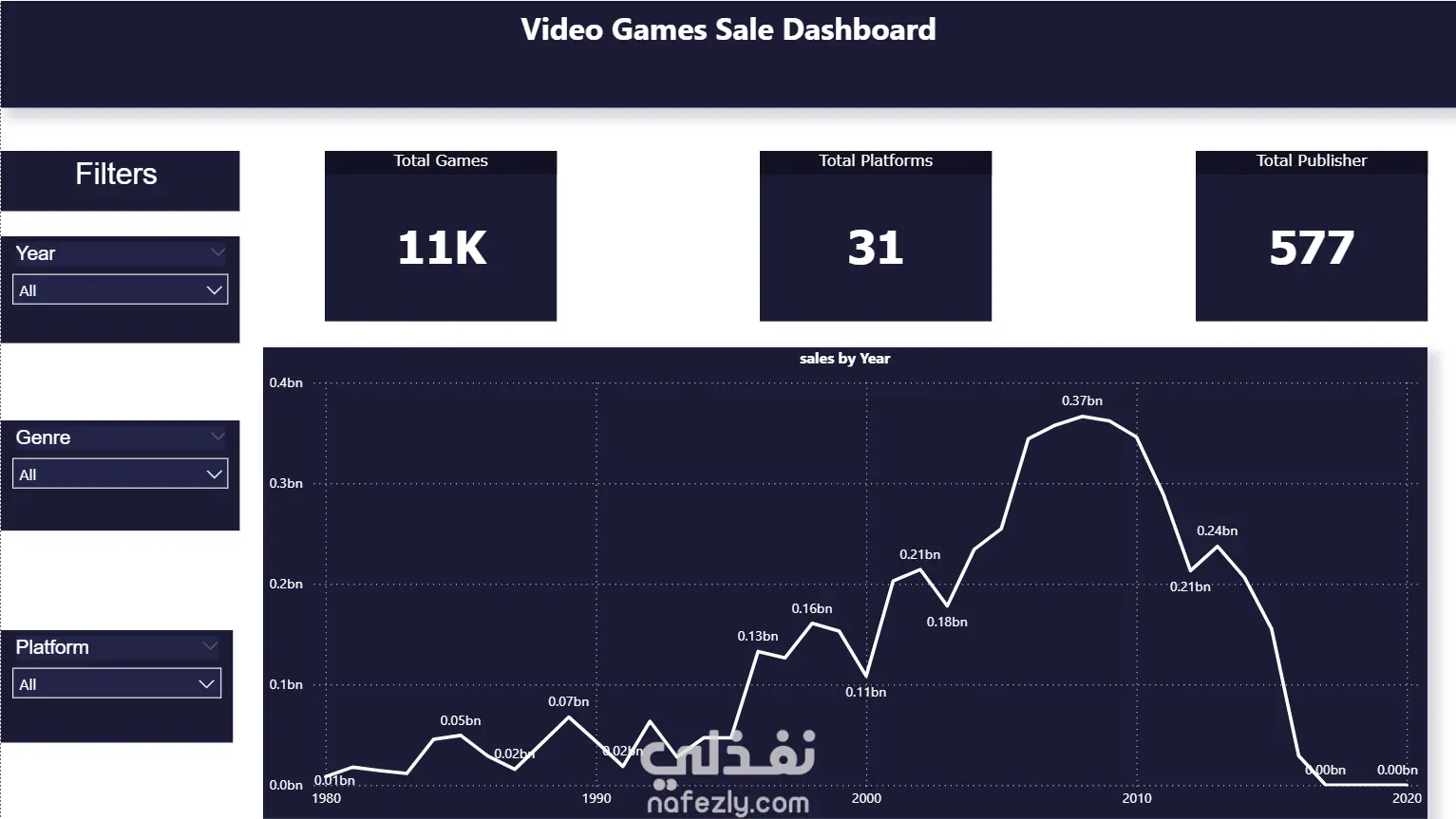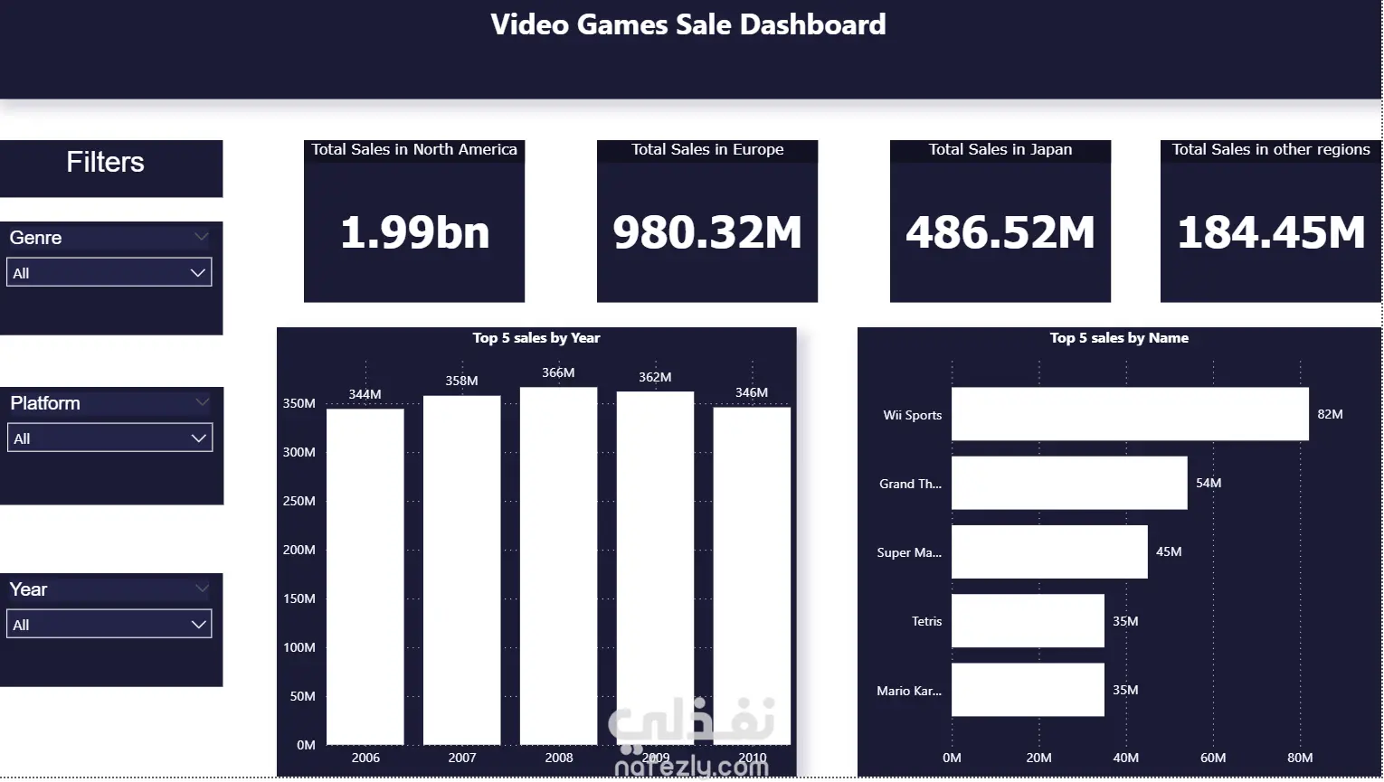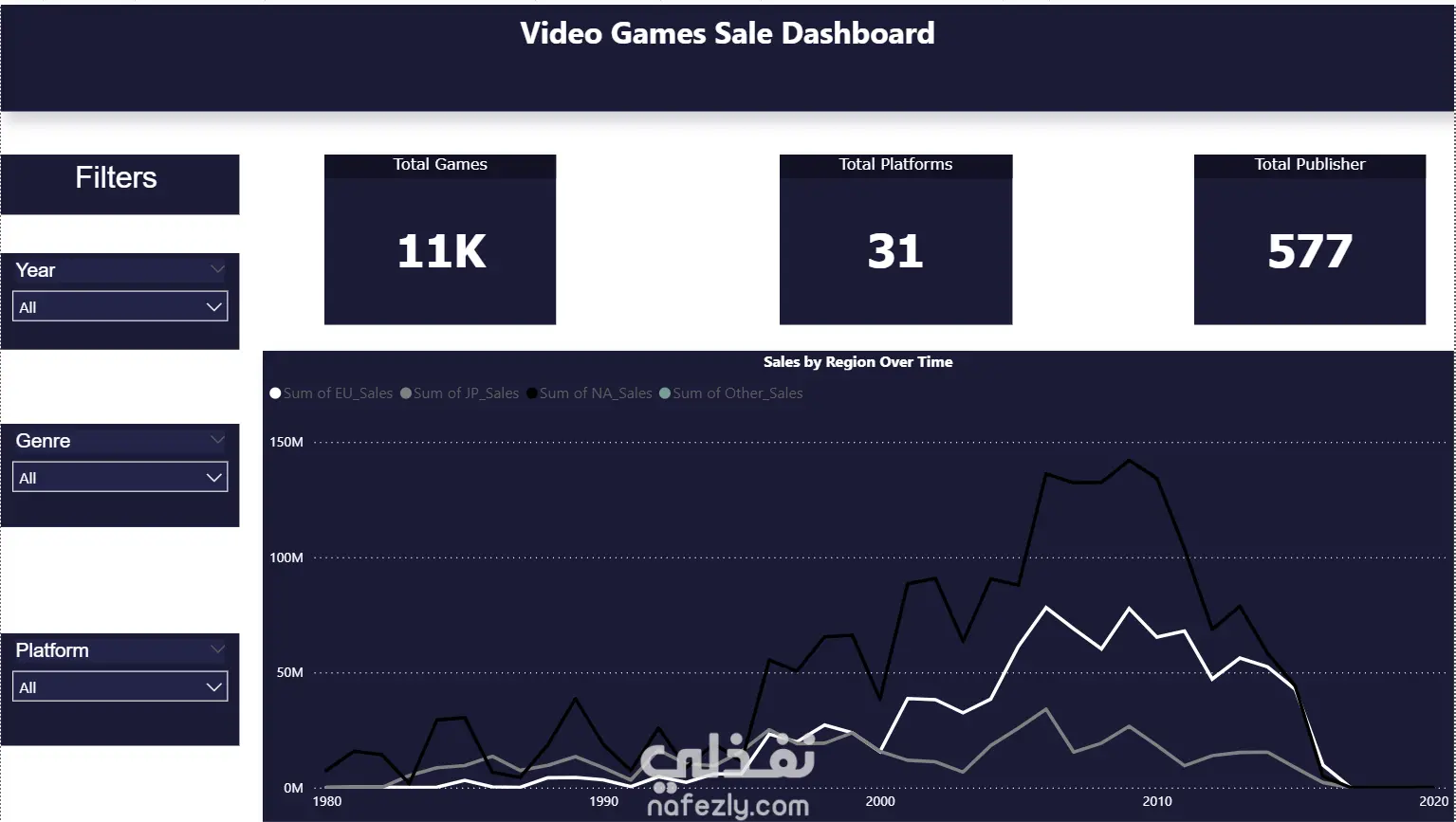 أنشأت لوحات تفاعلية باستخدام Power BI تتضمن مؤشرات أداء رئيسية (المبيعات الإقليمية، عدد الألعاب، المنصات، الناشرين).
