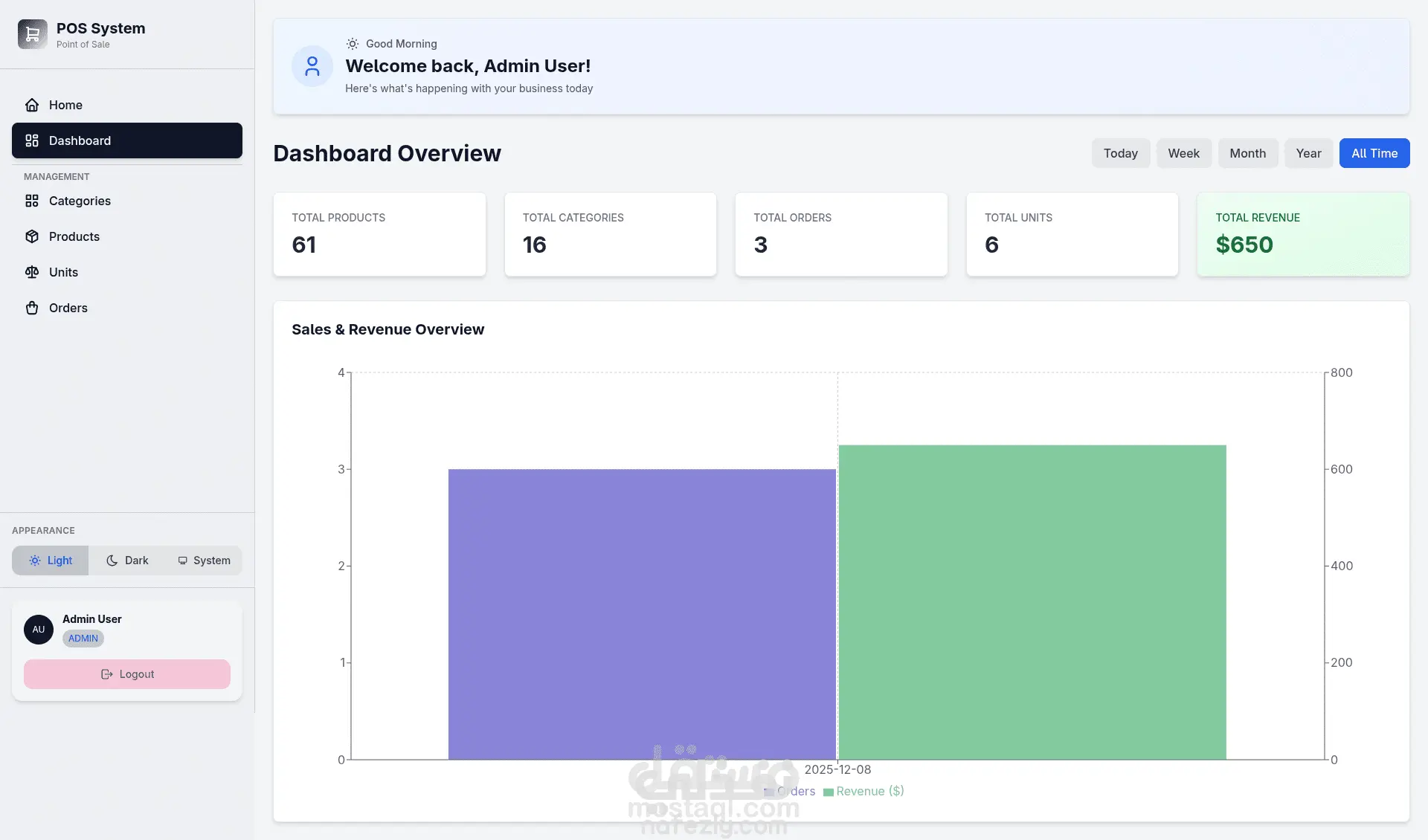 نظام نقاط بيع (Point of Sale) احترافي ومتكامل للمحلات التجارية والمطاعم، يوفر إدارة كاملة للمبيعات، المخزون، والموظفين. المميزات الرئيسية: - ? واجهة POS سريعة - معالجة مبيعات فورية ودعم كامل للوحة المفاتيح - ? لوحة تحكم تحليلية - رسوم بيانية حية لاتجاهات المبيعات باستخدام Recharts - ? نظام صلاحيات متقدم - RBAC (Role-Based Access Control) للتحكم في وصول المستخدمين - ? إدارة مخزون ذكية - تتبع دقيق للمنتجات مع دعم وحدات قياس متعددة - ? معاملات آمنة - استخدام Database Transactions لضمان سلامة البيانات - ? إدارة متعددة المستخدمين - للمسؤولين والكاشيرات - ? تصميم متجاوب - يعمل على جميع الأجهزة - ? ci-cd deployment - كل المشروع يعمل بأمر Docker Compose واحد التحديات التقنية المحلولة: - مشكلة تضارب المخزون: حل مشكلة بيع آخر منتج من كاشيرين في نفس الوقت باستخدام Atomic Transactions - الأمان: حماية endpoints الحساسة بنظام Guards في NestJS - الأداء: استخدام Vite بدلاً من Create React App لتحميل أسرع - Type Safety: TypeScript صارم للقضاء على الأخطاء التقنيات المستخدمة: - React 18 + Vite - NestJS (Backend) - Prisma ORM - PostgreSQL - Redux Toolkit - Tailwind CSS + Radix UI - JWT + Refresh Tokens - Docker + Docker Compose