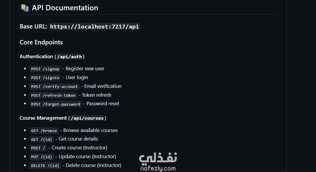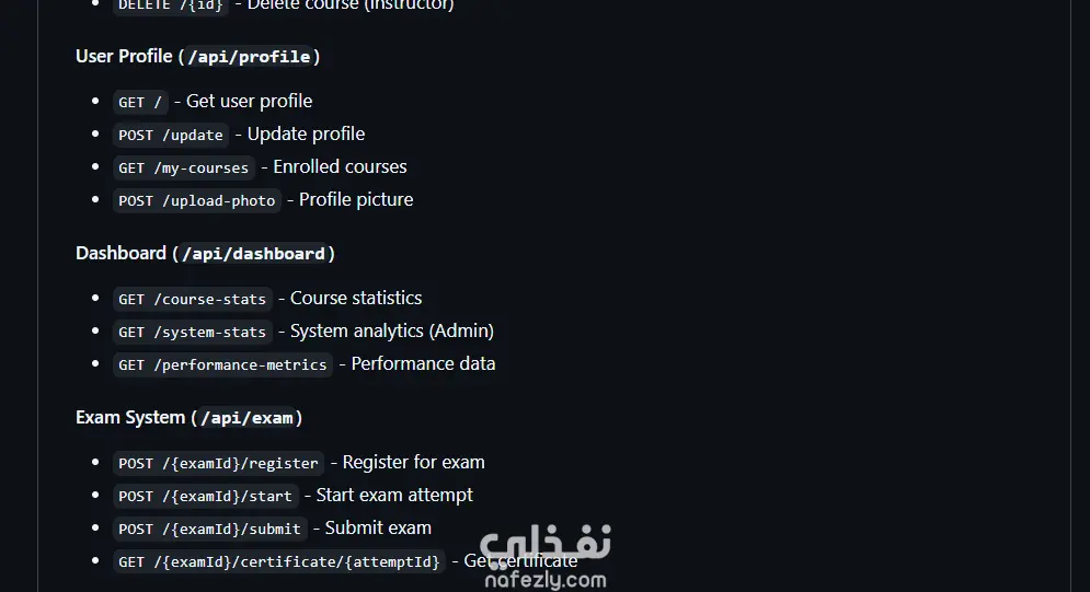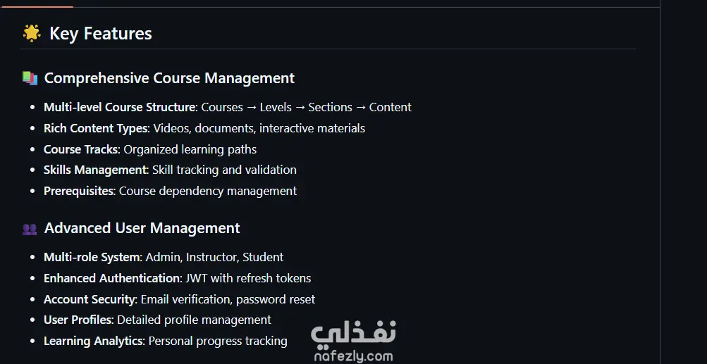 Comprehensive Course Management Multi-level Course Structure: Courses → Levels → Sections → Content Rich Content Types: Videos, documents, interactive materials Course Tracks: Organized learning paths Skills Management: Skill tracking and validation Prerequisites: Course dependency management ? Advanced User Management Multi-role System: Admin, Instructor, Student Enhanced Authentication: JWT with refresh tokens Account Security: Email verification, password reset User Profiles: Detailed profile management Learning Analytics: Personal progress tracking ? Examination & Certification System Secure Exam Engine: Time-limited, randomized questions Advanced Proctoring: Webcam monitoring, screen recording Anti-Cheating Measures: Browser lockdown, activity monitoring Automated Certificates: Digital certificates with verification Multiple Question Types: MCQ, Essay, True/False ? Analytics & Dashboard Real-time Dashboards: Role-based analytics Performance Metrics: Course completion, engagement rates Predictive Analytics: Learning outcome predictions Detailed Reports: Exportable data reports System Health Monitoring: Performance tracking ? Real-time Communication SignalR Integration: Live notifications Course Forums: Student-instructor interaction Messaging System: Internal communication Progress Notifications: Automated updates ? Enterprise Security Advanced Authentication: JWT + refresh token strategy Role-based Access Control: Granular permissions Security Audit Logs: Comprehensive activity tracking Data Encryption: At-rest and in-transit GDPR Compliance: Data protection standards