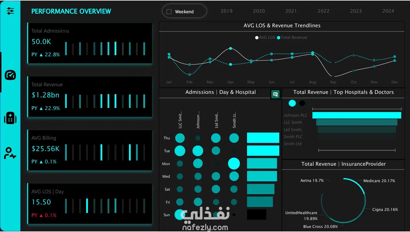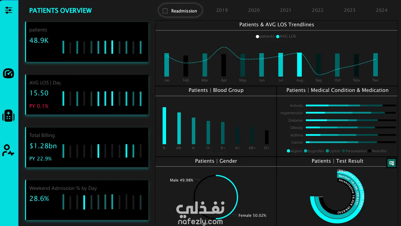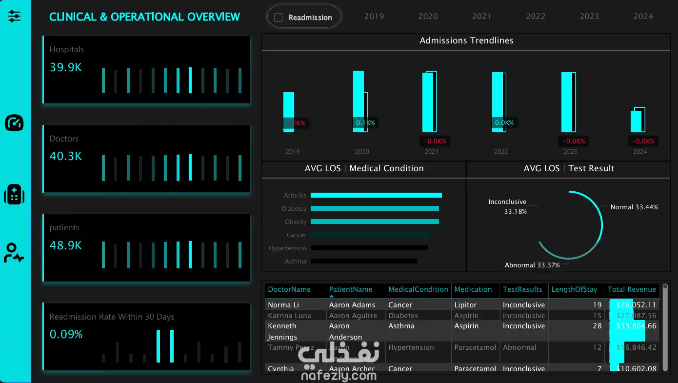 في هذا المشروع قمتُ بتصميم وتنفيذ Dashboard تحليلي متكامل للمستشفيات يوفّر رؤية شاملة عن المرضى، الأداء العام، والجوانب السريرية والتشغيلية في مكان واحد، لدعم الإدارة الطبية في اتخاذ قرارات دقيقة وسريعة. 🏥 محتويات الـ Dashboard: 1️⃣ Patient Overview إجمالي عدد المرضى المرضى النشطون وغير النشطين التوزيع حسب العمر والجنس تحليل النشاط والمتابعة 2️⃣ Performance Overview مؤشرات الأداء الرئيسية (KPIs) مقارنة الأداء عبر الفترات الزمنية تحليل الاتجاهات العامة تحديد نقاط القوة ومناطق التحسين 3️⃣ Clinical & Operational Overview أداء الأقسام الطبية معدلات الإشغال كفاءة التشغيل وتوزيع الموارد تحليل فترات الضغط والازدحام