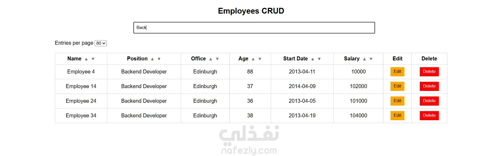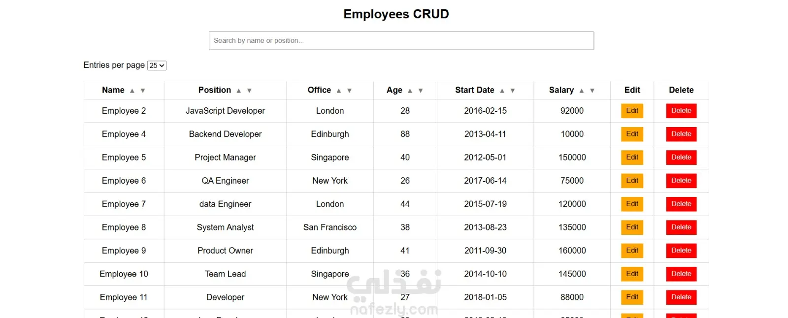 نظام إدارة موظفين بسيط تم تطويره باستخدام Vanilla JavaScript، يوضح عمليات CRUD (إنشاء، قراءة، تعديل، حذف)، بالإضافة إلى البحث، الفرز، والتحكم بعدد العناصر المعروضة في الصفحة باستخدام REST API. يركز المشروع على منطق الجافاسكربت، التفاعل مع DOM، والتكامل مع واجهات برمجة التطبيقات (API) مع تقديم واجهة مستخدم نظيفة وسهلة الاستخدام. يمثل المشروع نموذجًا عمليًا لتطبيق أنظمة إدارة بيانات الموظفين بطريقة منظمة وفعالة.