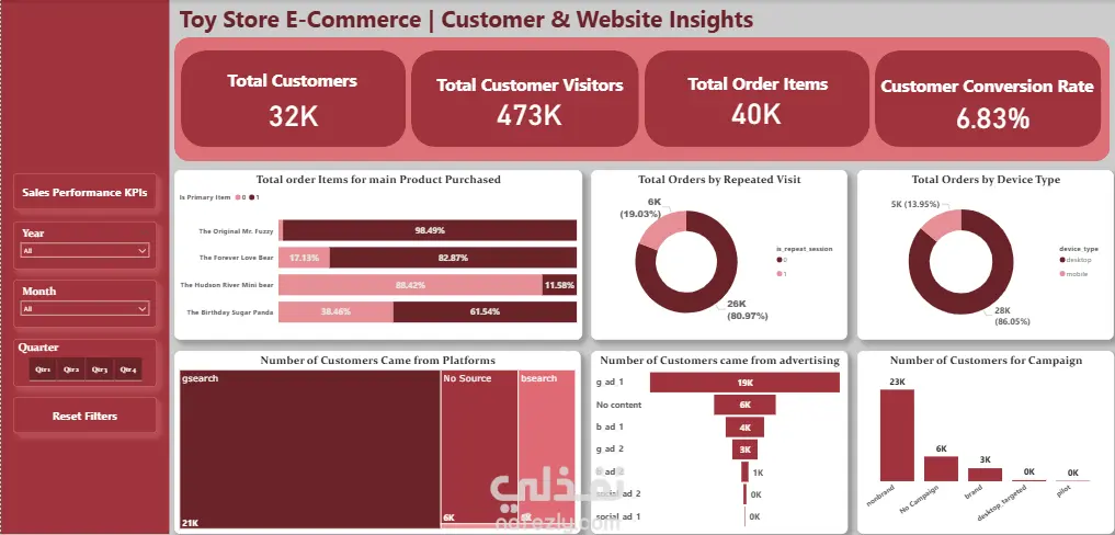 يقوم هذا المشروع بتحليل بيانات متجر ألعاب إلكتروني (E-Commerce Toy Store) بالاعتماد على مجموعة بيانات مقدمة من Maven Analytics (https://mavenanalytics.io...)، ويهدف إلى مساعدة الشركات على فهم أنماط الشراء، سلوك العملاء، وأداء الموقع الإلكتروني. الأدوات المستخدمة: معالجة البيانات والتحليل: SQL Server نمذجة البيانات وبناء لوحة معلومات تفاعلية: Power BI توثيق المشروع وإدارة الإصدارات: GitHub أهم الأسئلة التجارية التي يجيب عنها المشروع: ما إجمالي الإيرادات ومتوسط قيمة الطلب (AOV)، بشكل عام وبحسب السنة؟ أي المنتجات يحقق أعلى مبيعات؟ ما معدل المرتجعات لكل منتج؟ ما معدل تحويل العملاء؟ ما القنوات التسويقية التي تجذب أكبر عدد من العملاء؟ أي الحملات التسويقية تحقق أعلى عدد من العملاء؟ أي الأجهزة تحقق معدل تحويل أعلى (الهاتف المحمول أم الكمبيوتر)؟ ما المنتجات المفضلة لدى العملاء وأيها الأقل طلبًا؟ أبرز النتائج: إجمالي الإيرادات: 1.94 مليون متوسط قيمة الطلب (AOV): 59.99 إجمالي عدد الطلبات: 32 ألف معدل المرتجعات: 4.40% المنتج الأكثر مبيعًا: The Original Mr. Fuzzy أعلى حملة من حيث عدد الزيارات: nonbrand (حوالي 23 ألف) أعلى منصة جذب للزيارات: gsearch (حوالي 21 ألف) معدل التحويل: 6.83% العملاء المتكررون: حوالي 6 آلاف عميل *ملحوظة: البيانات المستخدمة في هذا المشروع تجريبية ومخصصة لأغراض التعلم والتحليل فقط، ولا تمثل بيانات حقيقية أو فعلية لأي نشاط تجاري.