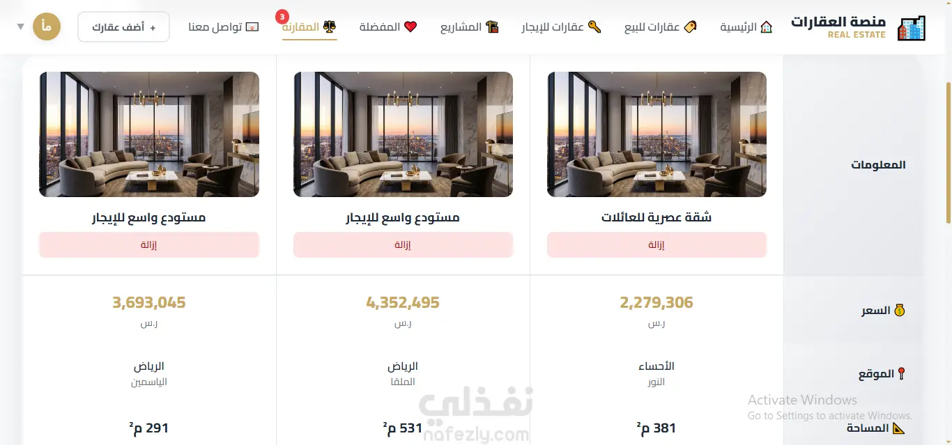 نظام مقارنة ذكي: يتيح للمستخدم مقارنة ما يصل إلى 4 عقارات بدقة من حيث السعر، المساحة، والمميزات في واجهة واحدة.