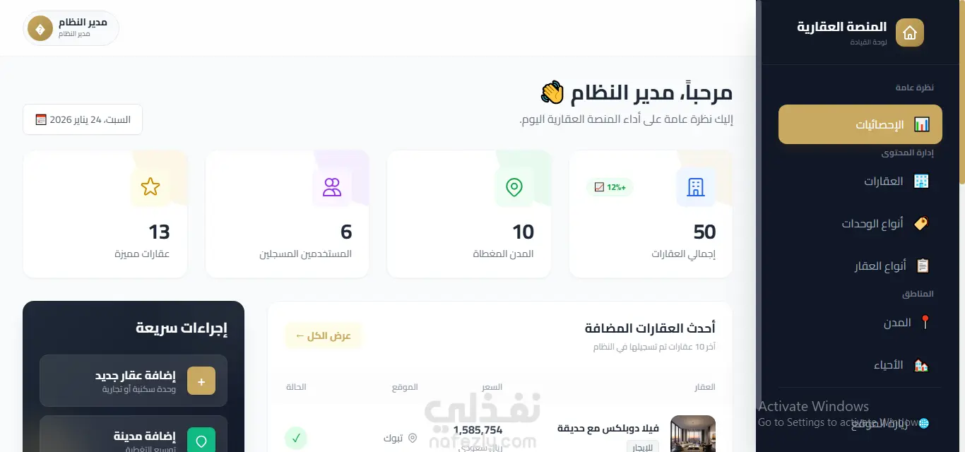 تم تطوير هذه المنصة العقارية لتكون حلاً متكاملاً يجمع بين الأداء العالي والتصميم العصري الجذاب. تهدف المنصة إلى تسهيل عملية البحث والمقارنة بين العقارات (بيع، شراء، تأجير) بأسلوب يحاكي التطبيقات العالمية.