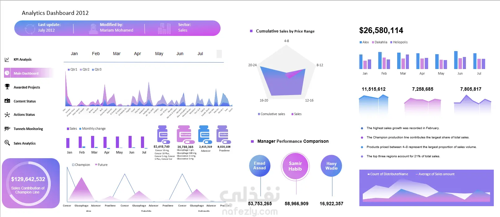 تحليل بيانات مبيعات شركة أدوية وإنشاء لوحة تفاعلية باستخدام Excel لمتابعة الأداء وتقديم رؤى قابلة للتنفيذ. تشمل : -نمو المبيعات الشهري. -المبيعات حسب خط الإنتاج والمنطقة. -أفضل 3 مناطق من حيث مبيعات المنتجات. -تحليل العلاقة بين المبيعات والسعر. -المبيعات حسب المدير. -العلاقة بين المبيعات ومتوسط السعر.