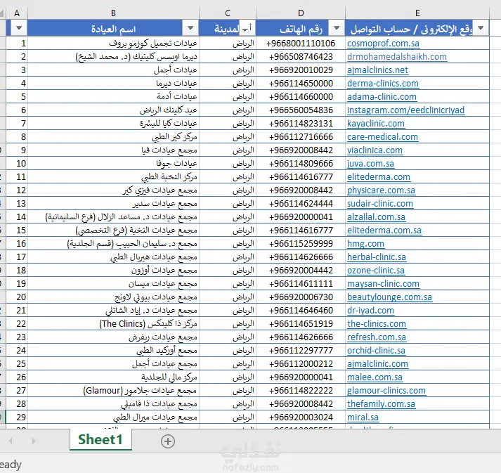 تنظيم البيانات في ملف Excel احترافي يتضمن (اسم العيادة، المدينة، الهاتف، البريد الإلكتروني، وحسابات التواصل).
