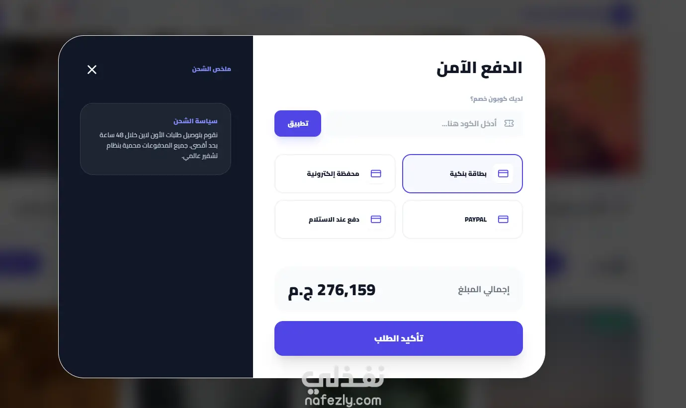 نظام دفع آمن متعدد الخيارات (محفظة إلكترونية، بطاقات، PayPal، الدفع عند الاستلام)
