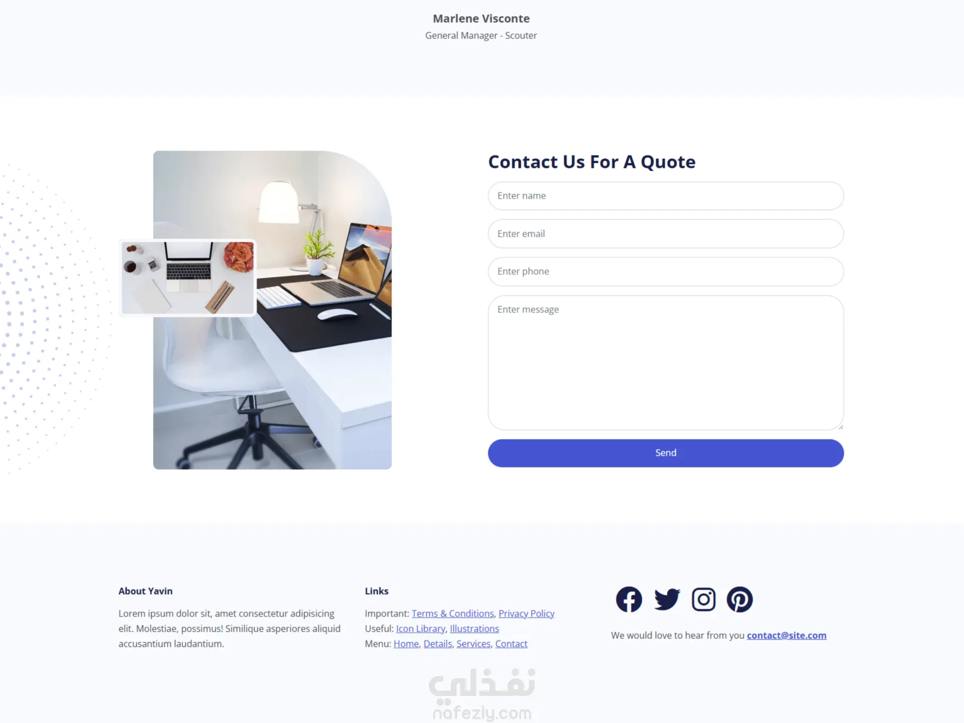 موقع إلكتروني لشركة تُنشئ وتُخصص مساحات مكتبية. يُمكن استخدامه لأي نوع من الأعمال تقريبًا. إنه قالب أعمال بسيط بتصميم أنيق. مشاهدة الموقع : https://yavin-faqi.netlify.app GitHub: https://github.com/abod564/Yavin الميزات تصميم أنيق مع صور/أنماط خلفية تصميم متجاوب جافا سكريبت مُخصص لعداد الإحصائيات تأثير تمرير التنقل مساحة المشروع شريط تمرير/دوار لشهادات العملاء نموذج اتصال صفحة داخلية للمقالات أيقونات جذابة