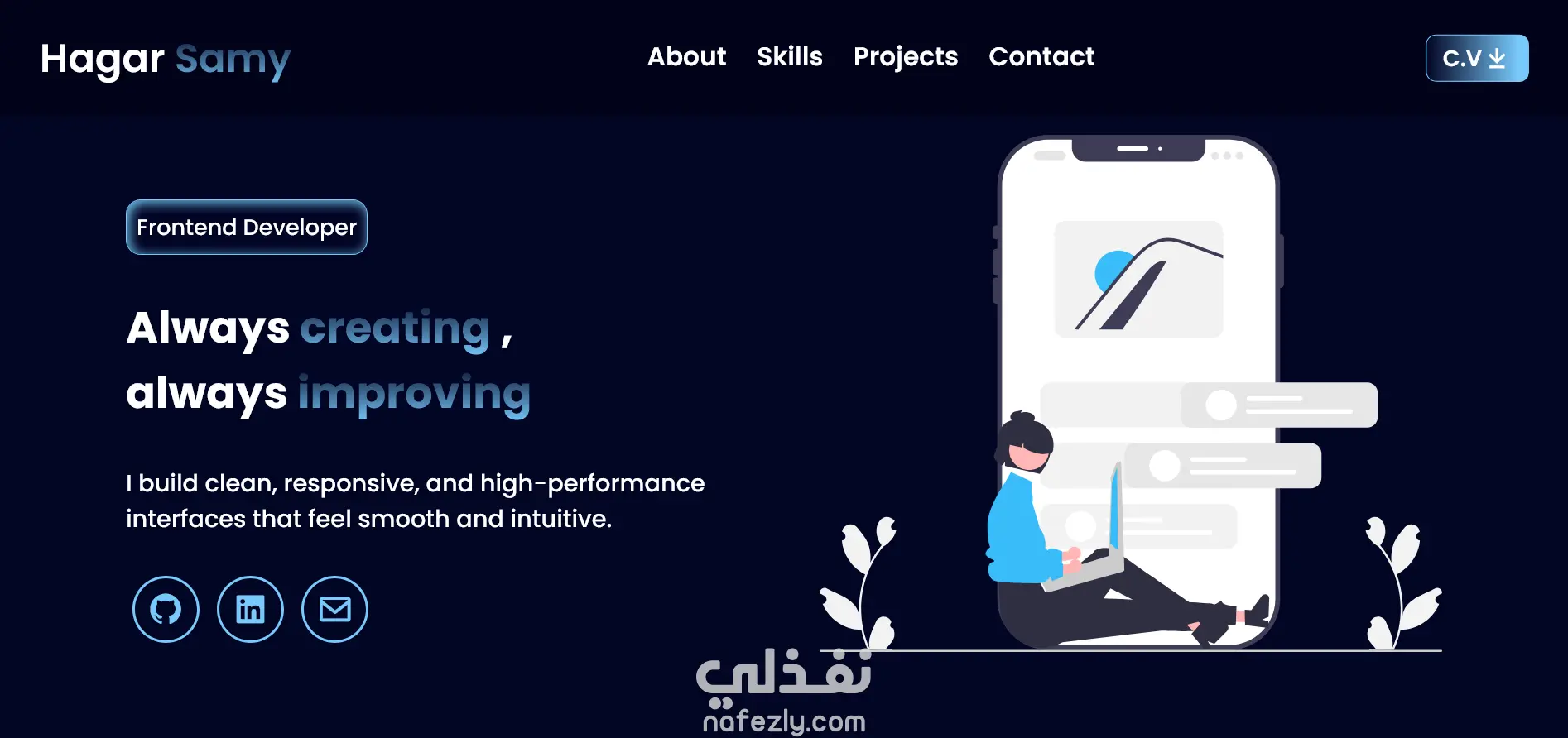 المميزات التقنية ✨: - دمج خدمة Email.js لبناء نظام تواصل مباشر دون الحاجة لـ Backend. - استخدام الـ Regex للتحقق من بيانات المدخلات في نموذج التواصل فورياً. - تجربة مستخدم متقدمة (UX): إضافة حركات تفاعلية باستخدام مكتبة AOS، ونظام تنقل سلس (Smooth Scroll). - أداة تحميل ذكية: برمجت أداة توليد روابط تلقائية لتحميل السيرة الذاتية بصيغة PDF. - التوافق التام: الموقع متجاوب بنسبة 100% مع كافة الشاشات والمتصفحات. التقنيات ✨: HTML | CSS | JavaScript | Email.js