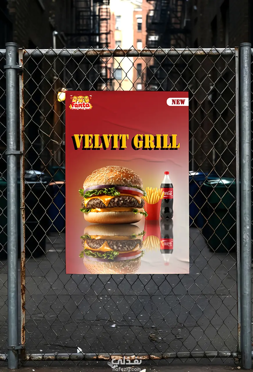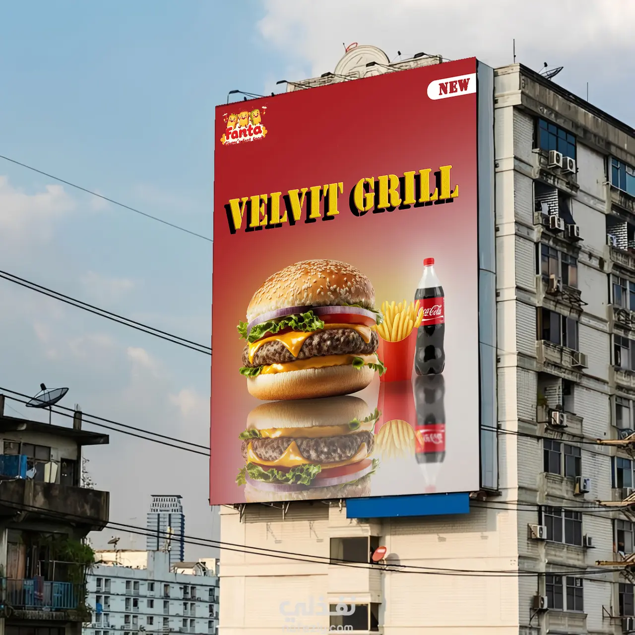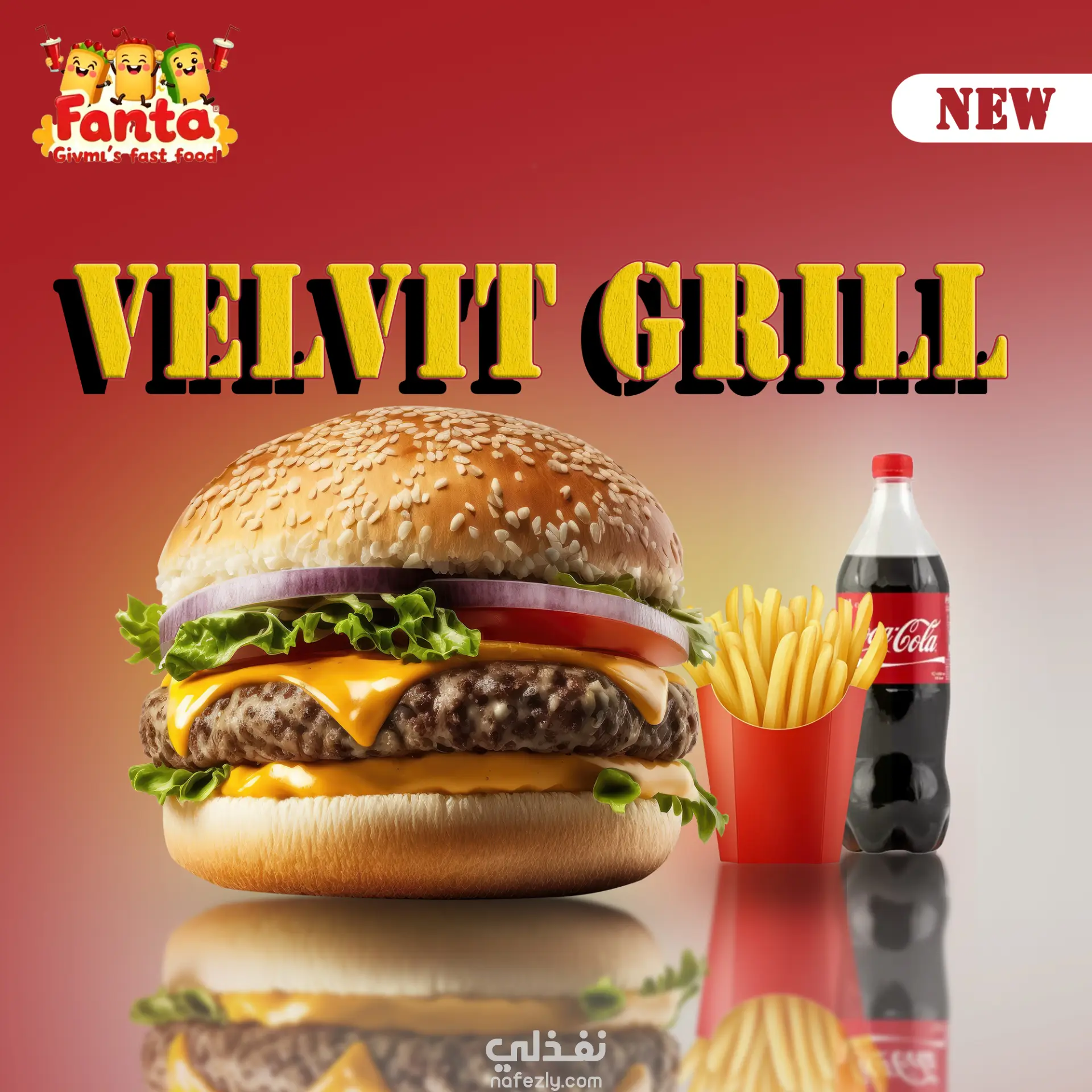 في المشروع ده اشتغلت على تصميم إعلان سوشيال ميديا لوجبة برجر لمطعم Velvit Grill.