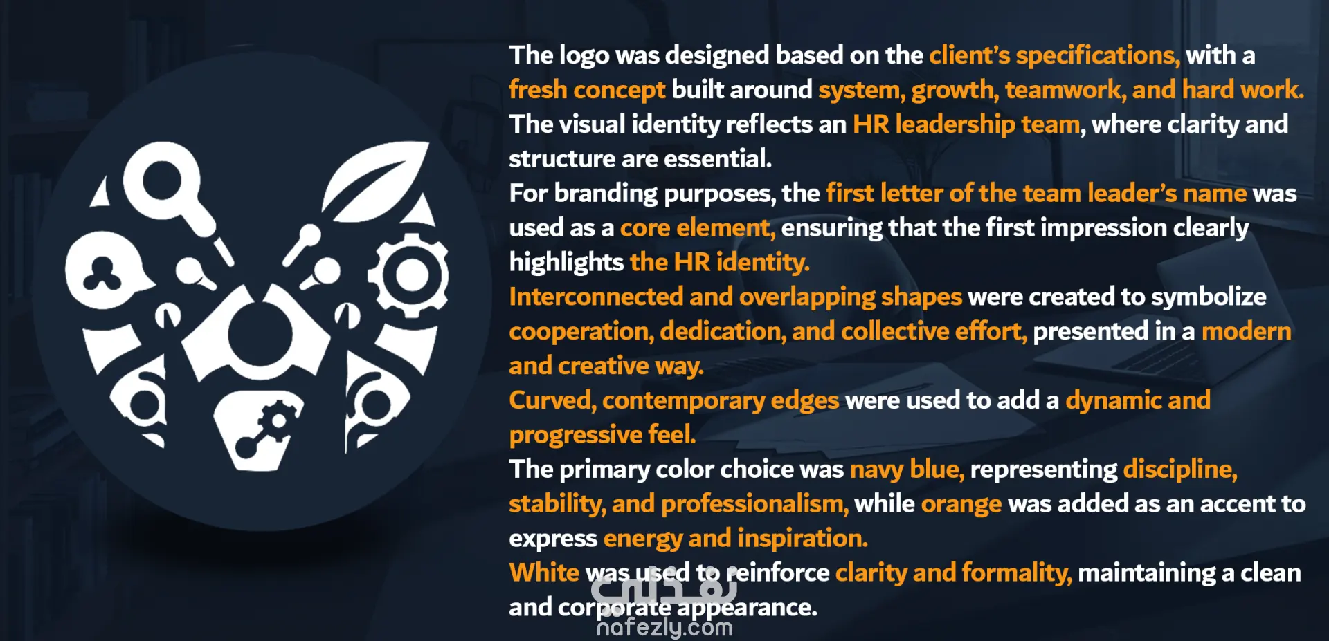 اعتمد التصميم على استخدام أول حرف من اسم قائد الفريق كعنصر أساسي في الـ Branding، مع التأكيد على إبراز هوية الموارد البشرية كأول ما يلفت الانتباه في الشعار.