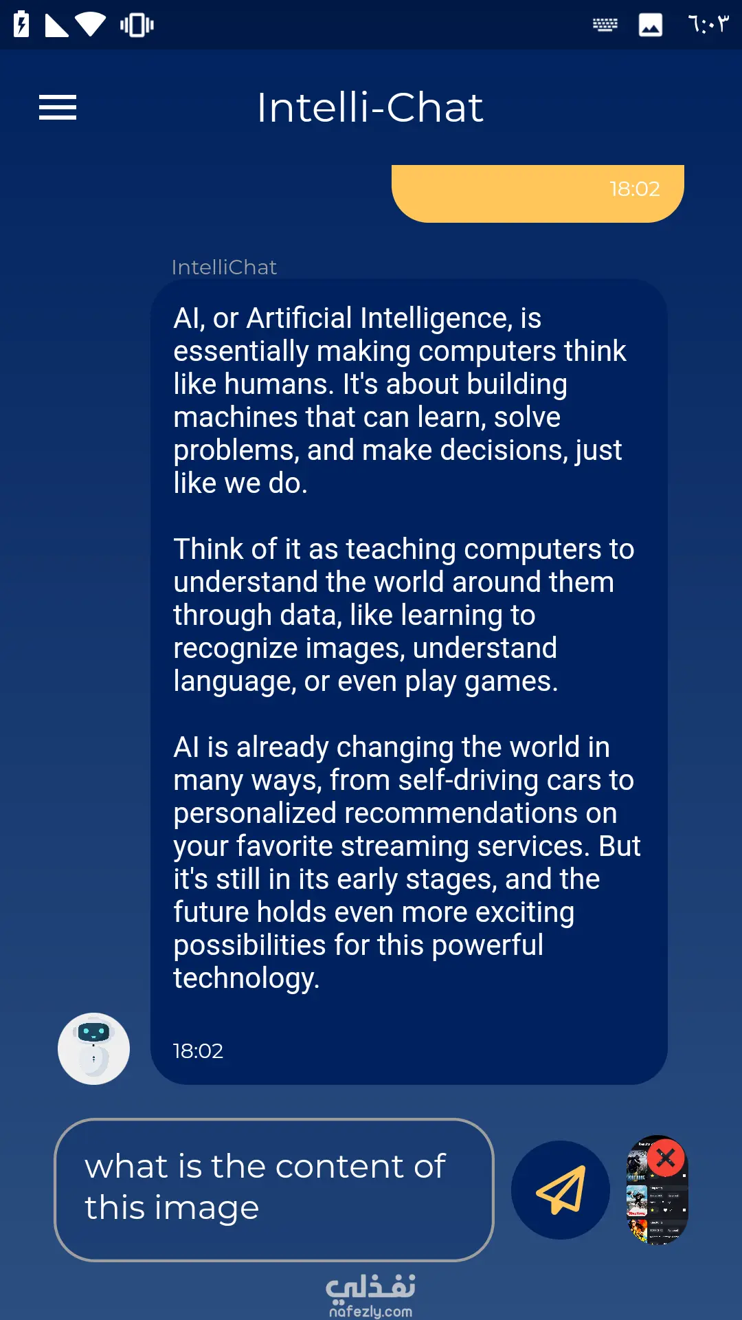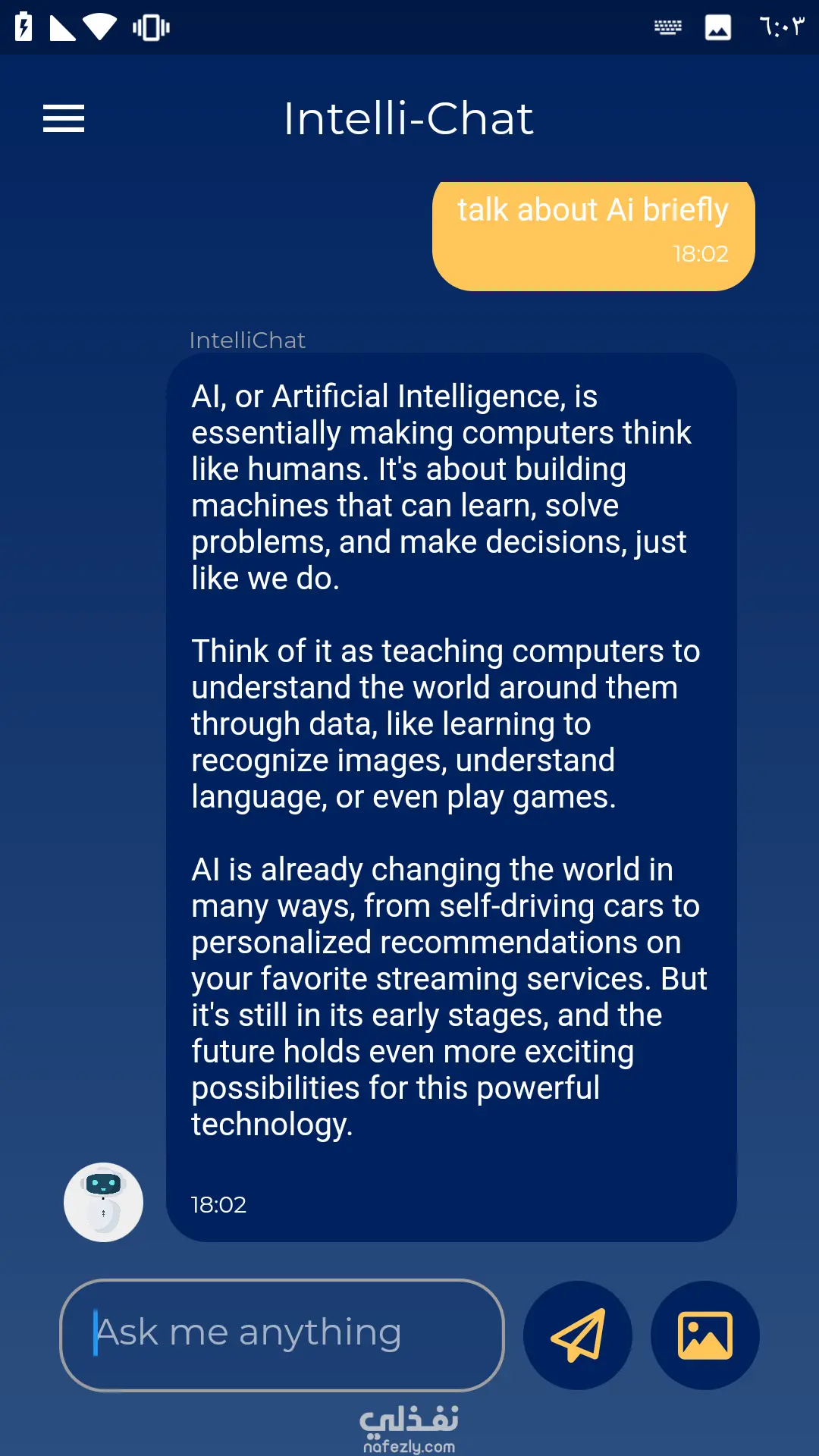 Intelli-Chat هو تطبيق موبايل متقدم مصمم لتسهيل التواصل والتعاون، يعمل على Android وiOS. يوفّر التطبيق تسجيل دخول آمن باستخدام البريد الإلكتروني أو Google، ويتميز ببوت ذكي Gemini قادر على إجراء محادثات كاملة. يعتمد التطبيق على Firebase لإدارة المواضيع، تخزين الرسائل، وإدارة صور المستخدمين، مع واجهة حديثة وسهلة الاستخدام.