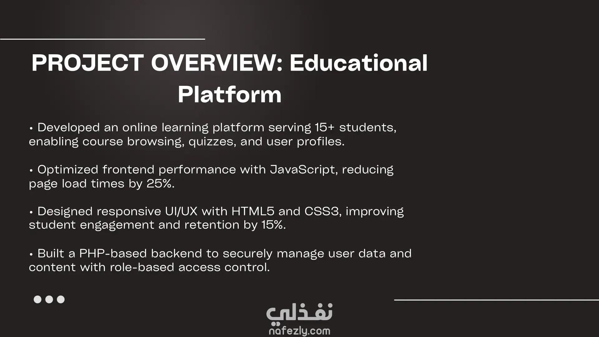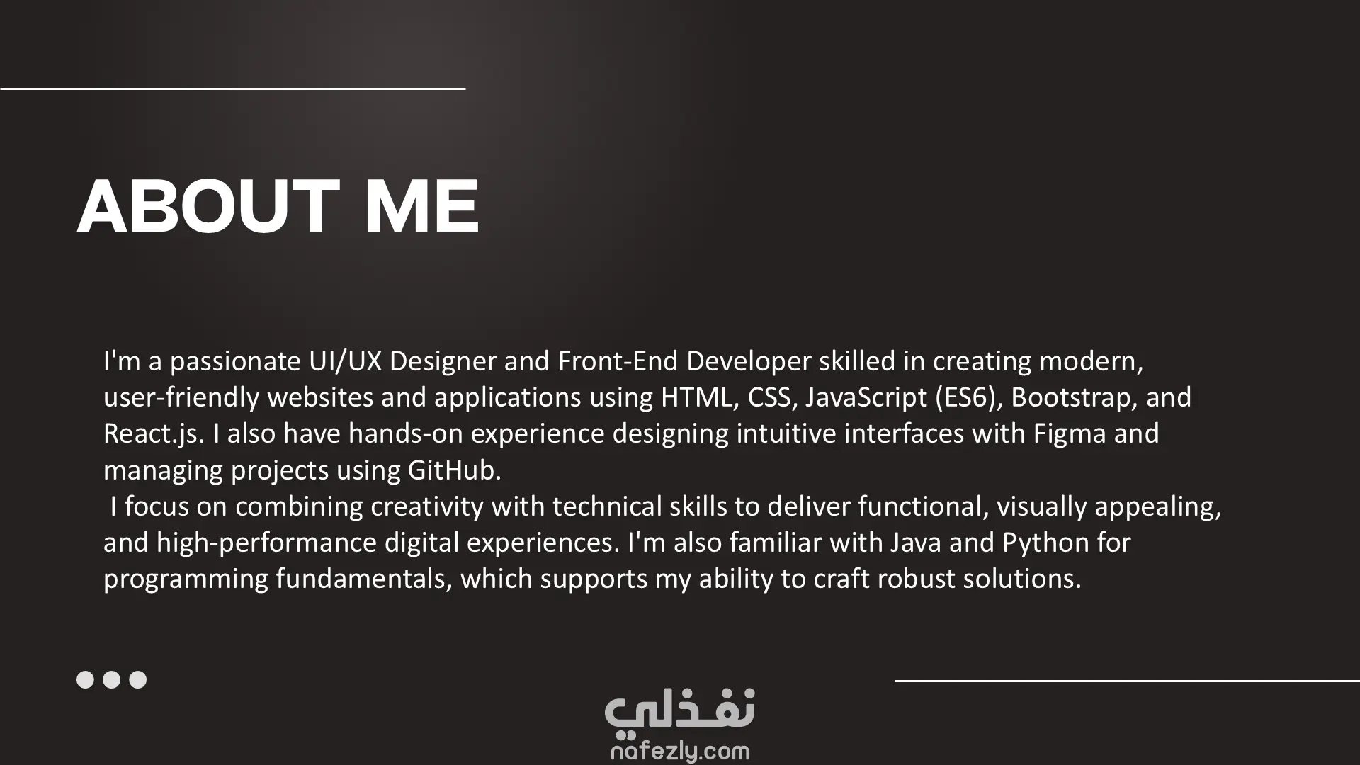 تصميم بورتفوليو شخصي بواجهة عصرية وبسيطة، يركّز على تجربة المستخدم وسهولة التصفح. التصميم معمول علشان يبرز الأعمال والمهارات بشكل احترافي، مع تنظيم واضح للأقسام واستجابة كاملة على كل الشاشات.