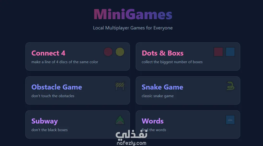 موقع العاب خفيفة للتسلية تم انشاءه بواسطة HTML 5 - CSS3 - JAVA Script يضم الموقع العديد من الالعاب الخفيفة و التي تعيد الذكريات الي جيل 90s و التي توضح بعض المفاهيم للjava script و CSS