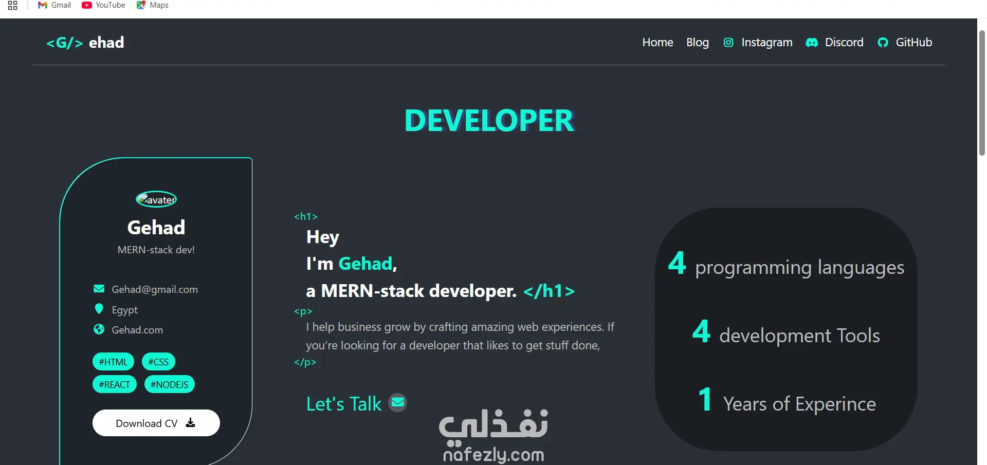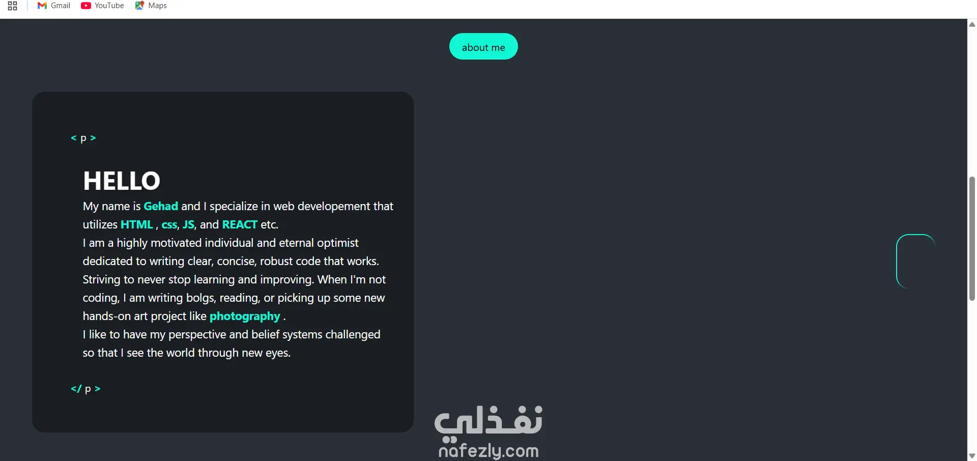 تصميم وتطوير موقع إلكتروني شخصي لعرض الخبرات والمهارات التقنية بشكل تفاعلي وعصري. يهدف المشروع إلى تقديم الهوية المهنية للمطور بطريقة تدمج بين الجمالية البصرية وبين الدقة البرمجية، مع التركيز على تجربة مستخدم سلسة (UX) وتصميم متجاوب تماماً (Responsive Design) واجهة مستخدم عصرية: استخدام نظام الألوان الداكن (Dark Theme) مع توزيع مريح للعناصر يعكس الاحترافية. هوية بصرية برمجية: دمج وسوم البرمجة (مثل <h1>, <p>) داخل التصميم لإضفاء طابع تقني فريد يبرز تخصصي كمطورة. هيكلة متكاملة: يحتوي الموقع على أقسام مخصصة لـ (التعريف الشخصي، المهارات التقنية، روابط التواصل الاجتماعي، ومعرض المهارات). تفاعلية عالية: تصميم أزرار واضحة لاتخاذ إجراء (Call to Action) مثل زر "تحميل السيرة الذاتية" وزر "لنبدأ التحدث".
