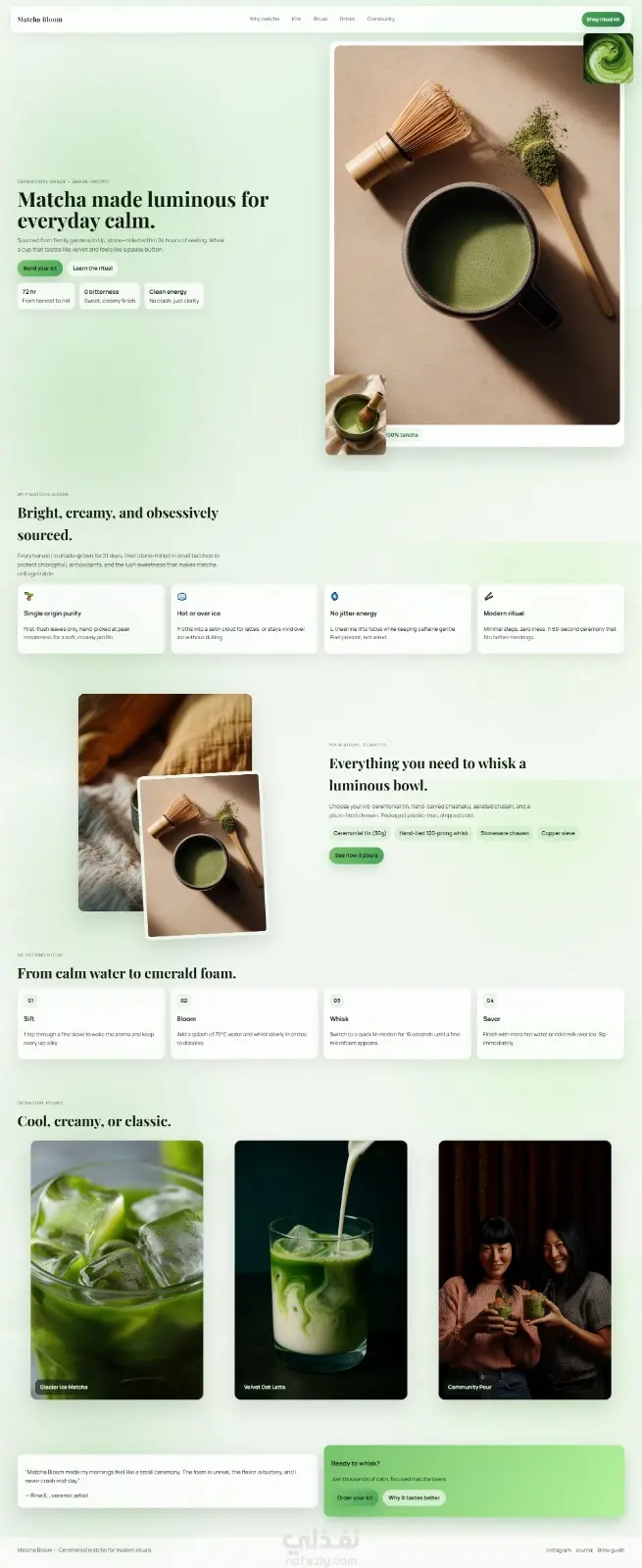 تصميم وتطوير صفحة هبوط (Landing Page) عصرية لعلامة تجارية متخصصة في منتجات "الماتشا". يهدف المشروع إلى تقديم تجربة بصرية مريحة تعكس طبيعة المنتج، مع التركيز على تحويل الزوار إلى عملاء من خلال هيكلية مدروسة وعناصر تفاعلية جذابة.