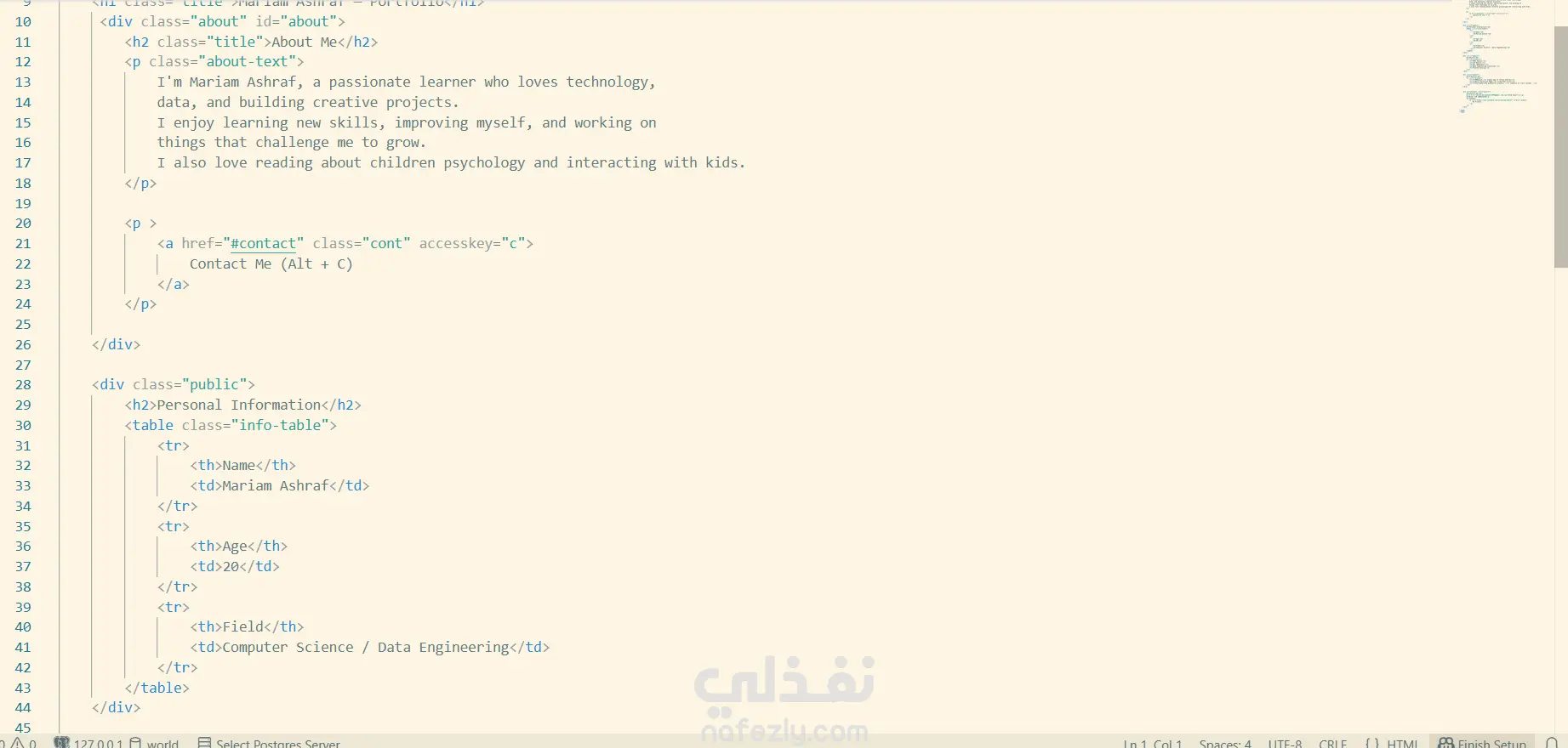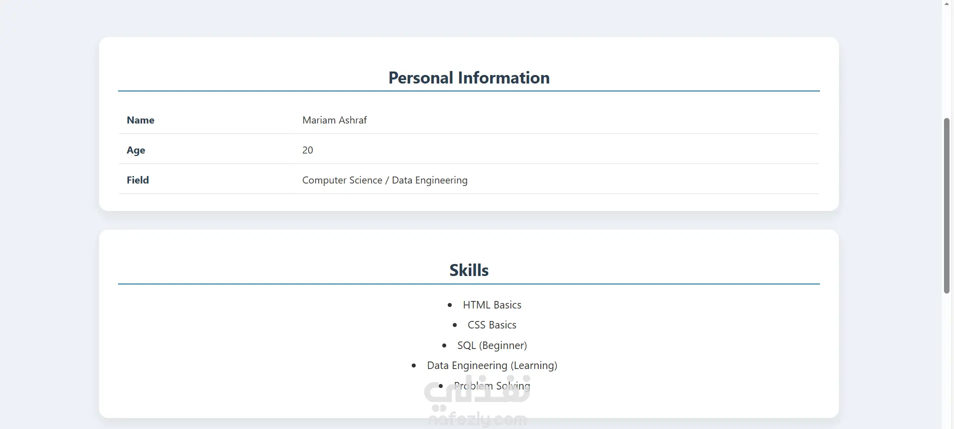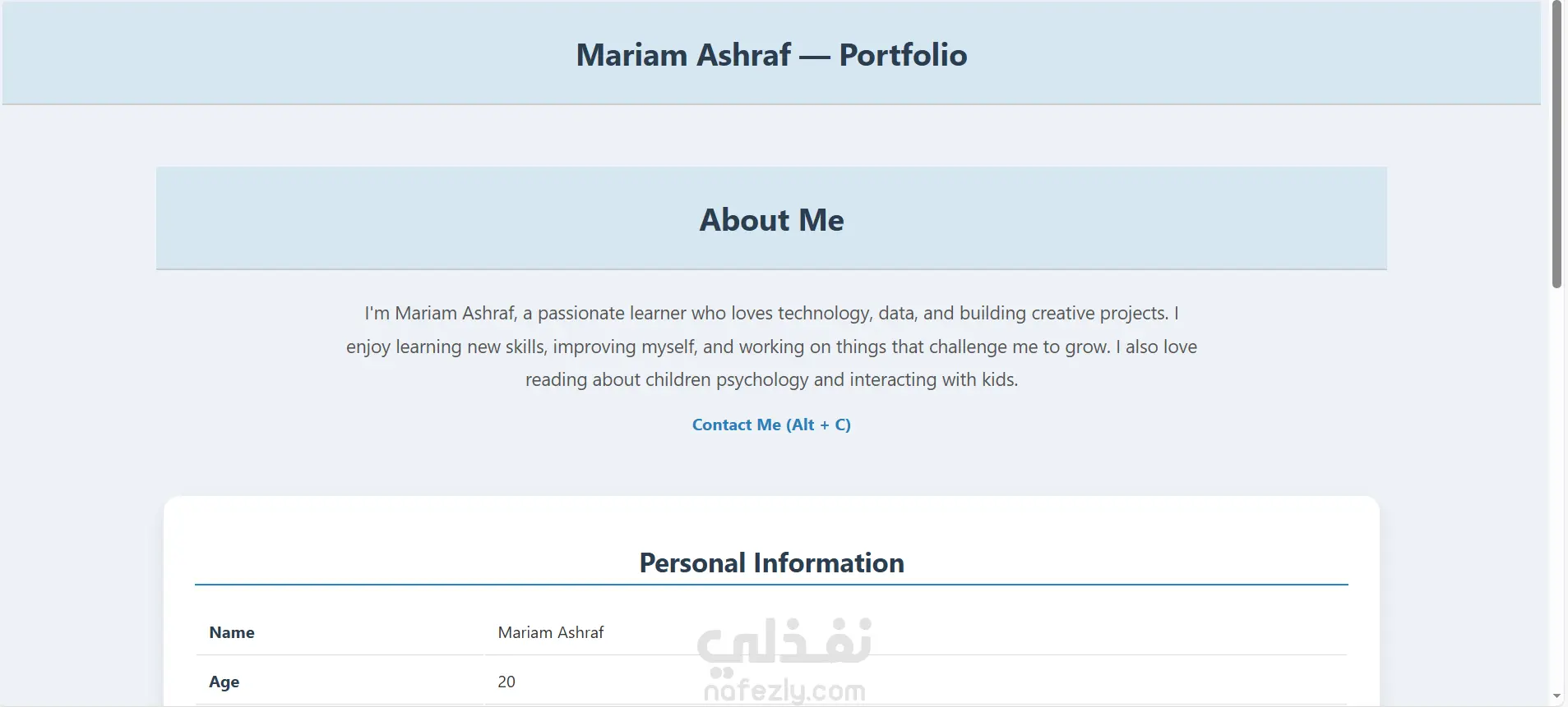 قمتُ بتصميم وتنفيذ موقع ويب يتكون من: صفحة ترحيب (Welcome Page) صفحة تسجيل مستخدم (Registration) مع التحقق من البيانات صفحة Portfolio لعرض الأعمال والمشاريع بشكل منظم