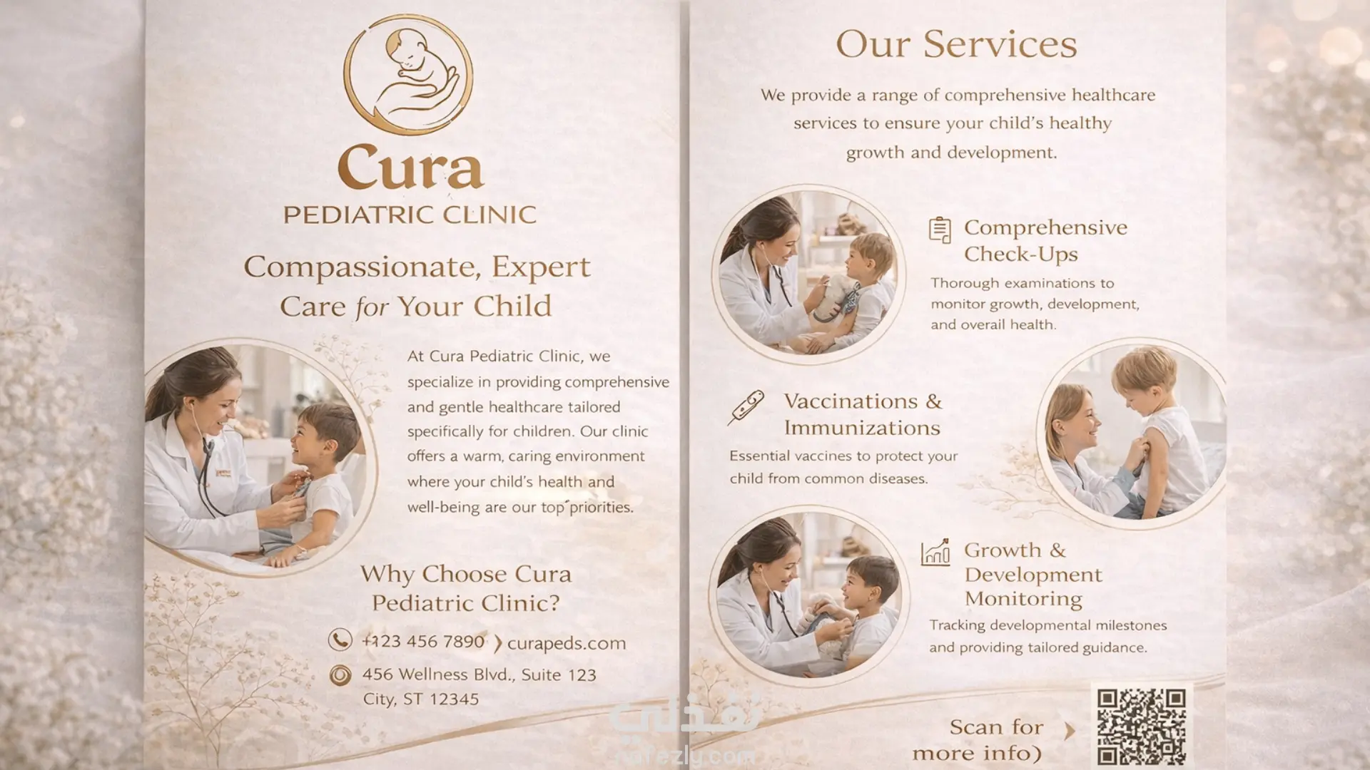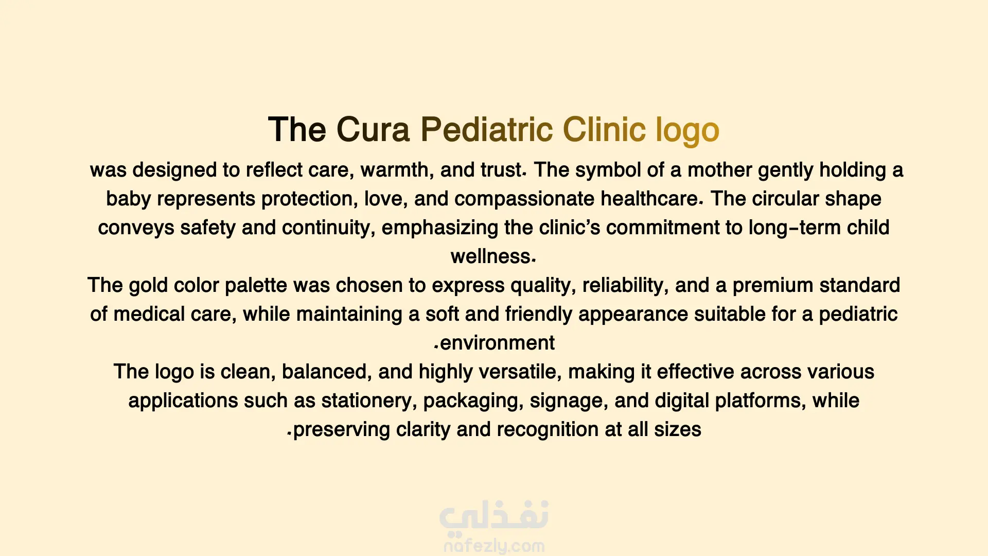 تم تصميم شعار Cura ليعبر عن العناية والدفء والثقة من خلال رمز الأم والطفل، والذي يرمز إلى الحماية والاهتمام بصحة الأطفال. يعتمد التصميم على شكل دائري ليعكس الأمان والاستمرارية في تقديم الرعاية الطبية. تم اختيار الألوان الهادئة لتعزيز الشعور بالطمأنينة والراحة النفسية، مما يجعل الشعار مناسبًا للاستخدام على المطبوعات، اللوحات الإعلانية، والمنصات الرقمية مع الحفاظ على وضوحه وقابليته للتطبيق في مختلف الأحجام.
