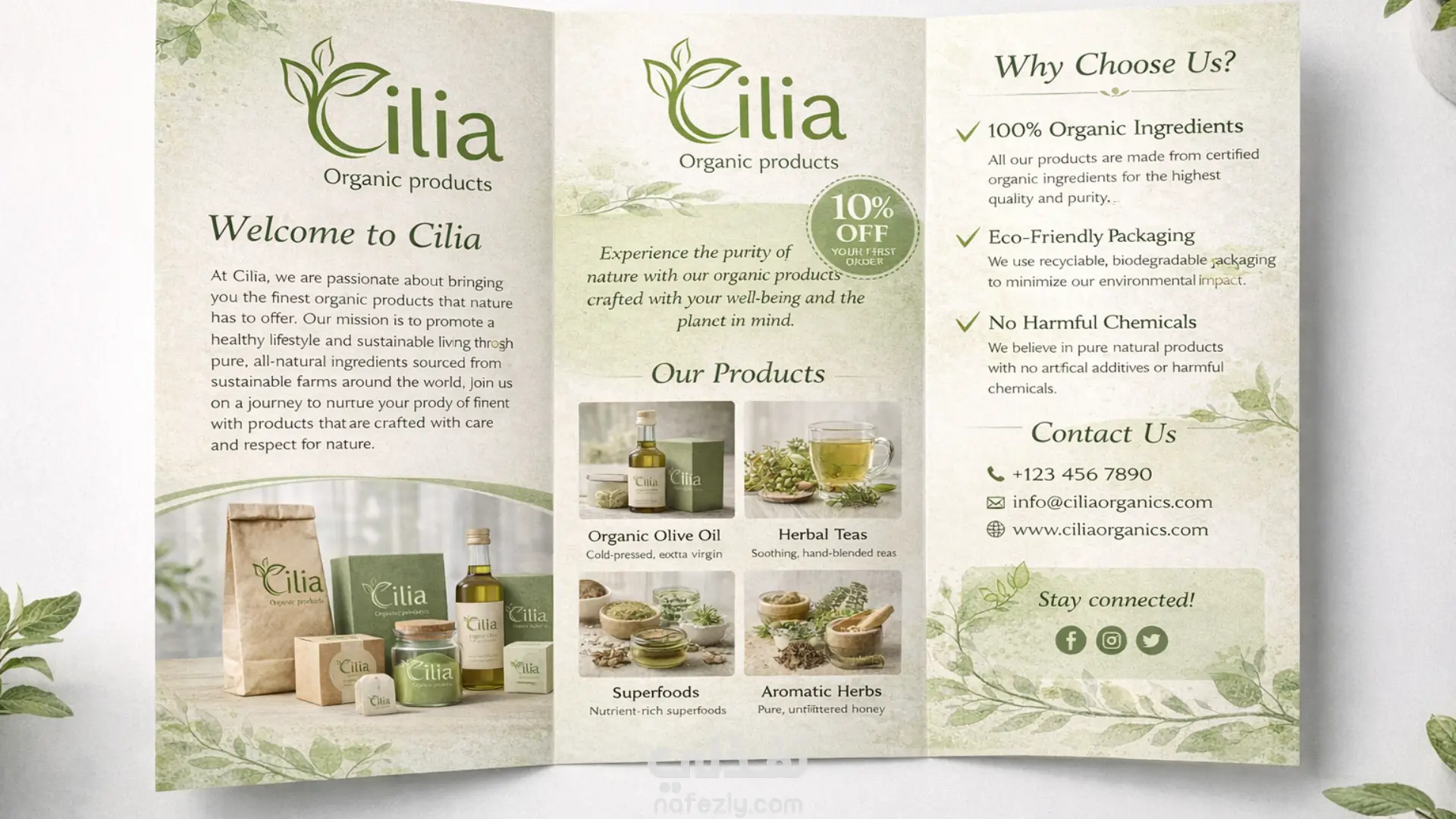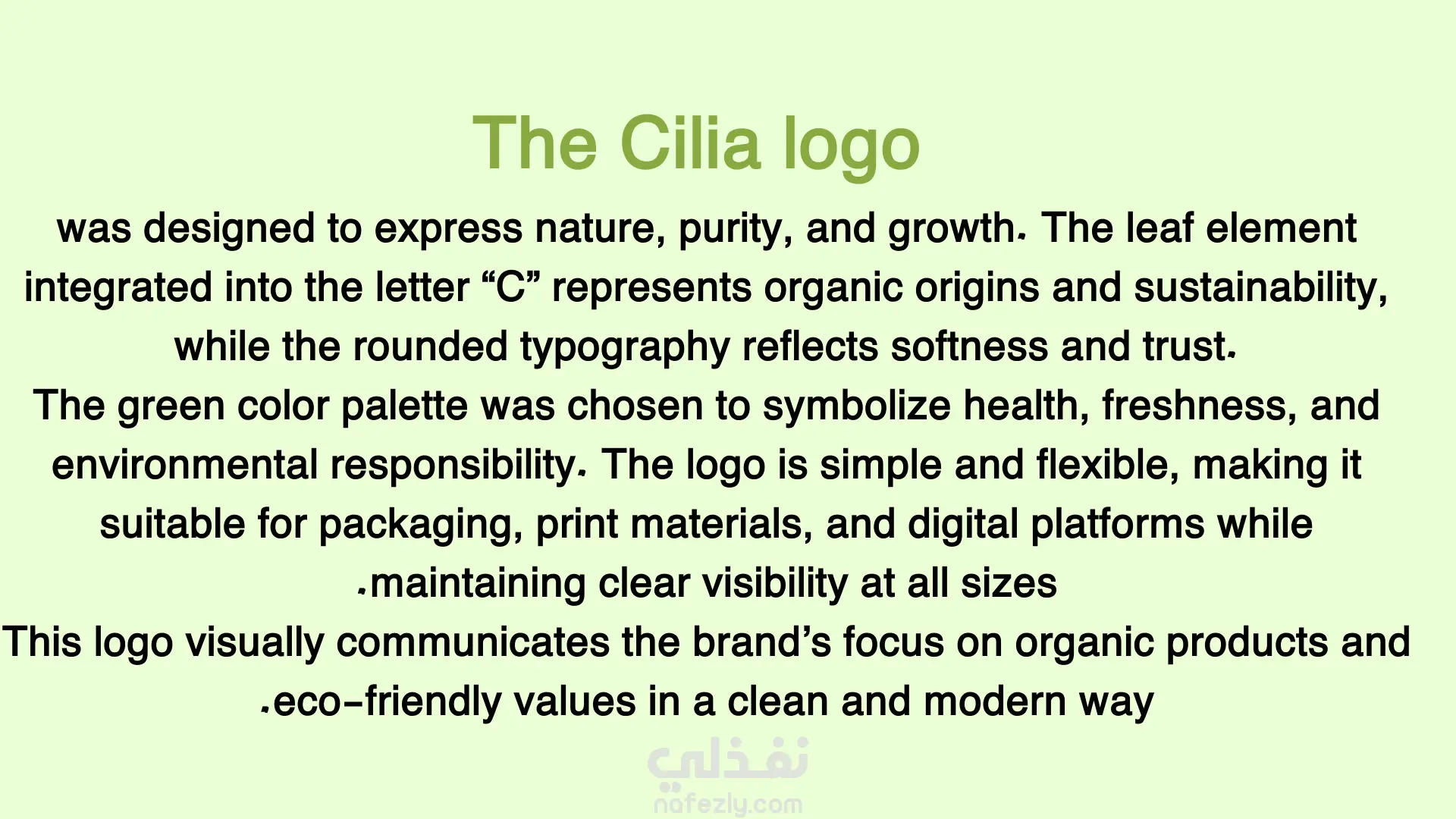 تم تصميم شعار Cilia ليعكس مفهوم الطبيعة والنقاء من خلال دمج رمز الورقة داخل الحرف، للدلالة على المنتجات العضوية والصديقة للبيئة. يعتمد التصميم على أسلوب بسيط وحديث يسهل تمييزه ويمنح العلامة التجارية حضورًا بصريًا واضحًا. تم اختيار الألوان الخضراء لتعبر عن الصحة والاستدامة، مما يجعل الشعار مناسبًا للاستخدام على العبوات، المطبوعات، والمنصات ا