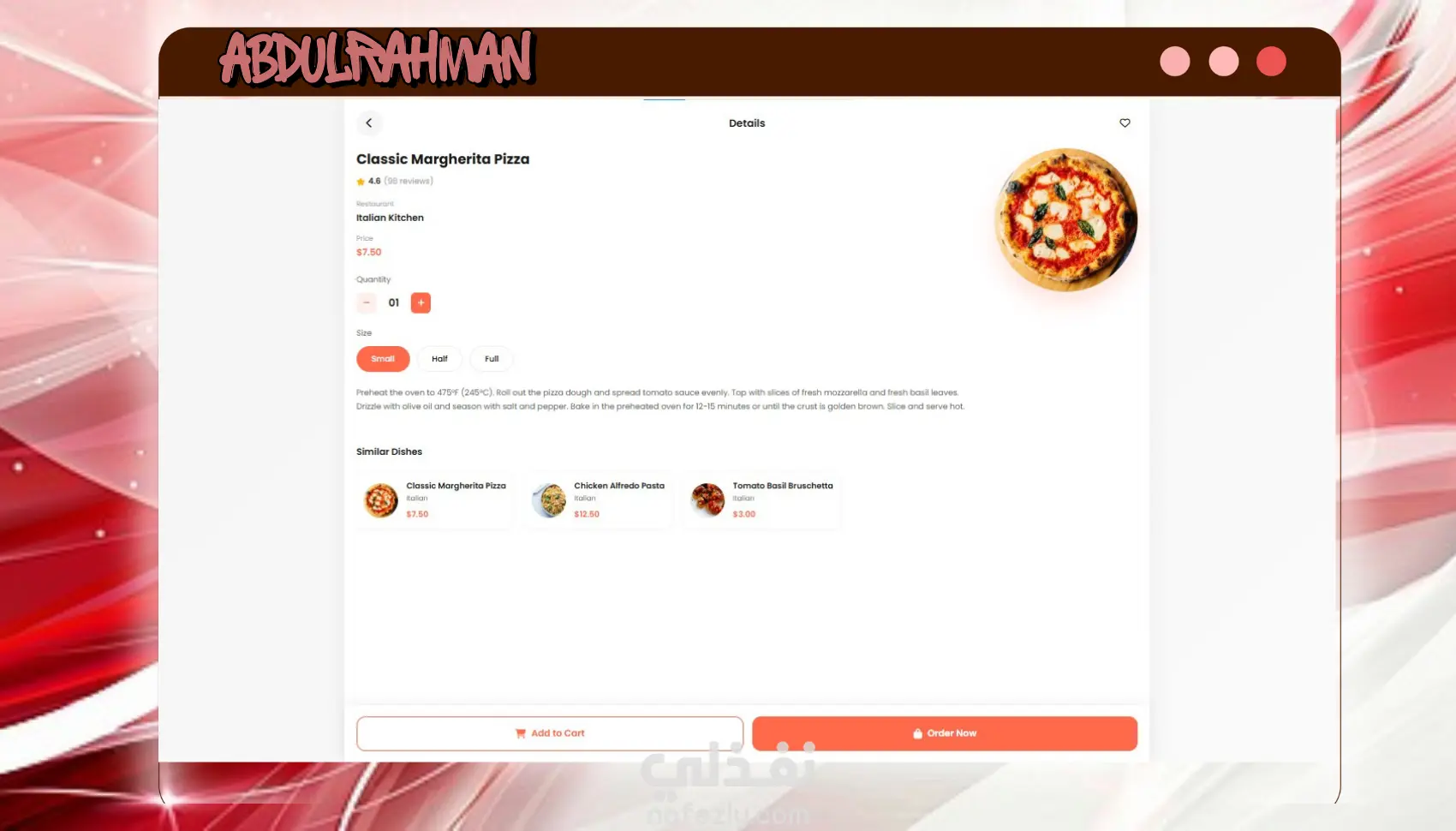 هل ترغب في امتلاك Restaurant Website يعرض مطعمك بصورة شهية واحترافية أمام العملاء؟ أقدّم لك خدمة تصميم موقع مطعم إلكتروني متكامل بأسلوب عصري، يساعدك على عرض المنيو، خدماتك، ومعلومات التواصل بطريقة منظمة وسهلة التصفح. سأقوم بإنشاء Responsive Restaurant Website متوافق مع جميع الأجهزة، سريع التحميل، ويمنح الزائر تجربة مستخدم User Experience سلسة ومميزة، ليشجّع العملاء على التواصل أو الطلب مباشرة.