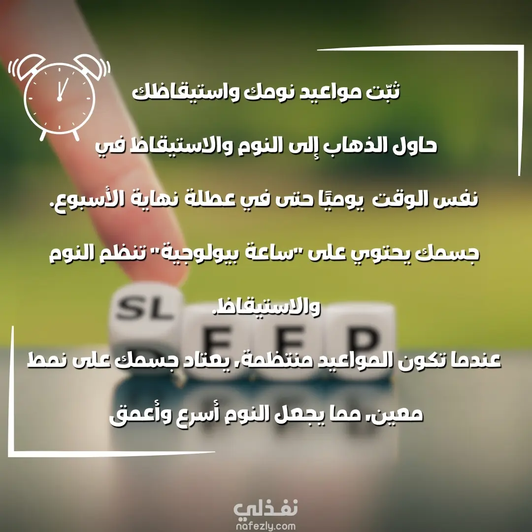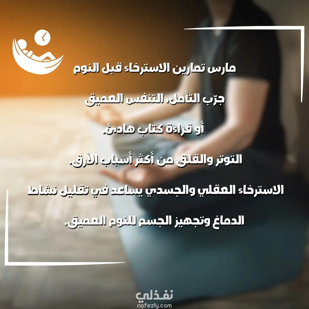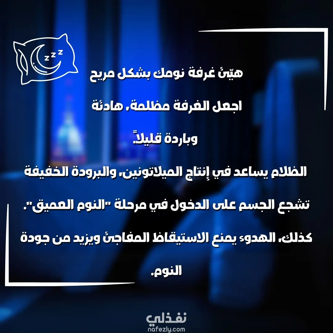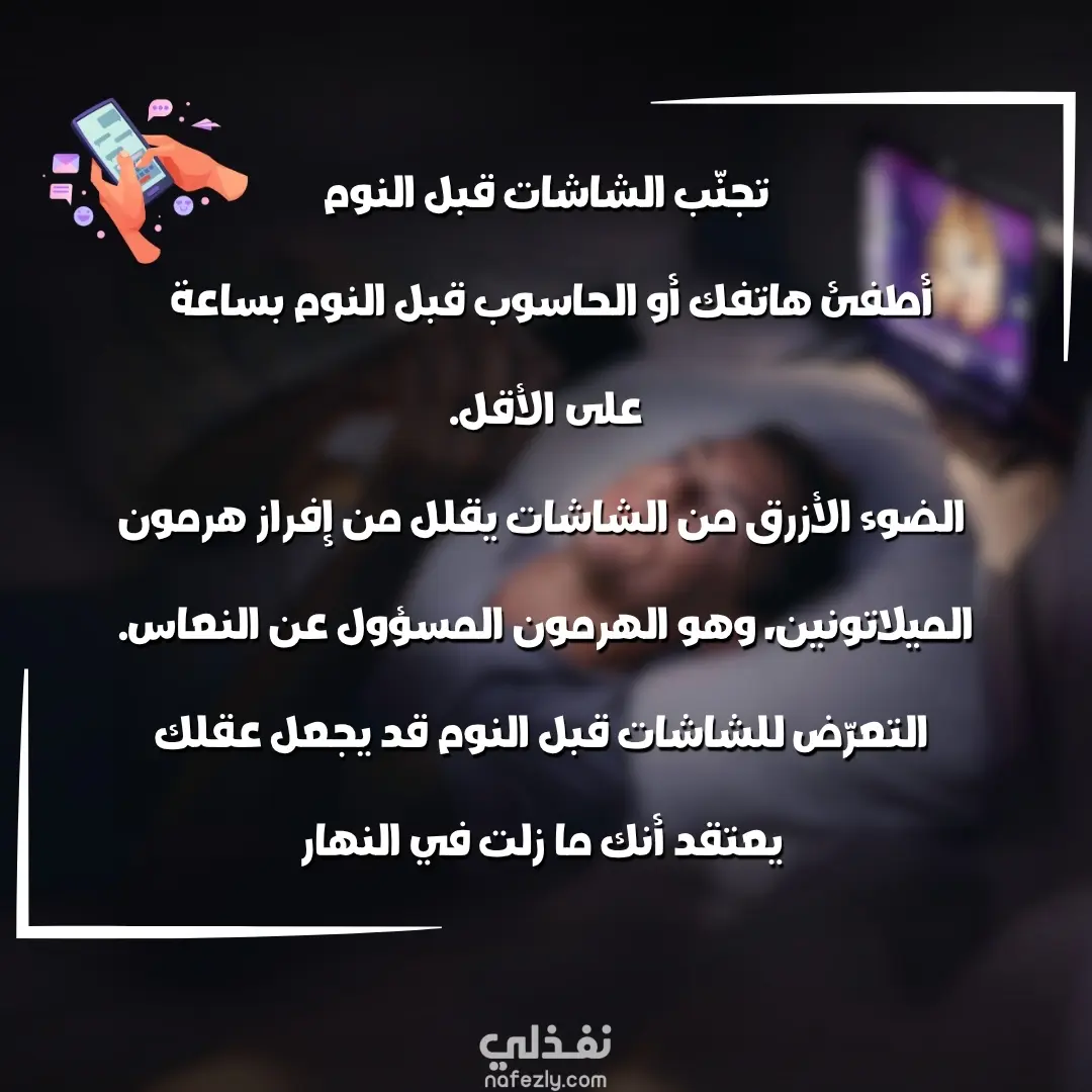 تصميم بوست سوشيال ميديا (كاروزال) مكوّن من ٥ شرائح للتوعية عن ضرورة النوم الصحي، كل شريحة فيها نصيحة بسيطة تساعد على تحسين جودة النوم.