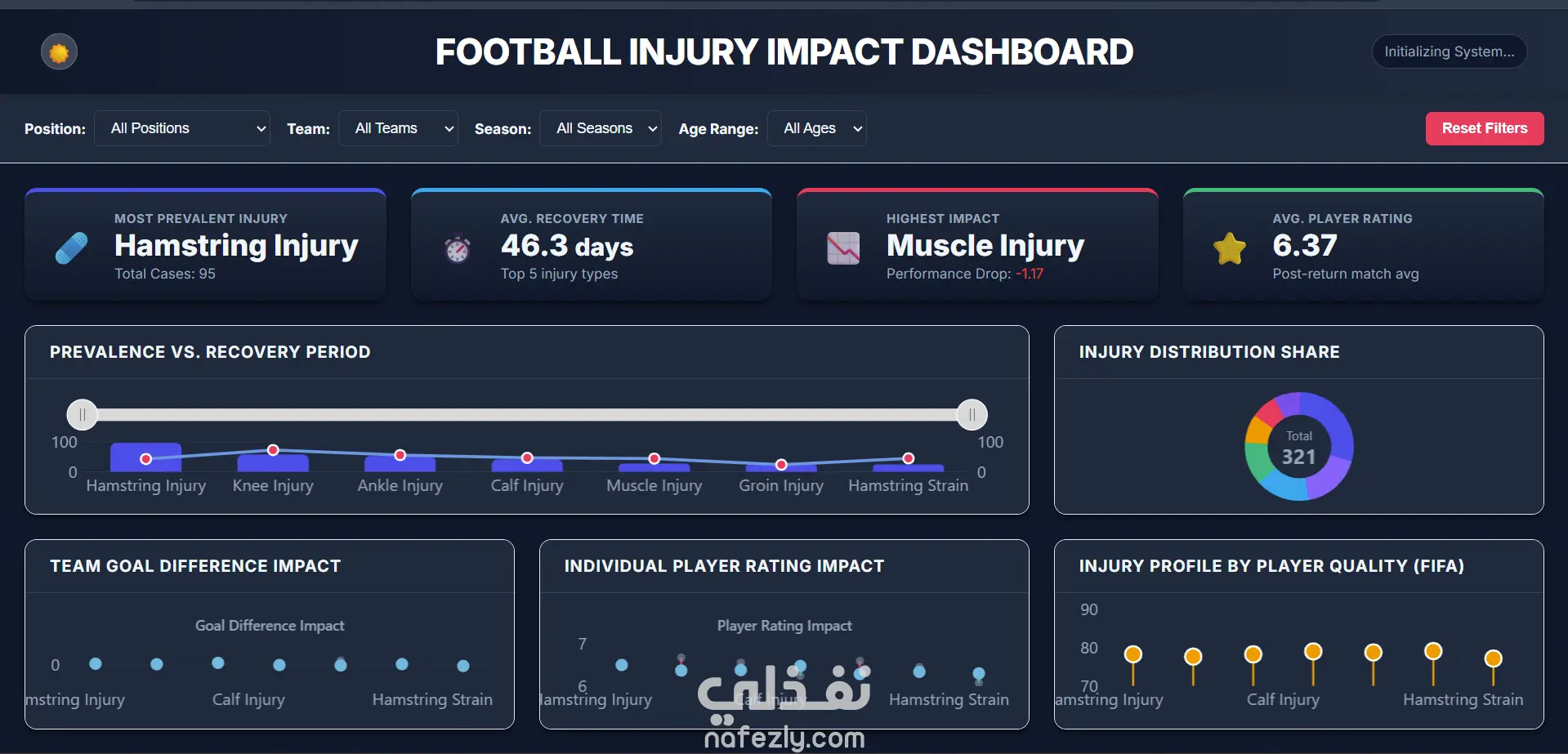 Interactive dashboard analyzing the impact of football injuries on player performance and team results. It explores injury prevalence, recovery time, performance drop, player ratings, and team goal difference using dynamic filters and visual insights.