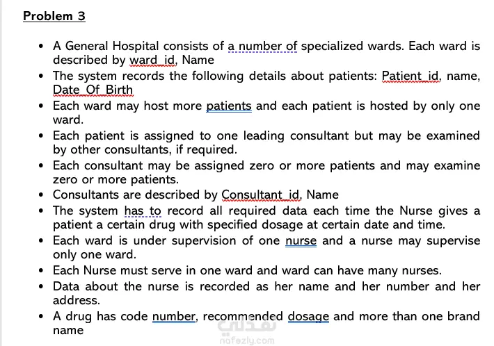 وصف المشروع: هذا المشروع عبارة عن محاكاة كاملة لبناء قاعدة بيانات خلفية (Backend) لنظام مستشفى عام. الهدف كان تحويل مجموعة من "قواعد العمل" (Business Rules) المعقدة والمتشابكة إلى مخطط بيانات (Schema) منظم وعالي الكفاءة، يضمن سلامة البيانات وسرعة الاستعلام. المهام التي قمت بإنجازها (المنهجية): تحليل المتطلبات وتصميم الـ ERD: قمت بدراسة العلاقات بين الكيانات (Entities) بدقة لتحديد أنواع العلاقات (1:1, 1:M, M:N). تمثيل العلاقة المعقدة بين المرضى والاستشاريين، حيث قمت بالفصل بين "الاستشاري المسؤول" (Leading - علاقة 1:M) و"الاستشاري الفاحص" (Examining - علاقة M:N). حل معضلة الإشراف التمريضي، بإنشاء علاقة (One-to-One) للممرضة المشرفة على العنبر، وعلاقة (One-to-Many) لطاقم التمريض. تصميم الجداول والعلاقات (Mapping & Normalization): تطبيق قواعد الترشيد (Normalization) لمنع تكرار البيانات. إنشاء جدول وسيط (Transaction Table) لتسجيل عملية "إعطاء الدواء" يربط بين (المريض، الممرضة، الدواء) مع تسجيل التاريخ والوقت والجرعة بدقة. معالجة الأسماء التجارية للأدوية كـ (Multivalued Attribute) في جدول منفصل. كتابة أكواد SQL (Implementation): كتابة جمل DDL لإنشاء الجداول مع تعريف المفاتيح الأساسية (PK) والأجنبية (FK) والقيود (Constraints) لضمان تكامل البيانات. استخدام SQL Server كبيئة عمل للتنفيذ. أبرز التحديات التي تم حلها في هذا التصميم: تتبع صرف الأدوية: النظام يسجل بدقة من (الممرضة) أعطى ماذا (الدواء) لمن (المريض) ومتى. هيكلة التمريض: التمييز بين دور الإشراف ودور الخدمة داخل العنابر. الأدوات المستخدمة: SQL Server Management Studio (SSMS). أدوات رسم مخططات البيانات (ERD Tools). T-SQL. النتيجة: قاعدة بيانات هيكلية قوية (Robust Structure) جاهزة للربط مع واجهات التطبيق، تضمن عدم تضارب البيانات وتسهل استخراج التقارير الطبية والإدارية.