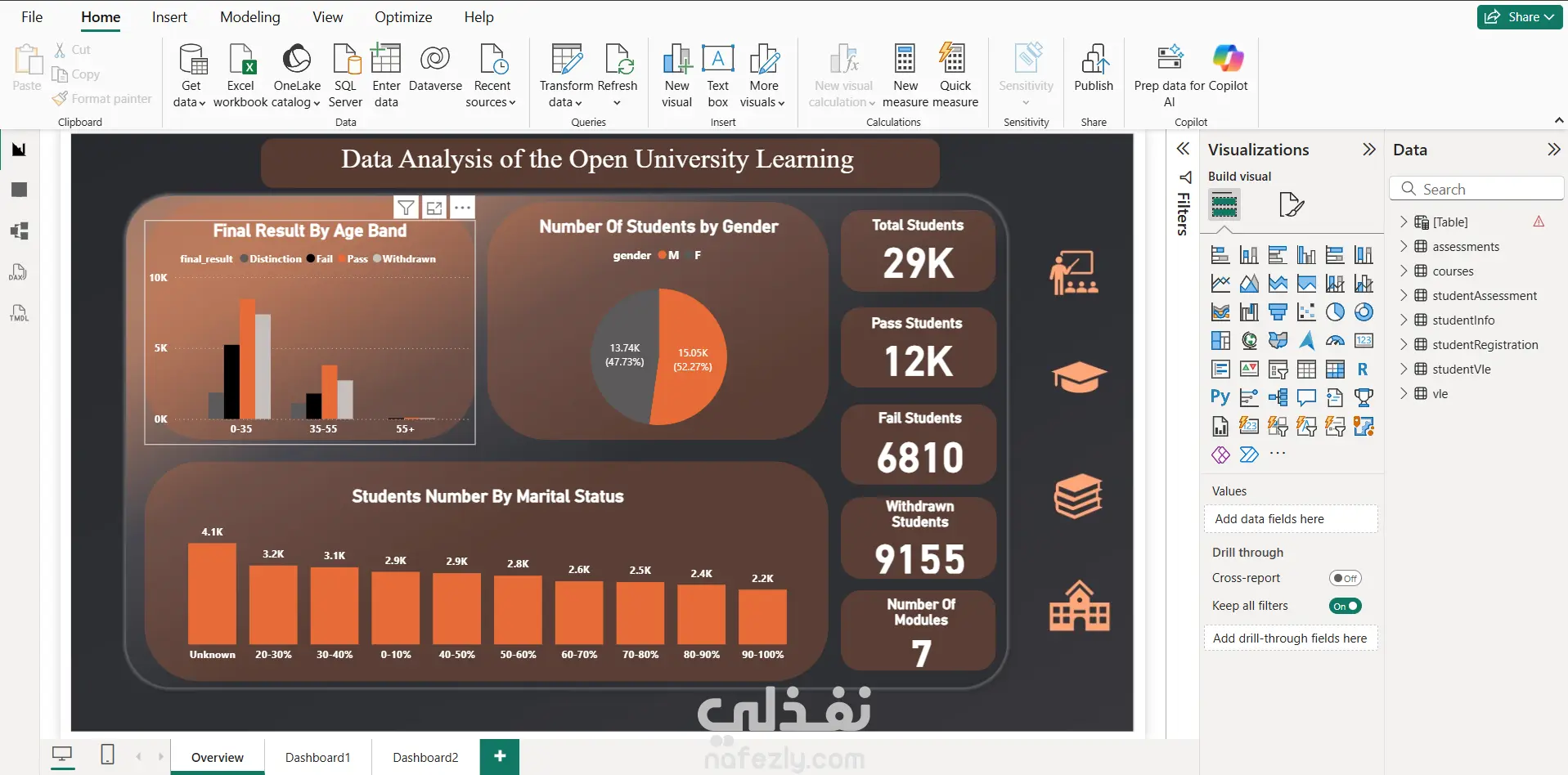 This project is a comprehensive Power BI dashboard developed to analyze and visualize Open University Learning data. The goal of the dashboard is to transform raw educational data into clear, actionable insights that support data-driven decision-making. 🔹 Project Objectives Analyze student performance and outcomes Understand student demographics and behavior Present key educational metrics in a clear and interactive format 🔹 Key Features Final Results Analysis by Age Band (Pass, Fail, Distinction, Withdrawn) Students Distribution by Gender Key Performance Indicators (KPIs): Total Students Passed Students Failed Students Withdrawn Students Students Distribution by Marital Status Overview of Number of Modules Interactive visuals for easy exploration and comparison 🔹 Tools & Technologies Used Power BI Data Modeling & Relationships DAX Measures Data Cleaning & Transformation Data Visualization Best Practices 🔹 Outcome The dashboard provides a clear overview of student performance and demographics, helping educational institutions and decision-makers quickly identify trends, strengths, and areas for improvement. The visual design focuses on simplicity, readability, and effective storytelling with data.
