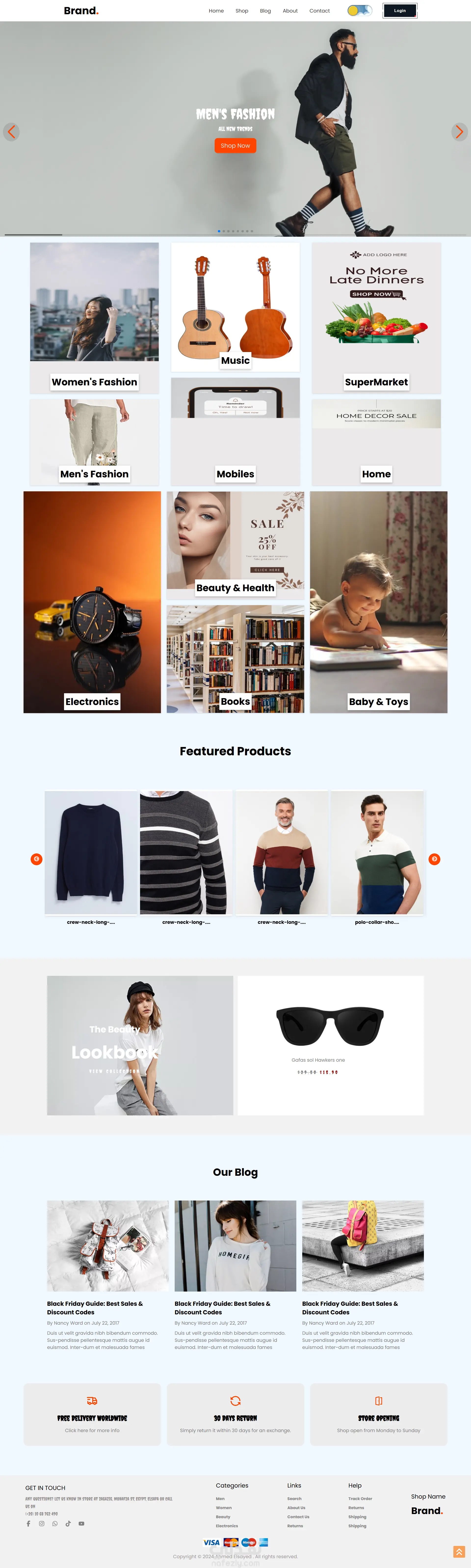 Brand Ecommerce هو تطبيق ويب متكامل للتجارة الإلكترونية تم تطويره باستخدام React.js مع دمج Axios للتعامل السلس مع واجهات برمجة التطبيقات (API). يوفر التطبيق جميع الخصائص الأساسية لأي متجر إلكتروني احترافي، مع تجربة استخدام سلسة وسريعة. 🔹 مميزات المشروع: نظام تسجيل ودخول كامل للمستخدمين (تسجيل – تسجيل دخول – إعادة تعيين كلمة المرور) سلة مشتريات محدثة بشكل لحظي قائمة مفضلة (Wishlist) لإضافة المنتجات تصفح المنتجات حسب الأقسام (الملابس، الكتب، مستحضرات التجميل) واجهة مستخدم تفاعلية باستخدام Swiper.js للسلايدرز تأثيرات وانتقالات سلسة باستخدام AOS دعم التخزين المحلي (Local Caching) لتحسين الأداء والعمل في وضع عدم الاتصال تحديث تلقائي لحالة السلة والمفضلة بدون إعادة تحميل الصفحة 🔹 التقنيات المستخدمة: React.js Axios Swiper.js AOS Local Storage 🔹 الفائدة للعميل: متجر إلكتروني جاهز وقابل للتوسع تجربة مستخدم سريعة وسلسة إدارة فعالة للمنتجات والمستخدمين أداء عالي واستجابة فورية للتفاعلات 📌 Brand Ecommerce مناسب لأي مشروع تجارة إلكترونية يبحث عن واجهة حديثة، أداء قوي، وتجربة مستخدم احترافية.