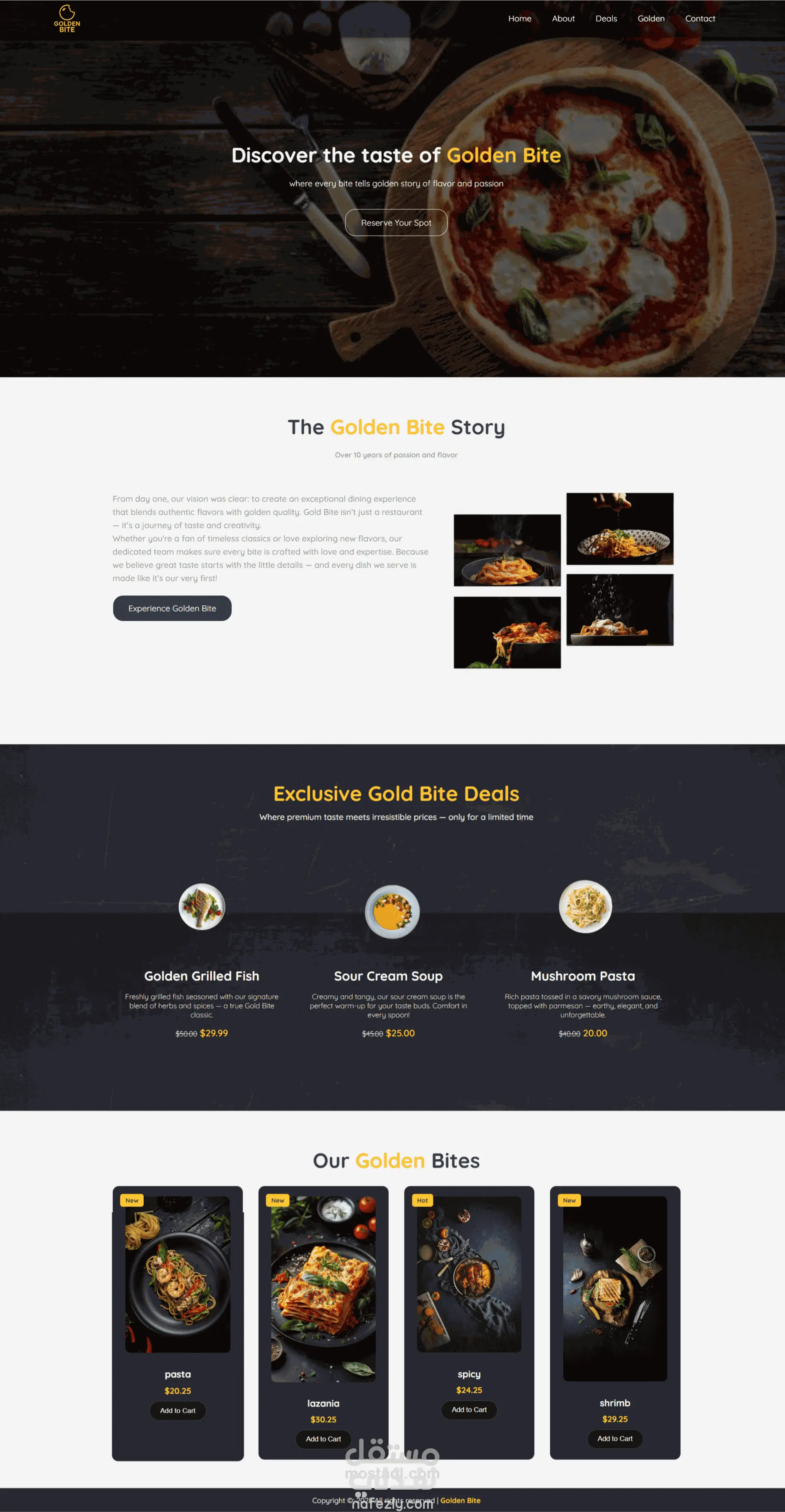 قمت بتصميم وتطوير صفحة هبوط (Landing Page) مخصصة لمطعم Golden Bite، مع التركيز على إبراز العروض الخاصة وقائمة الطعام بطريقة بصرية جذابة تعكس هوية العلامة التجارية الفريدة.