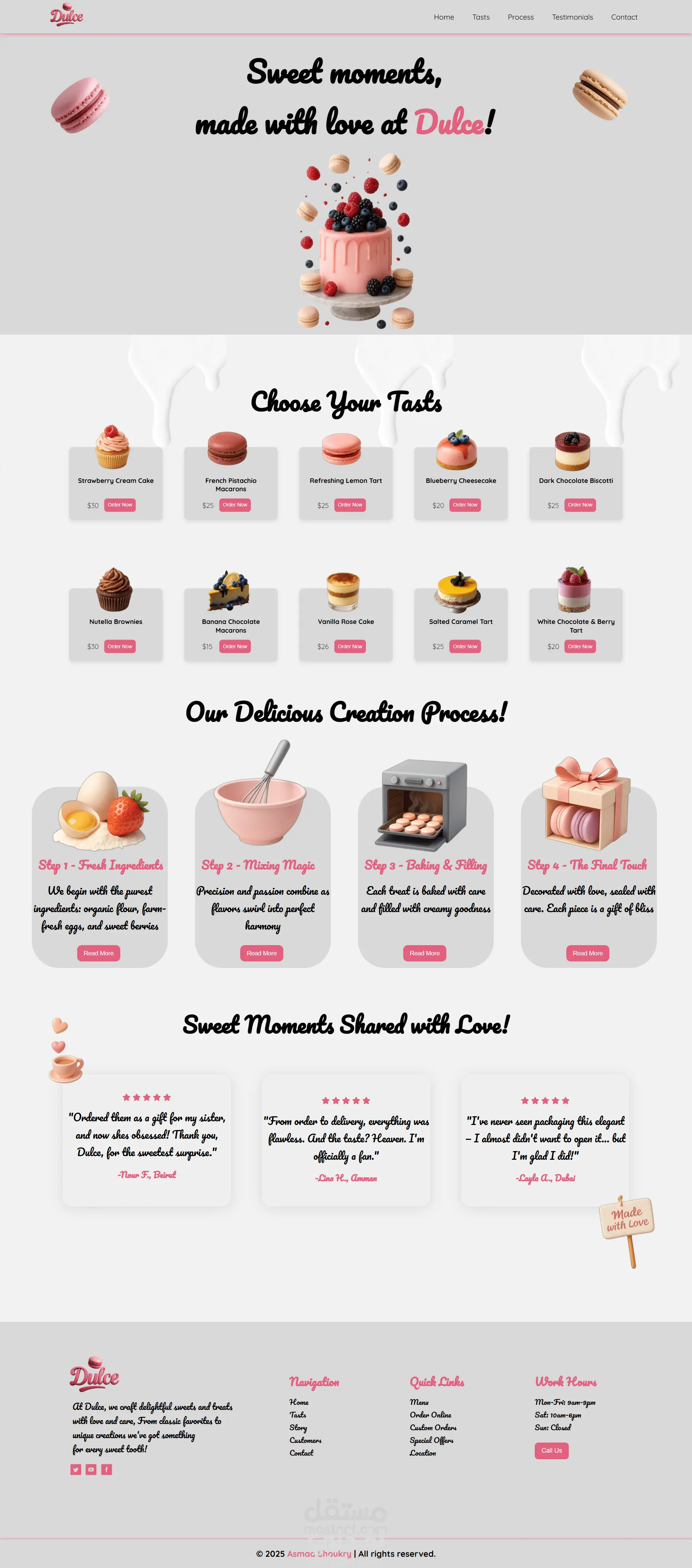 أقسام رئيسية: الصفحة الرئيسية، النكهات، خطوات التحضير، آراء العملاء، والتواصل.