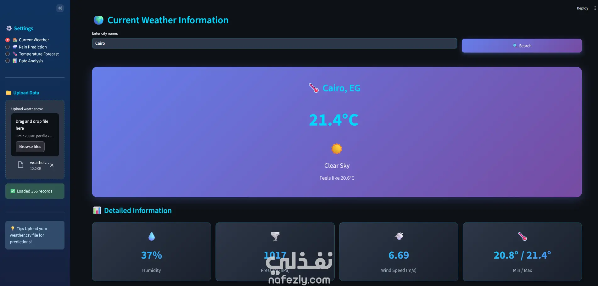 تم تطوير نموذج أولي لنظام تنبؤ بالطقس باستخدام تعلم الآلة يعتمد على بيانات تاريخية وبيانات لحظية من OpenWeather API للتنبؤ بدرجة الحرارة واحتمالية سقوط الأمطار لليوم التالي، ويستخدم النظام نماذج Random Forest للتصنيف والتنبؤ بعد تنظيف البيانات وترميزها وتقسيمها للتدريب والاختبار، ويهدف لإثبات إمكانية بناء نظام ذكي لدعم قرارات التنبؤ بالطقس مع دمج التنبؤات اللحظية لزيادة الدقة وعرض النتائج بشكل واضح للمستخدمين.