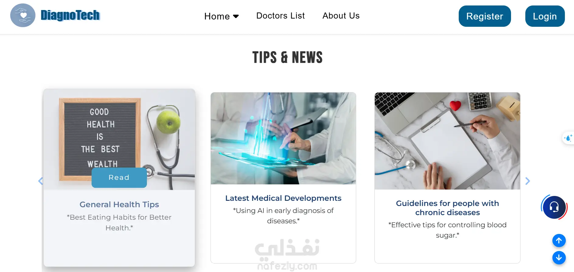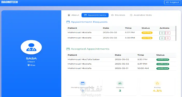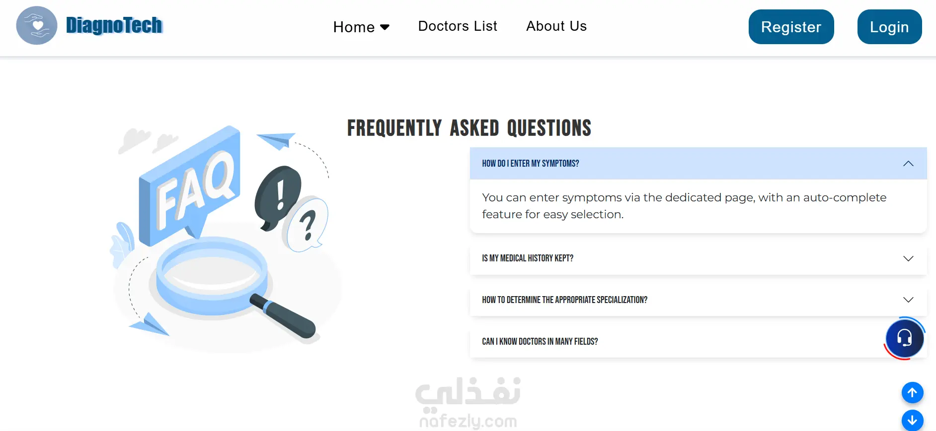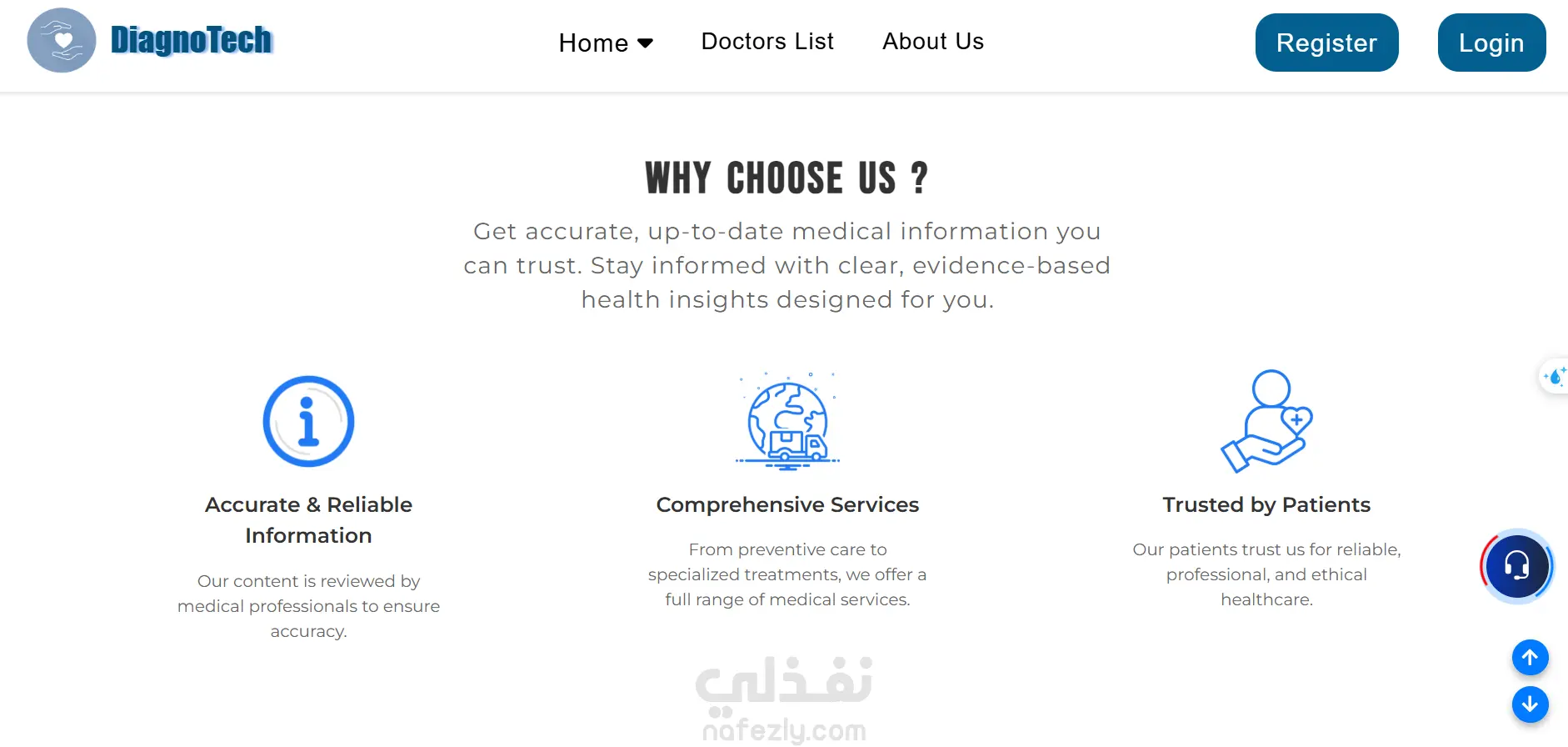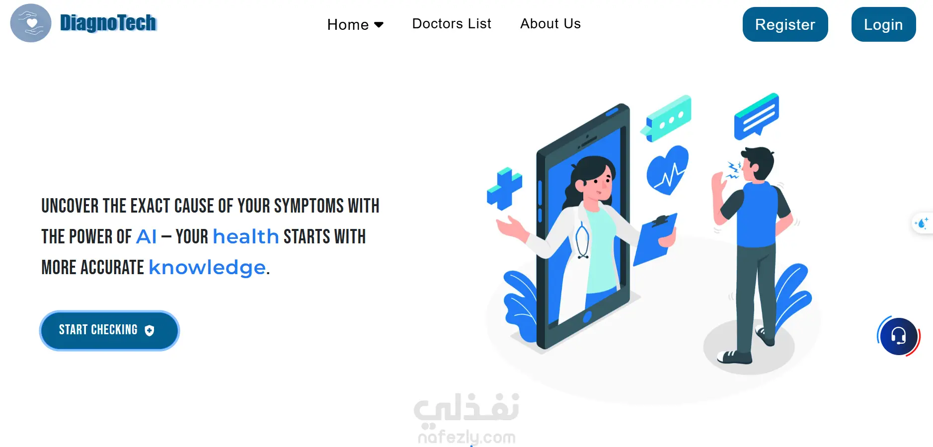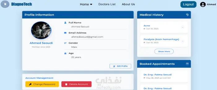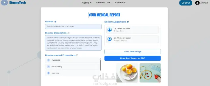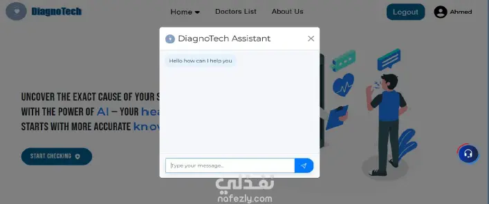 منصة طبية ذكية تتيح للمستخدمين إنشاء حساب، إدخال الأعراض، والحصول على تقرير بالمرض المحتمل مع نصائح للوقاية، ويتم حفظ النتائج في السجل الطبي داخل الملف الشخصي. كما توفر المنصة ترشيح أطباء متخصصين مع إمكانية الحجز، إلى جانب شات بوت للإجابة على الأسئلة الطبية فقط تحتوي أيضًا على لوحة تحكم لإدارة المستخدمين، الأطباء، والمشرفين.