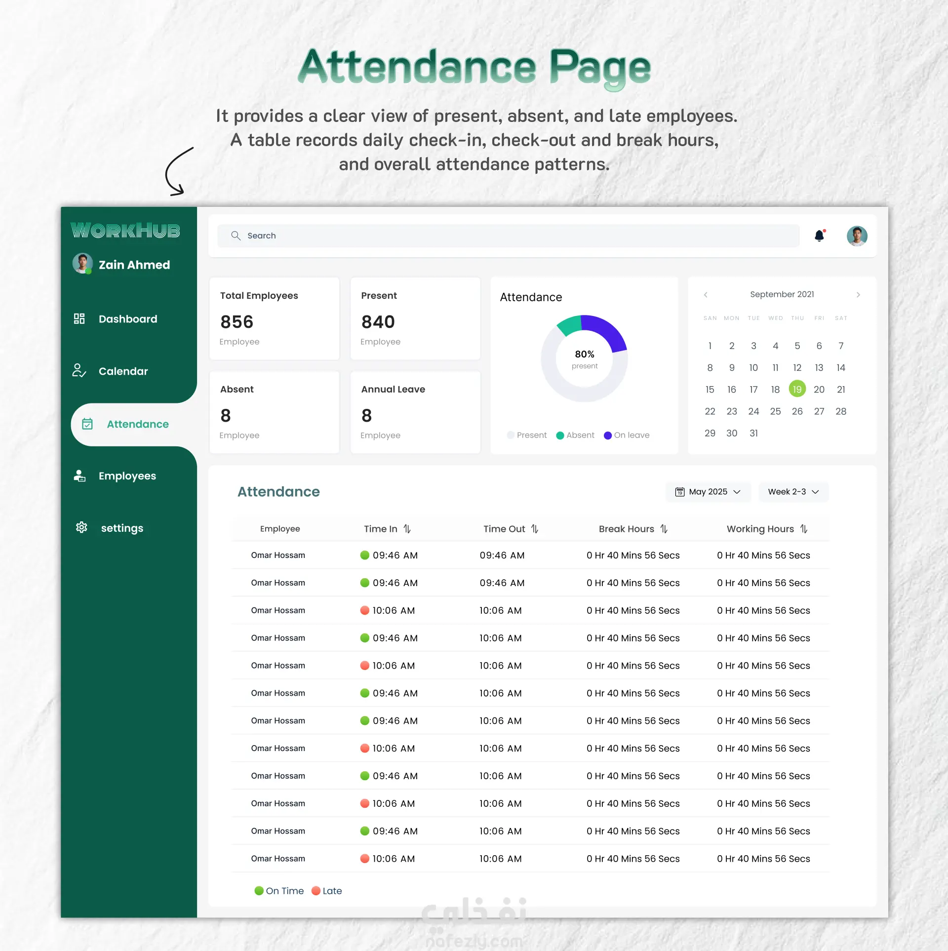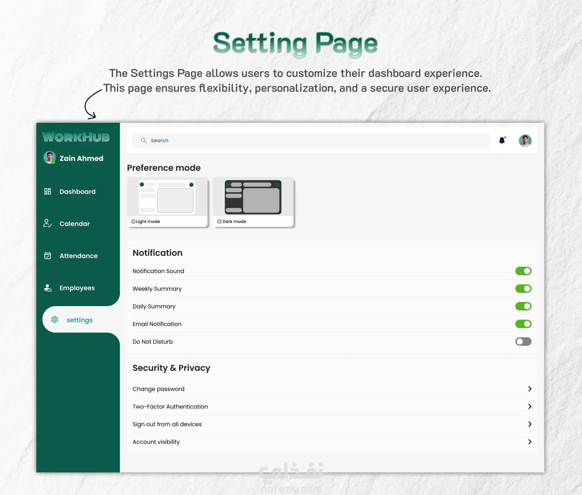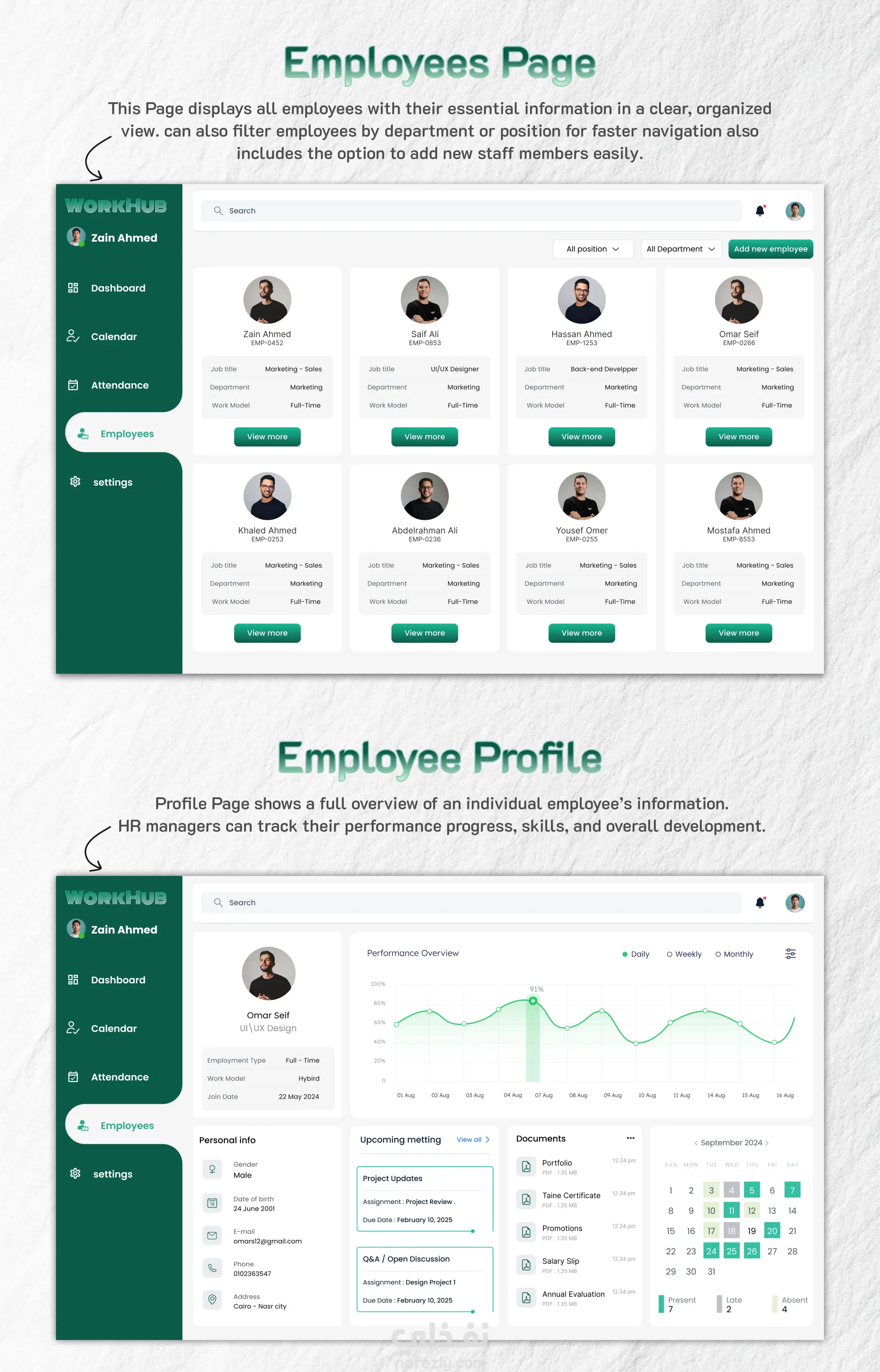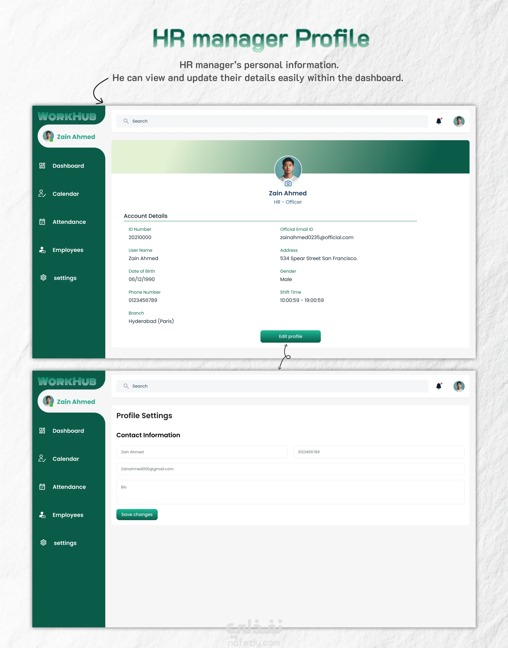 تصميم Web Dashboard مخصصة لإدارة الموارد البشرية (HR Manager)، تهدف إلى تسهيل متابعة شؤون الموظفين وتنظيم البيانات واتخاذ قرارات أسرع وأكثر دقة. يركّز التصميم على: تجربة مستخدم بسيطة وواضحة تسهّل على مسؤول الـ HR التنقّل بين الأقسام عرض البيانات والإحصائيات بشكل منظم وسهل القراءة هيكل مرن يساعد على متابعة الموظفين، الحضور، الأداء، والإجازات تصميم عصري متوافق مع معايير UI/UX الحديثة قابلية التطوير والربط مع أنظمة مختلفة مستقبلًا تم الاهتمام بتصميم الواجهة من حيث الوضوح، التسلسل البصري، وسهولة الاستخدام، مع مراعاة احتياجات مدير الموارد البشرية في بيئة العمل اليومية.
