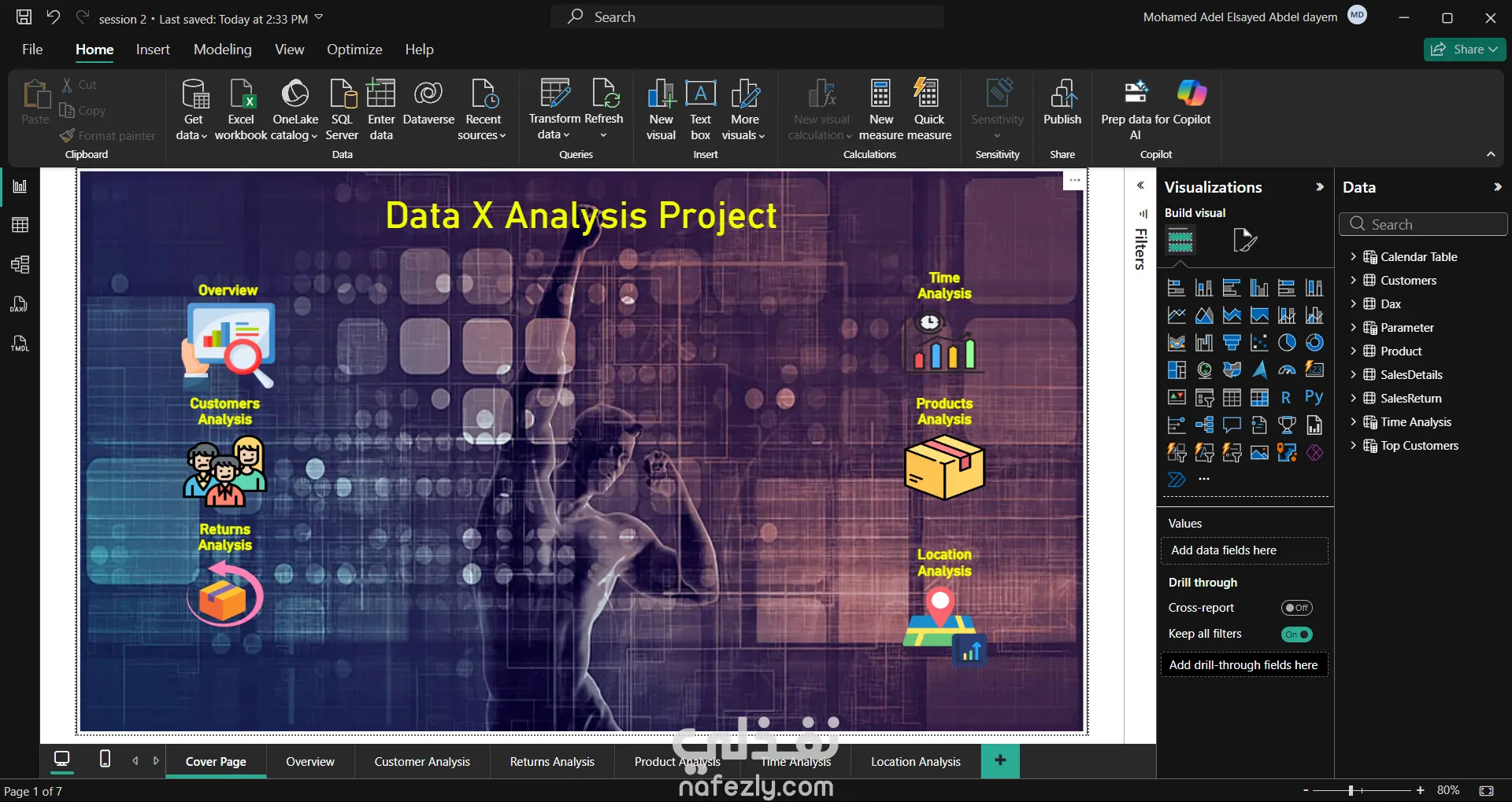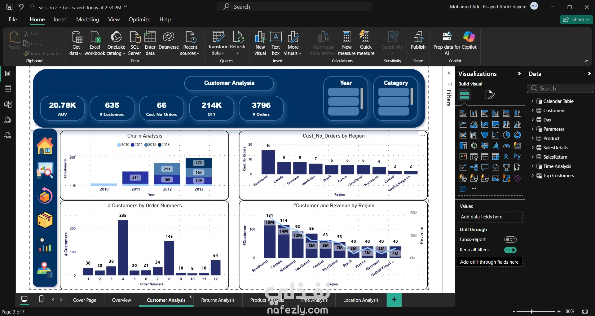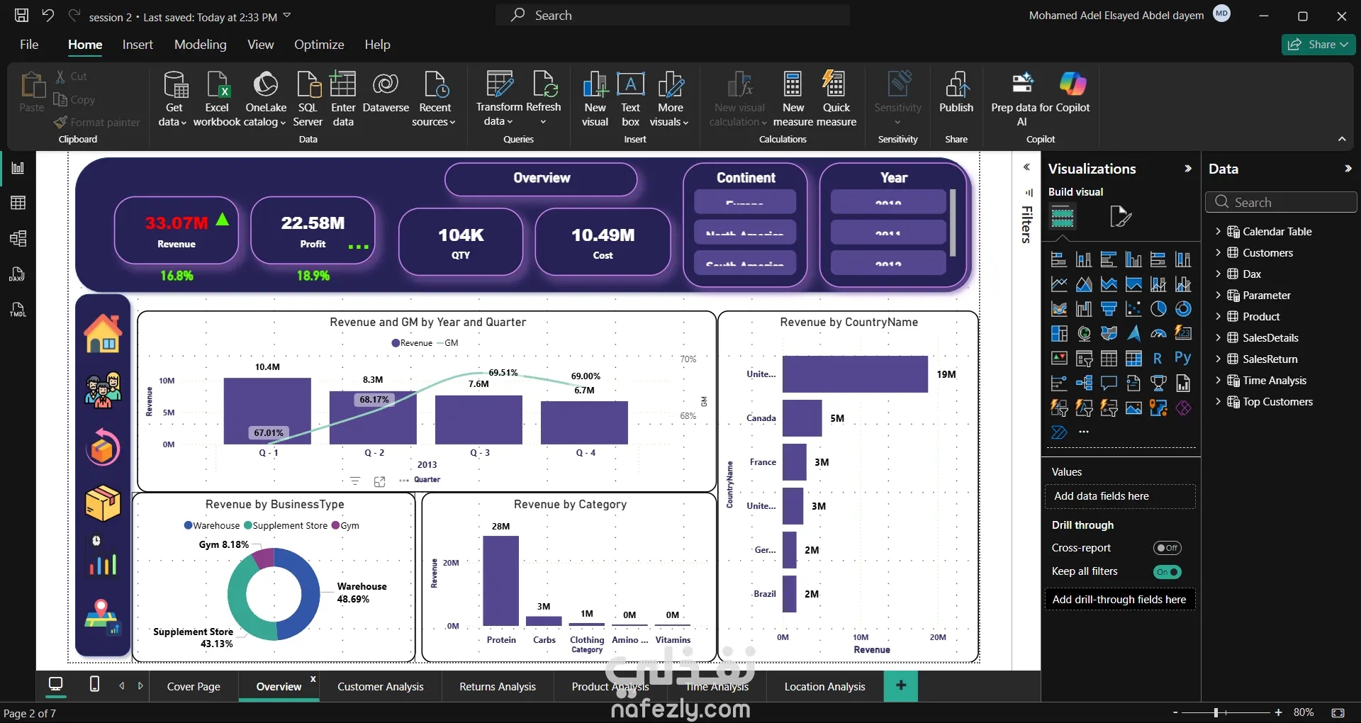 مشروع تحليل بيانات احترافي لإدارة الجيم، يركز على تحليل العملاء، الإيرادات، الأرباح، الطلبات، المنتجات، المرتجعات، الأداء الزمني والتوزيع الجغرافي من خلال لوحات تحكم تفاعلية. تم استخدام Power BI في التصميم، و Power Query لتنظيف ومعالجة البيانات، و DAX لبناء مؤشرات أداء رئيسية تساعد على اتخاذ قرارات إدارية مبنية على البيانات.