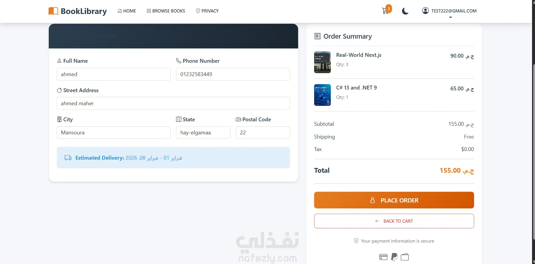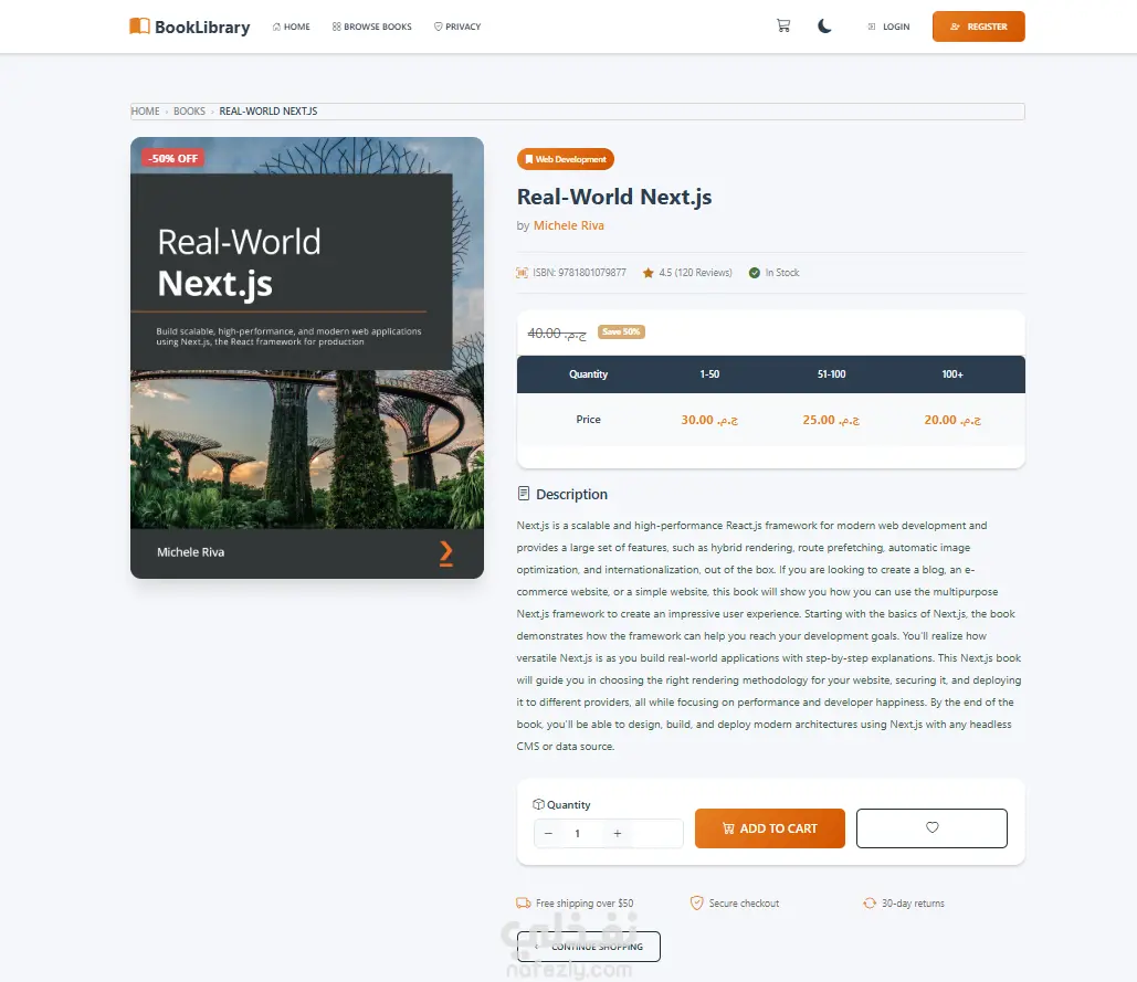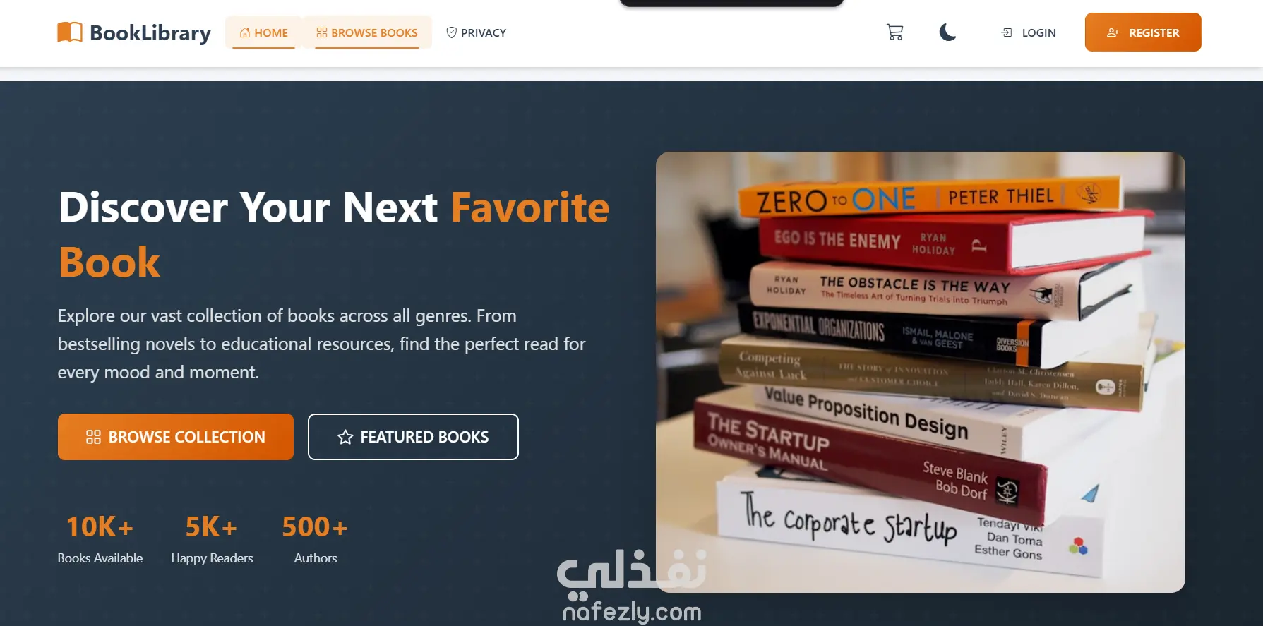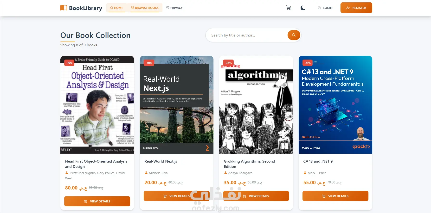 موقع إلكتروني Full Stack لبيع الكتب تم تنفيذه مسبقًا، يوفّر تجربة متكاملة للمستخدمين من تصفح الكتب حتى إدارة الطلبات.