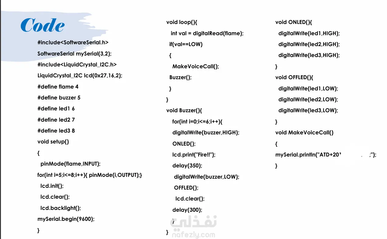 نظام إنذار حرائق ذكي ومحمول (Portable GSM Fire Alarm System) قمت بتصميم وتطوير نموذج أولي (Prototype) لنظام أمان متكامل للكشف عن الحرائق، يعمل بشكل مستقل تماماً عن شبكة الكهرباء، ويوفر مراقبة لحظية وتنبيهات فورية عبر الهاتف. تفاصيل النظام التقنية: وحدة المعالجة: Arduino Uno. نظام الاتصال: وحدة GSM لإجراء مكالمات طوارئ فورية عند اكتشاف الحريق. واجهة المستخدم: شاشة LCD تعرض حالة النظام وتظهر رسائل تحذيرية عند الخطر. إدارة الطاقة: يعتمد النظام على بطاريات ليثيوم (18650 Li-ion) مع دائرة تنظيم جهد (DC-DC Converter) لضمان استقرار العمل كجهاز محمول ومستقل (Portable Device). المستشعرات: حساس لهب (Flame Sensor) عالي الدقة. التنبيه: سرينة صوتية (Buzzer) + مؤشرات ضوئية (LEDs). سيناريو العمل: عند استشعار اللهب، يقوم النظام بتفعيل الإنذار الصوتي والمرئي، وبالتوازي يقوم بالاتصال برقم الطوارئ المسجل، مما يضمن سرعة الاستجابة حتى في حال عدم وجود أحد في الموقع.
