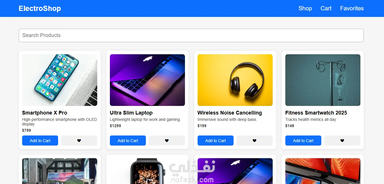 إلكتروشوب (ElectroShop) هو تطبيق ويب للتجارة الإلكترونية تم تصميمه وتطويره بالكامل باستخدام تقنيات الويب الحديثة مثل Vanilla JavaScript وHTML5 وCSS3 دون الاعتماد على مكتبات خارجية ثقيلة، مما يضمن أداءً سريعًا وتجربة مستخدم سلسة.