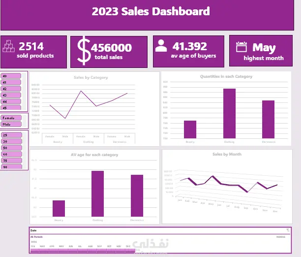 قمت بتصميم Dashboard تفاعلية لتحليل مبيعات عام 2023 تهدف إلى مساعدة أصحاب القرار على فهم أداء المبيعات وسلوك العملاء بشكل بصري وسهل. اللوحة تعرض نظرة شاملة على البيانات من خلال مؤشرات رئيسية ورسوم بيانية تساعد على: تتبع إجمالي المبيعات وعدد المنتجات المباعة تحليل المبيعات حسب الفئة (Beauty – Clothing – Electronics) مقارنة الكميات المباعة بين الفئات المختلفة تحليل المبيعات شهريًا وتحديد أعلى شهر مبيعات عرض متوسط أعمار العملاء وتأثيرها على الشراء الأدوات المستخدمة Microsoft Excel (power query- pivot table) تصميم Dashboard احترافية Data Visualization Charts & KPIs تحليل البيانات وتنظيمها مميزات العمل تصميم واضح وسهل القراءة ألوان متناسقة وهوية بصرية موحدة مناسب للعروض التقديمية واتخاذ القرار قابل للتطوير وإضافة فلاتر أو بيانات جديدة