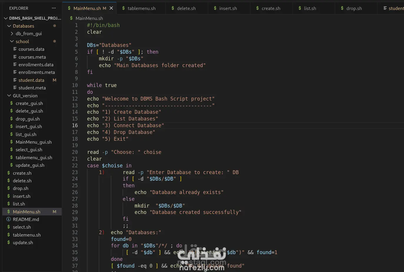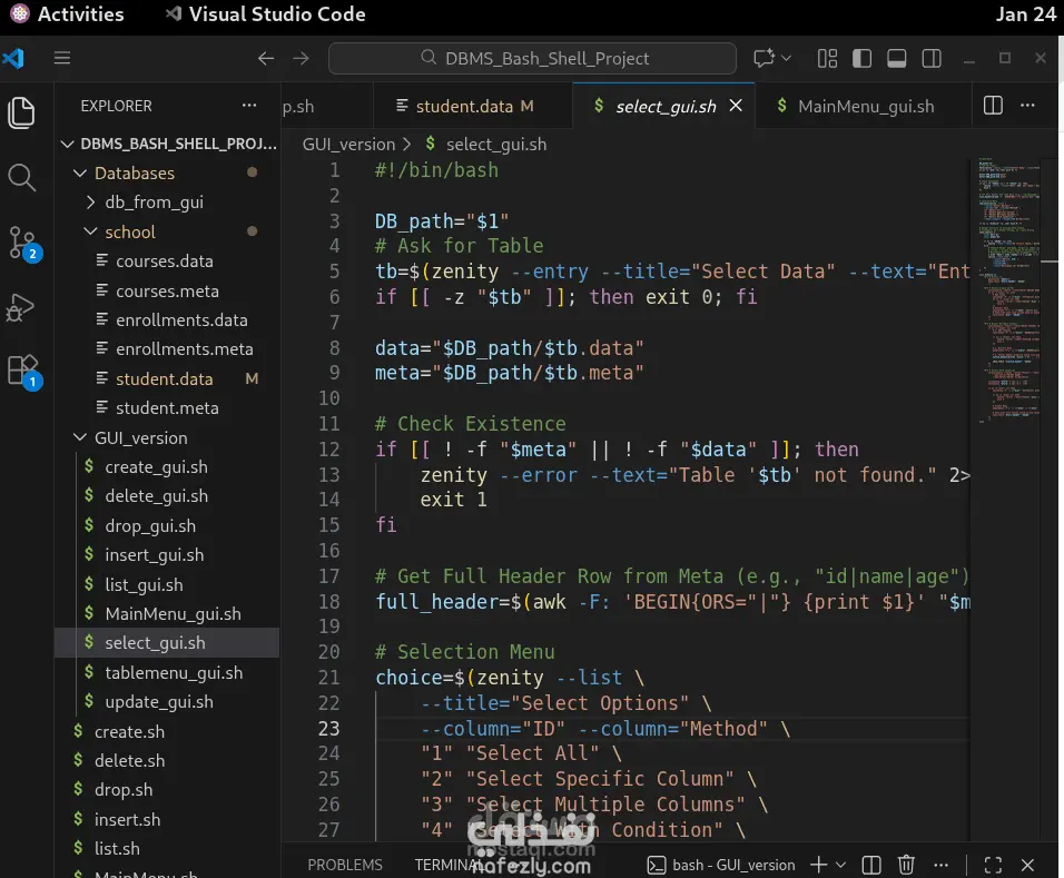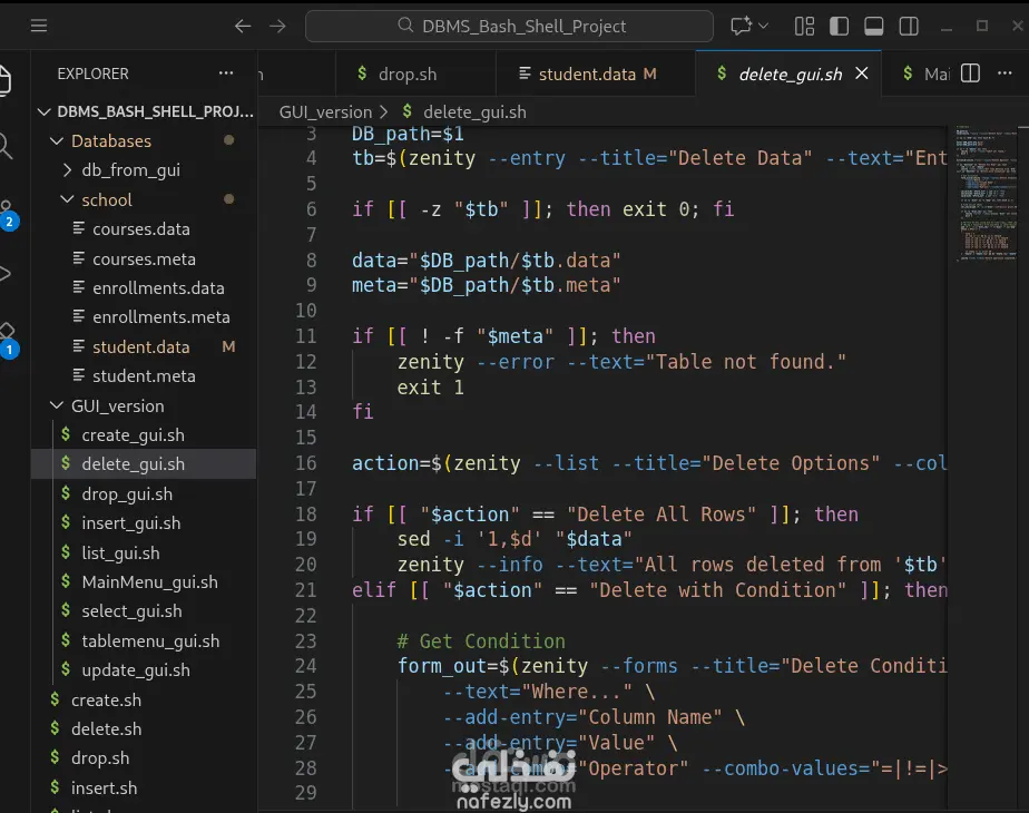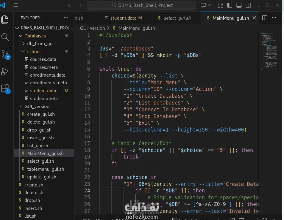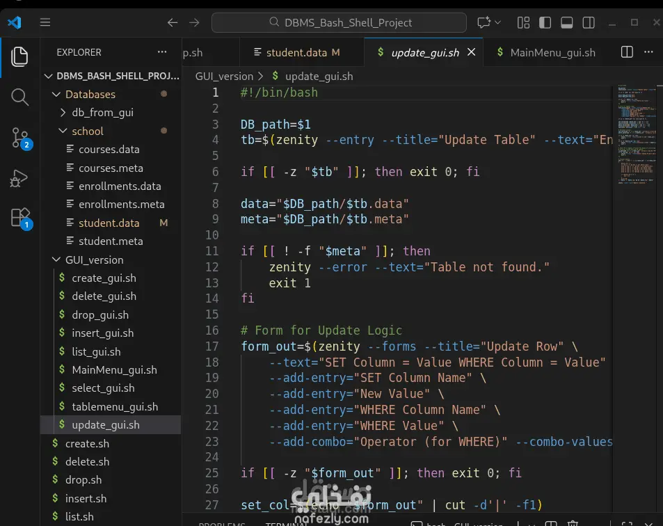 مشروع DBMS Bash Script هو نظام إدارة بيانات مبسط تم تطويره باستخدام Bash scripting على Linux، ويهدف لتسهيل التعامل مع قواعد البيانات الصغيرة دون الحاجة لأي برامج خارجية. النسخ المتوفرة: - CLI (Command Line Interface) - GUI بسيطة داخل الـ Terminal كلا النسختين توفران قوائم تفاعلية تمكن المستخدم من إدارة قواعد البيانات والجداول بشكل سهل، باستخدام أوامر تظهر كخيارات داخل الـ Terminal، مثل: - Create Table - List Tables - Drop Table - Insert Into Table - Select From Table - Delete From Table - Update Table المهام التي نفذت في المشروع: - تطوير سكربت متكامل لإنشاء وإدارة قواعد البيانات والجداول باستخدام ملفات نصية (.data و .meta) - تنفيذ جميع العمليات الأساسية: إنشاء الجداول، إدخال البيانات، تعديلها، حذف السجلات، واستعراض البيانات - تنظيم الكود باستخدام Functions لتسهيل الصيانة وإضافة ميزات جديدة مستقبلاً - تصميم واجهة تفاعلية سلسة في CLI و GUI لتسهيل استخدام السكربت دون الحاجة لكتابة أوامر معقدة - توثيق شامل لكيفية تشغيل السكربت واستخدام جميع ميزاته خطوة بخطوة التقنيات المستخدمة: - Bash scripting على Linux - إدارة البيانات باستخدام ملفات نصية - تصميم واجهة مستخدم تفاعلية داخل الـ Terminal القيمة التي أضافها المشروع: - تجربة عملية لتطبيق مبادئ DBMS الأساسية باستخدام أدوات بسيطة - تعلم كيفية تصميم قوائم تفاعلية وواجهات GUI بسيطة في Terminal - حل عملي لإدارة البيانات الصغيرة بسهولة وبدون برامج خارجية