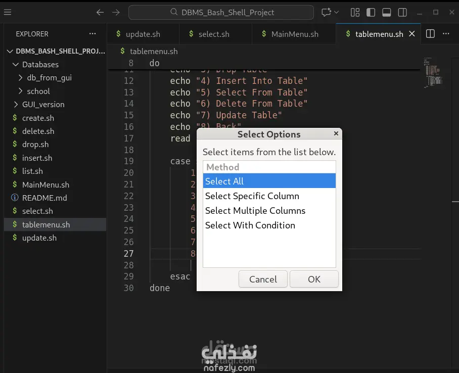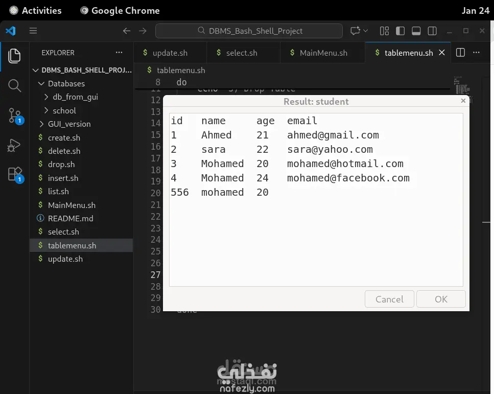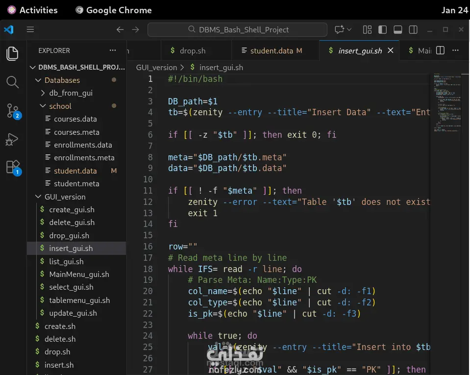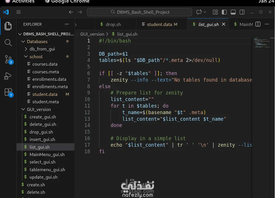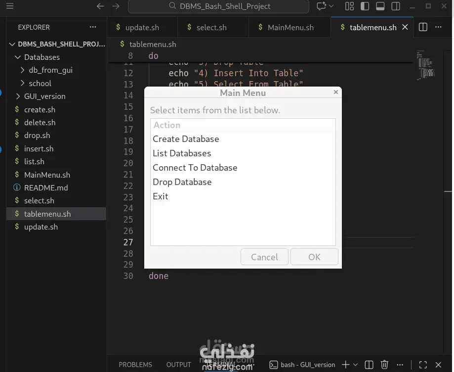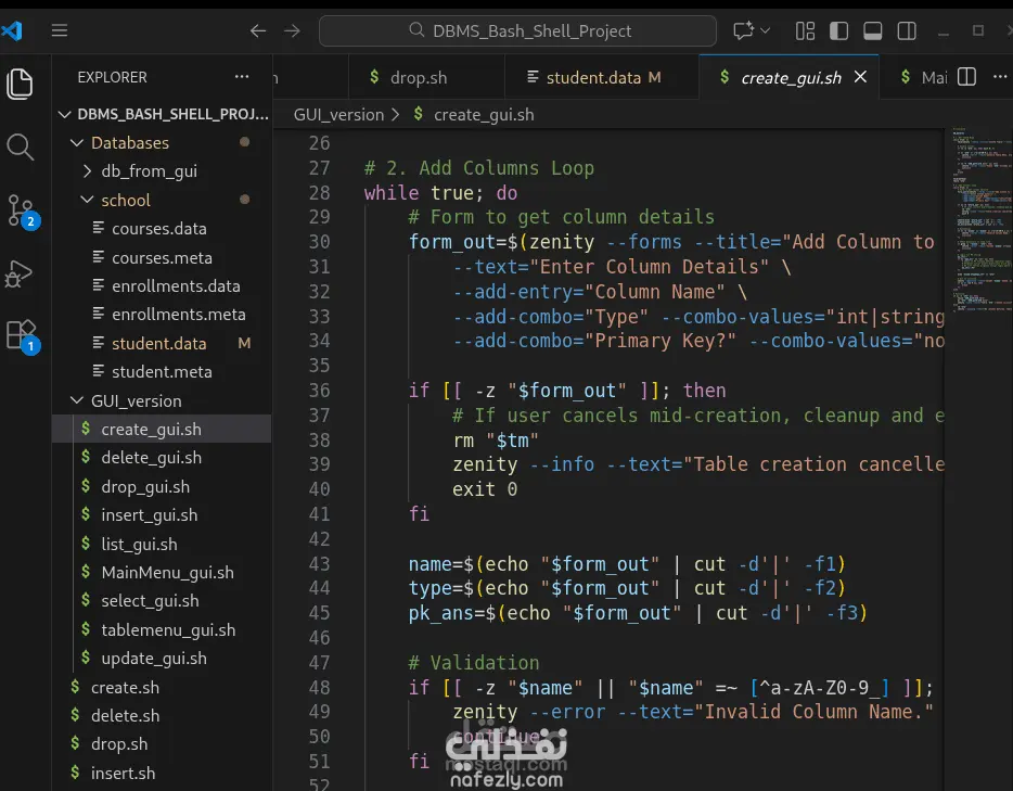 مشروع DBMS Bash Script هو نظام إدارة بيانات مبسط تم تطويره باستخدام Bash scripting على Linux، ويهدف لتسهيل التعامل مع قواعد البيانات الصغيرة دون الحاجة لأي برامج خارجية. النسخ المتوفرة: - CLI (Command Line Interface) - GUI بسيطة داخل الـ Terminal كلا النسختين توفران قوائم تفاعلية تمكن المستخدم من إدارة قواعد البيانات والجداول بشكل سهل، باستخدام أوامر تظهر كخيارات داخل الـ Terminal، مثل: - Create Table - List Tables - Drop Table - Insert Into Table - Select From Table - Delete From Table - Update Table المهام التي نفذت في المشروع: - تطوير سكربت متكامل لإنشاء وإدارة قواعد البيانات والجداول باستخدام ملفات نصية (.data و .meta) - تنفيذ جميع العمليات الأساسية: إنشاء الجداول، إدخال البيانات، تعديلها، حذف السجلات، واستعراض البيانات - تنظيم الكود باستخدام Functions لتسهيل الصيانة وإضافة ميزات جديدة مستقبلاً - تصميم واجهة تفاعلية سلسة في CLI و GUI لتسهيل استخدام السكربت دون الحاجة لكتابة أوامر معقدة - توثيق شامل لكيفية تشغيل السكربت واستخدام جميع ميزاته خطوة بخطوة التقنيات المستخدمة: - Bash scripting على Linux - إدارة البيانات باستخدام ملفات نصية - تصميم واجهة مستخدم تفاعلية داخل الـ Terminal القيمة التي أضافها المشروع: - تجربة عملية لتطبيق مبادئ DBMS الأساسية باستخدام أدوات بسيطة - تعلم كيفية تصميم قوائم تفاعلية وواجهات GUI بسيطة في Terminal - حل عملي لإدارة البيانات الصغيرة بسهولة وبدون برامج خارجية