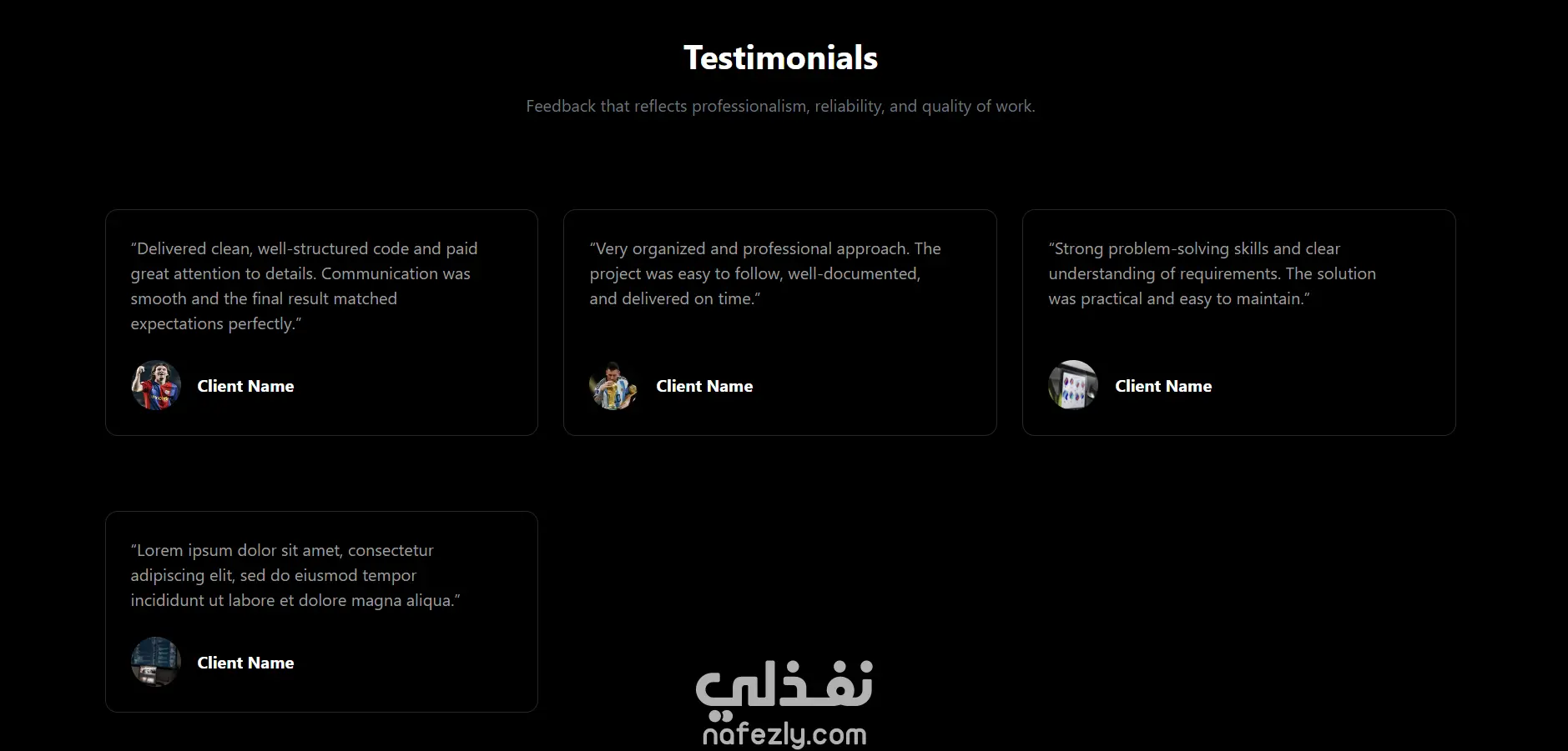 خدمة تصميم وتطوير Portfolio شخصي احترافي لعرض المشاريع، المهارات، والخبرة بشكل منظم وجذاب الموقع مصمم ليعكس الهوية الشخصية ويبرز نقاط القوة التقنية، ويشمل: صفحة تعريف شخصية (Hero Section) لعرض المهارات والتقنيات المستخدمة قسم (Case Studies) لشرح طريقة التفكير وحل المشكلات قسم (Recent Work) لعرض المشاريع الحديثة قسم (Testimonials) لعرض اراء العملاء صفحة تواصل (Contact Form) تصميم Responsive يعمل بكفاءة على جميع الشاشات تم تنفيذ البورتفوليو باستخدام تصميم نظيف، ألوان متناسقة، وتجربة مستخدم بسيطة، مع التركيز على الوضوح وسهولة التصفح، ليكون مناسبًا للاستخدام على منصات الفريلانس أو التقديم على فرص عمل. يمكن تخصيص التصميم والمحتوى بالكامل حسب احتياج العميل (الألوان، الأقسام، النصوص، المشاريع) مميزات الخدمة: تصميم عصري واحترافي Responsive Design (موبايل – تابلت – ديسكتوب) كود منظم وسهل التعديل مناسب للفريلانس والتوظيف إمكانية إضافة أو حذف أي قسم
