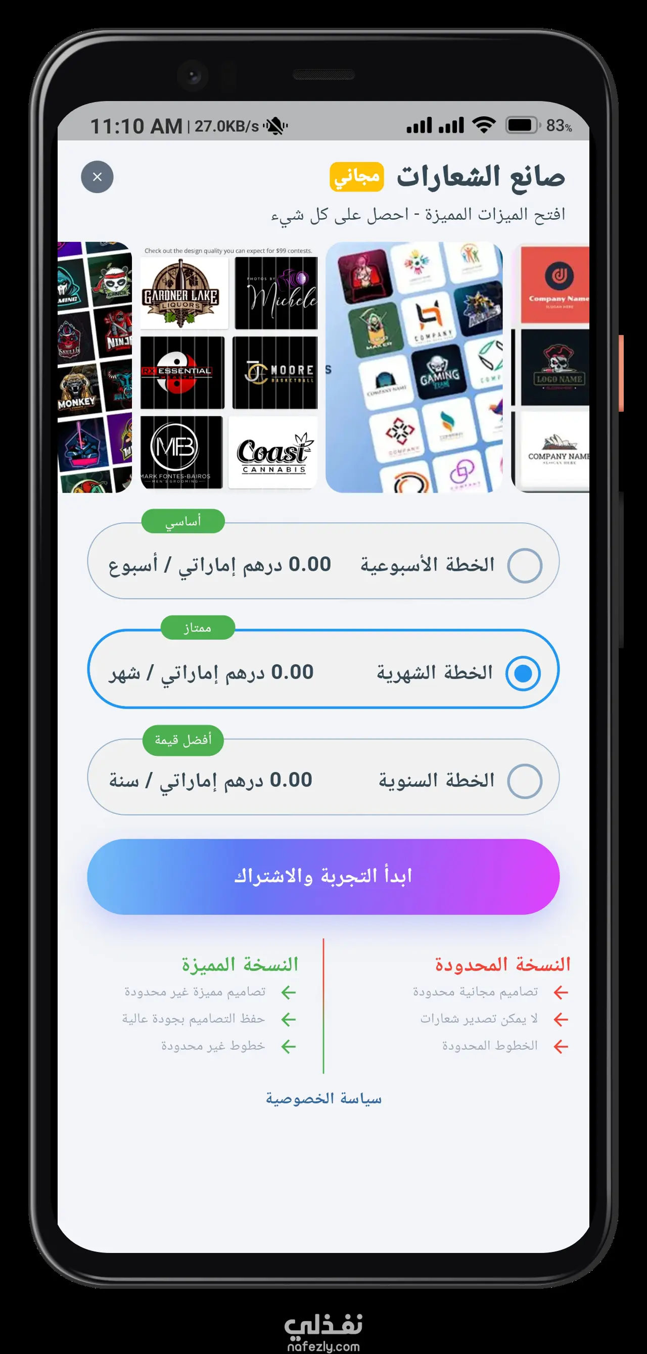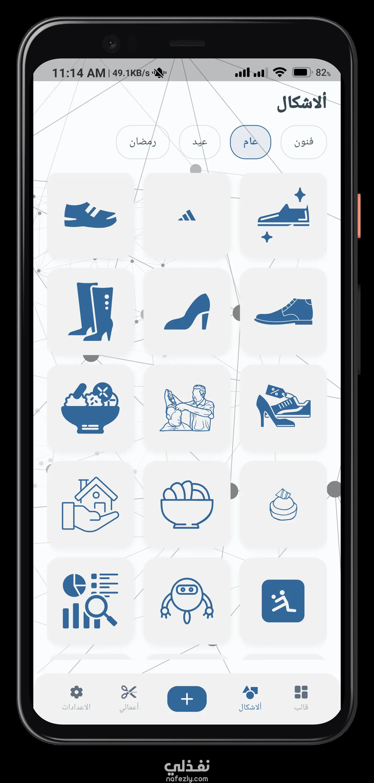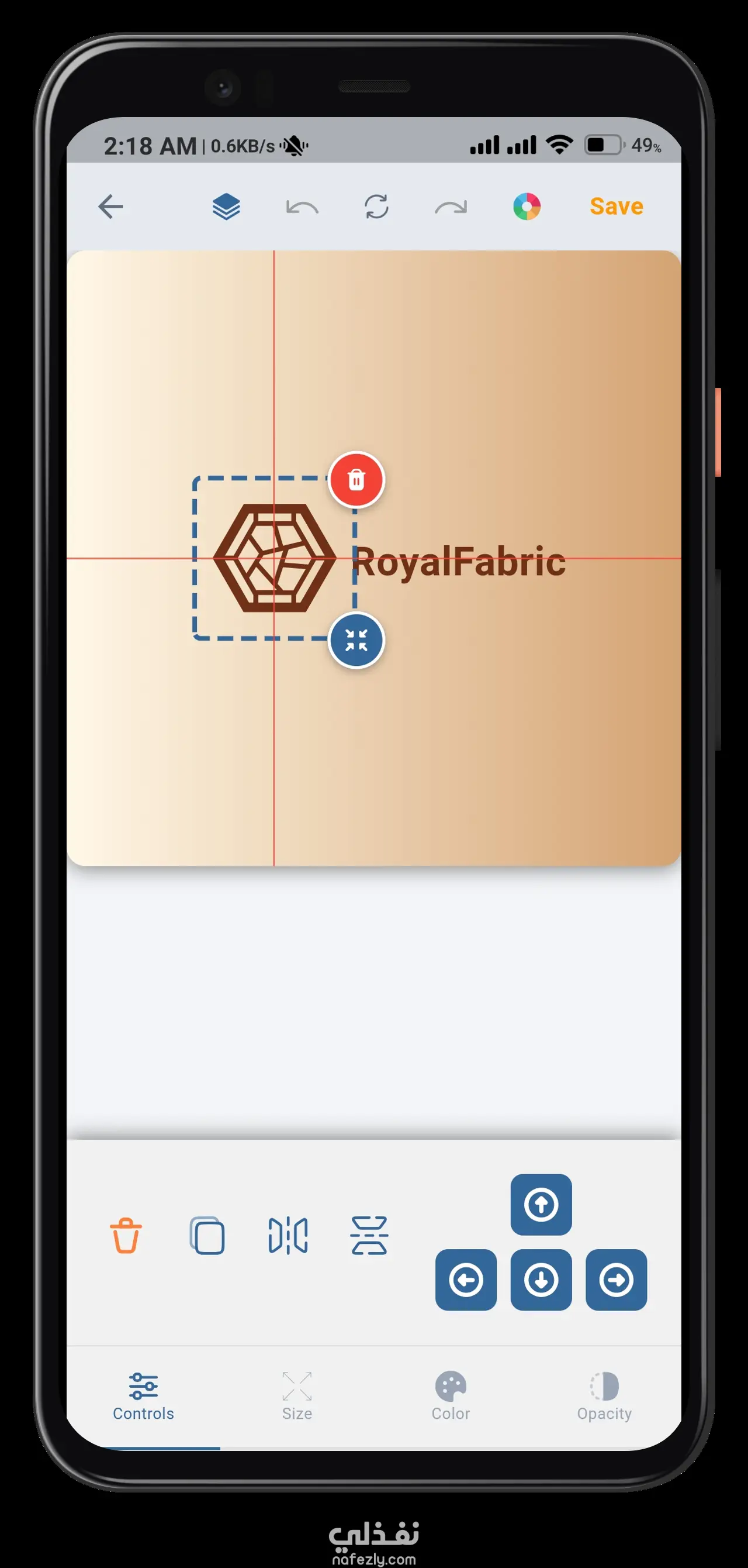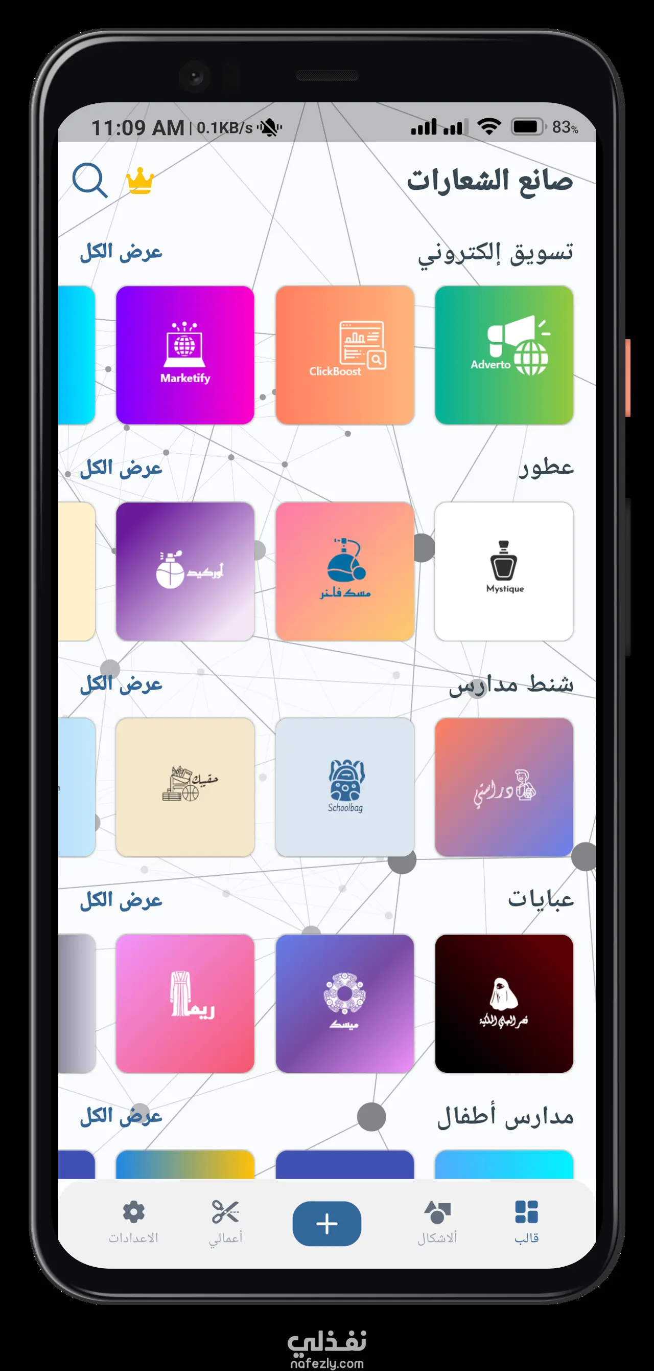 - تحكم متقدم بالشعارات: القياس، التدوير، النسخ، الحذف، الشفافية، مسافات الحروف، الألوان، التدرجات، الخطوط.
