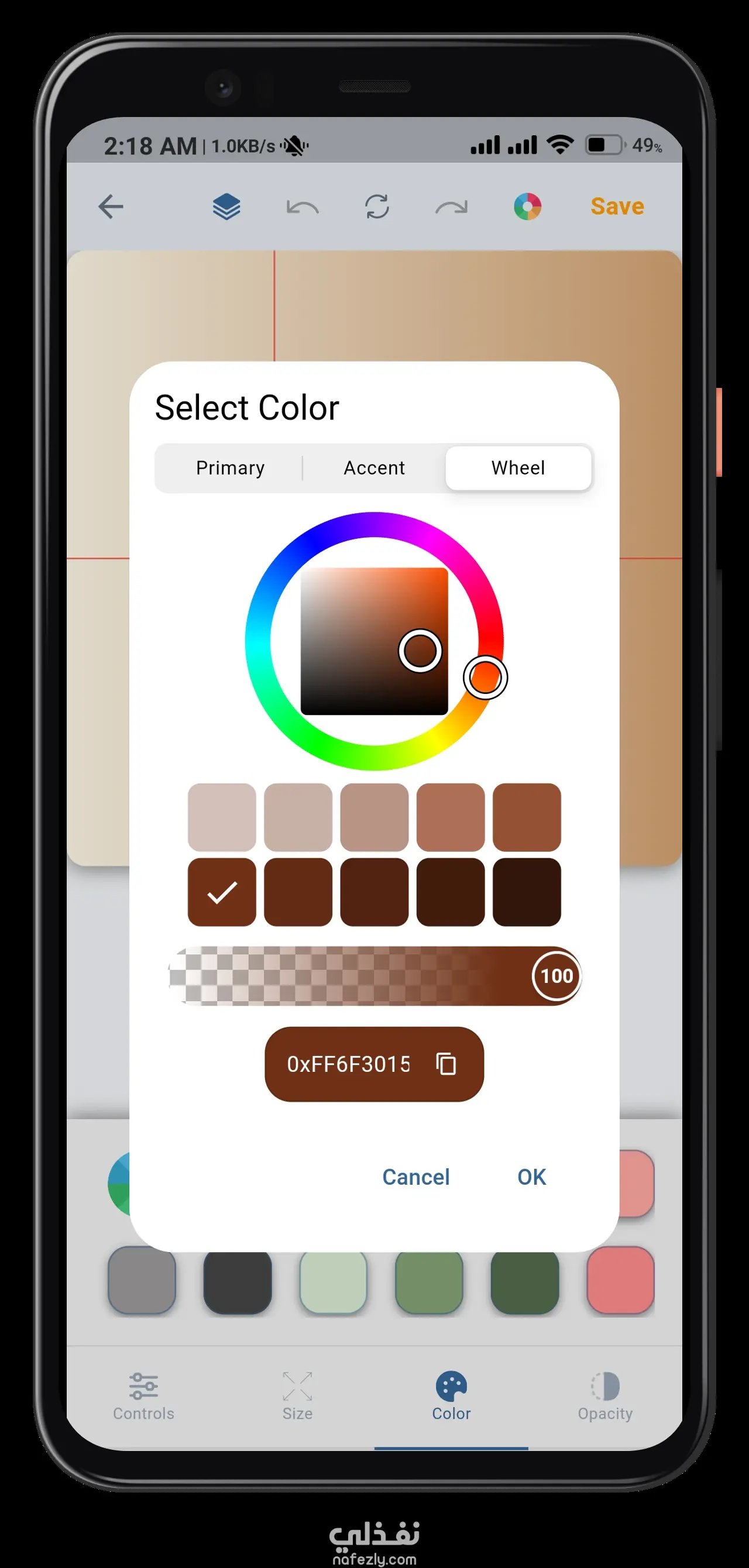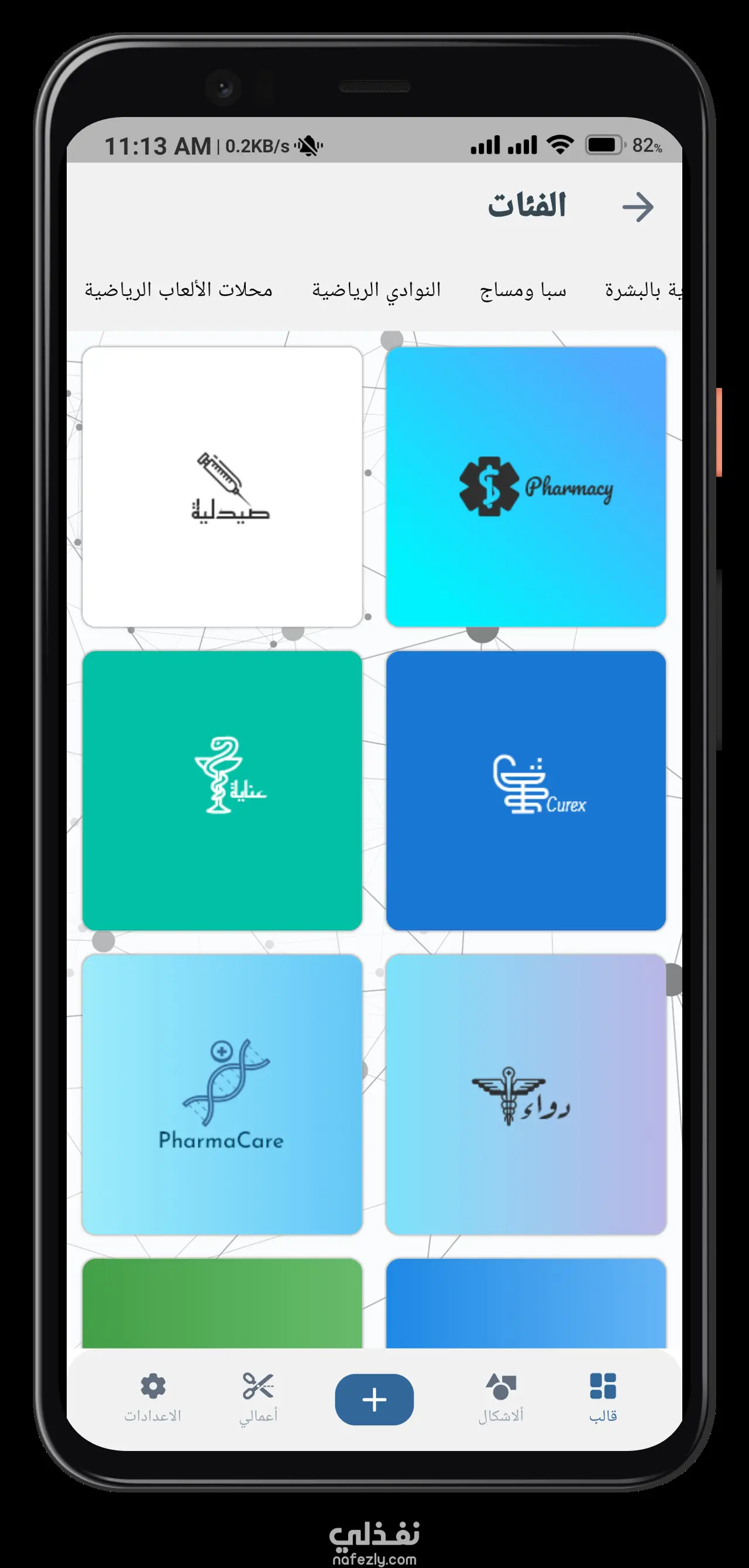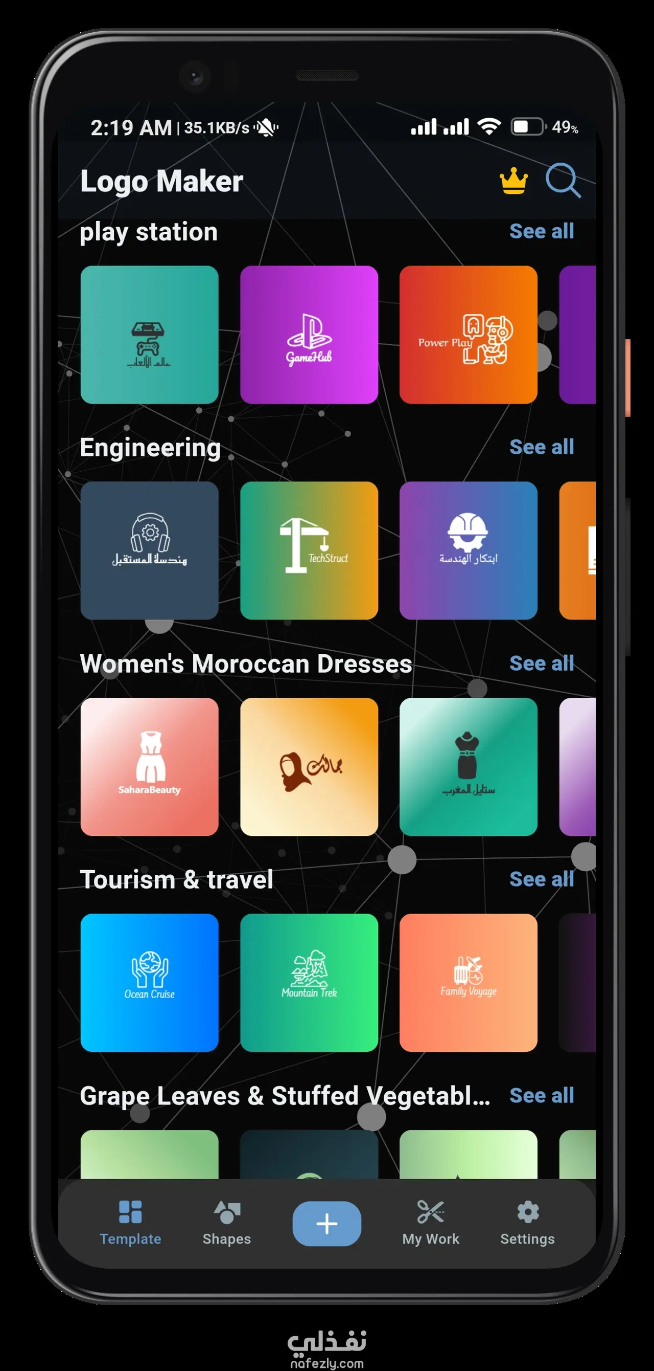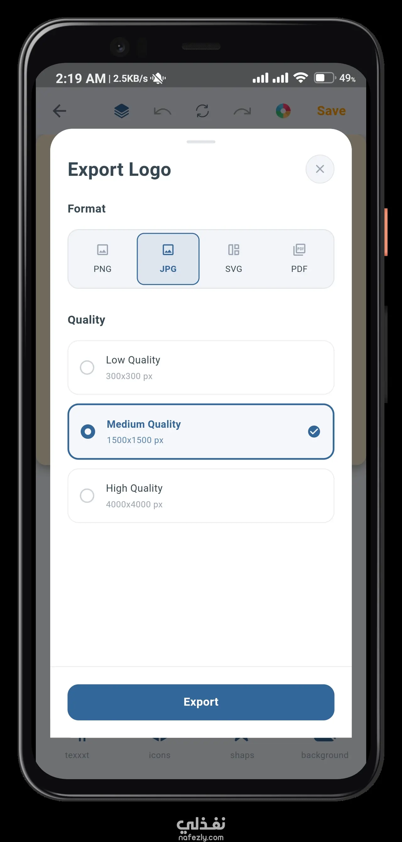 - تحكم متقدم بالشعارات: القياس، التدوير، النسخ، الحذف، الشفافية، مسافات الحروف، الألوان، التدرجات، الخطوط.